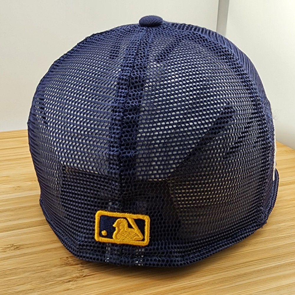 Show your support for the Milwaukee Brewers with this navy blue fitted baseball hat from New Era. Featuring the team's logo and a trucker style, this cap is perfect for any fan of the MLB. Made for size 7, it is a great addition to any collection of fan apparel and souvenirs. Whether you're heading to Spring Training or just want to show off your team spirit, this hat is a must-have for any Brewers fan.