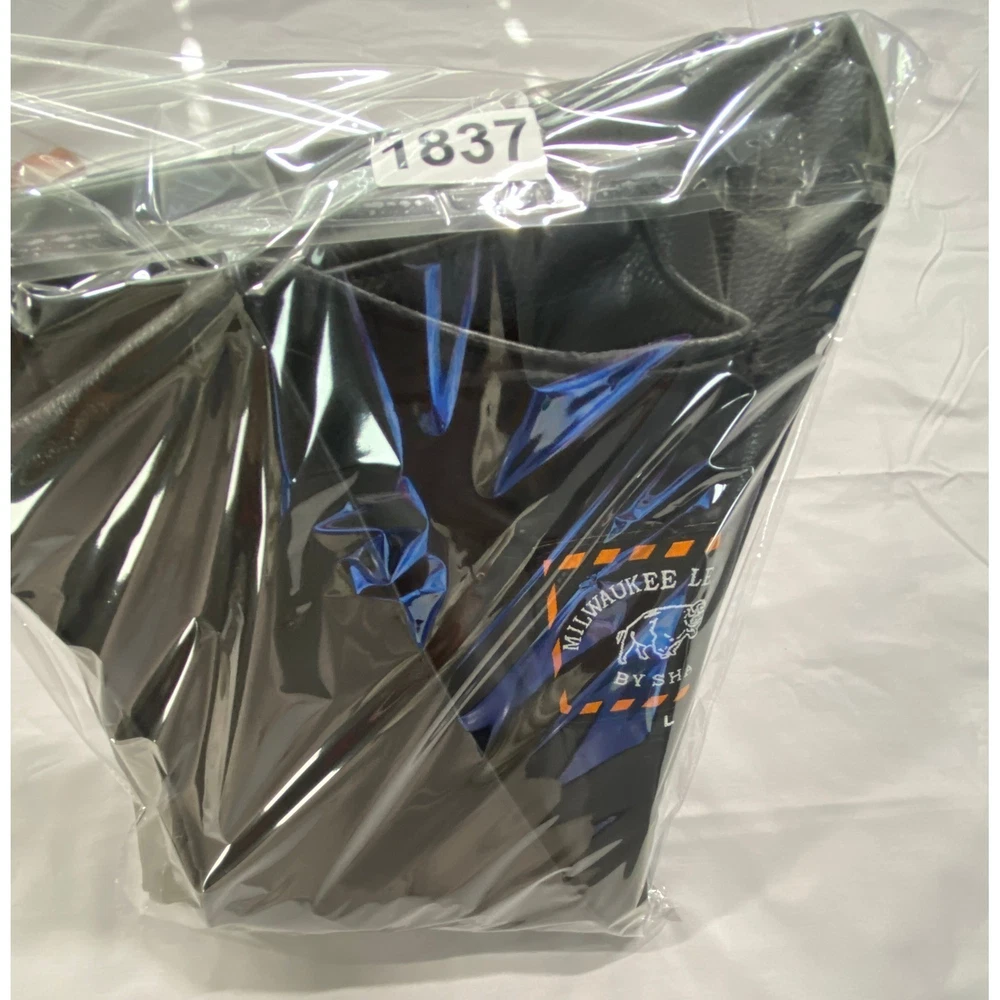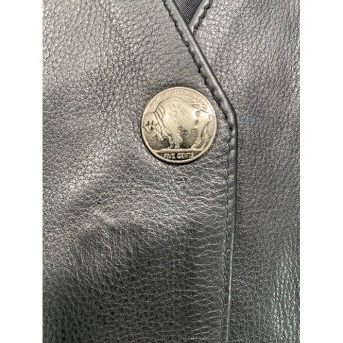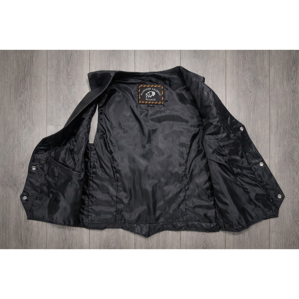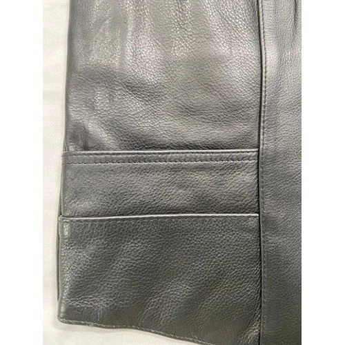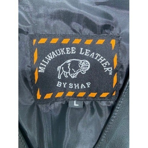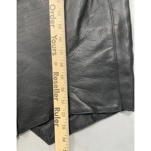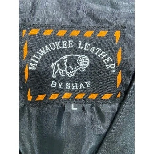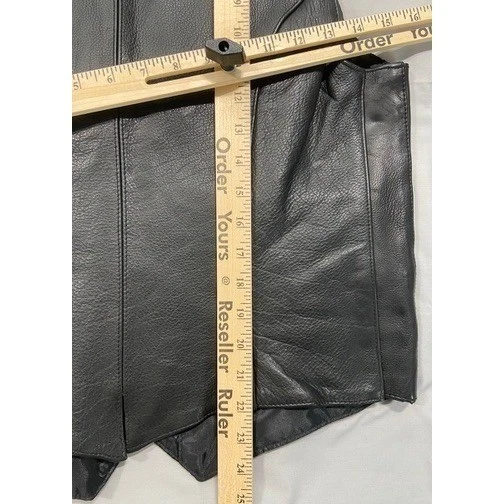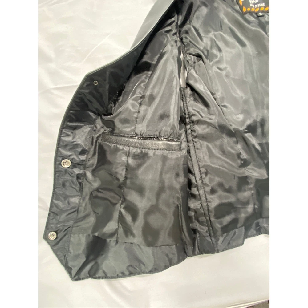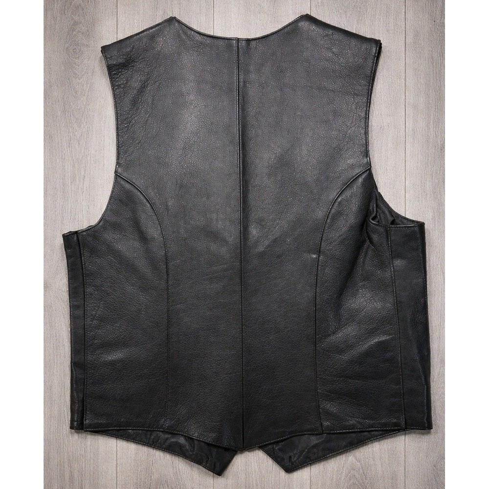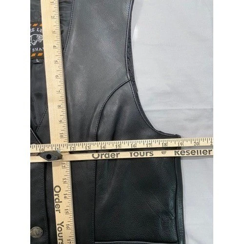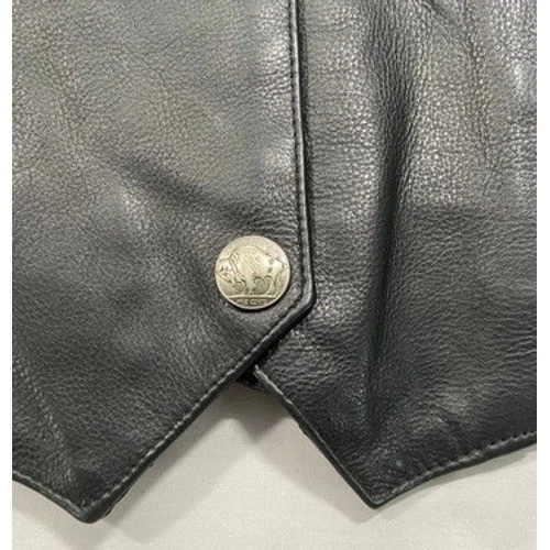 Milwaukee Leather by Shaf motorcycle vest crafted from premium black leather with a smooth satin-like lining. This classic biker piece features a V-neckline and a three-button front closure accented with unique buffalo nickel-style hardware. The front is designed with two horizontal welt pockets, while the interior includes a dedicated pocket for secure storage. Seam detailing on the back provides a structured, contoured fit suitable for riding or casual wear. Brand: Milwaukee Leather by Shaf Material: Leather Color: Black Closure: Button Front Hardware: Buffalo Nickel Snaps Pockets: 2 Front Welt, 1 Interior Lining: Fully Lined Neckline: V-Neck Style: Biker / Motorcycle Fit: Regular Measurements: • Length: 22" Keywords: Biker, Motorcycle, Riding Gear, Buffalo Nickel, Western, Rocker, Leather Vest, Moto, Americana, Gorpcore, Streetwear, Classic, Rugged, Outlaw, Vintage Style Fast 1 day Shipping
