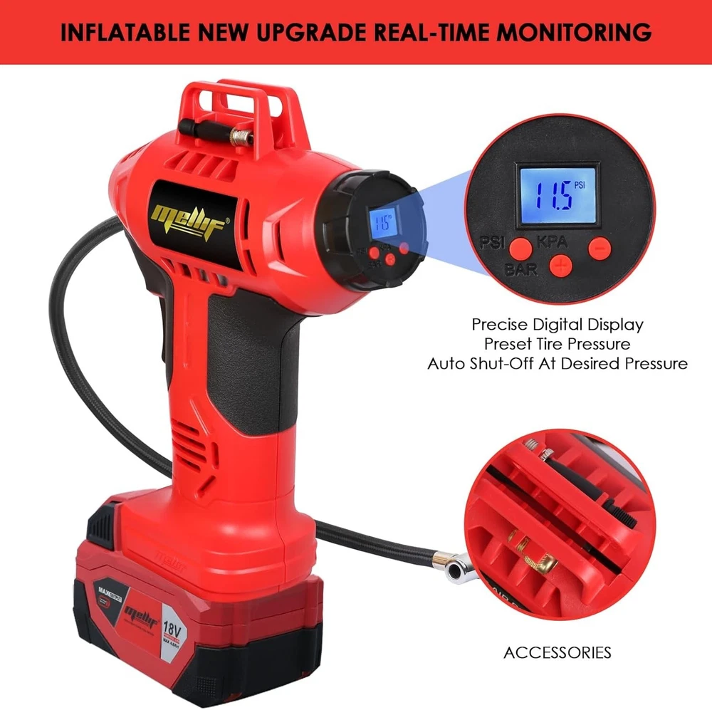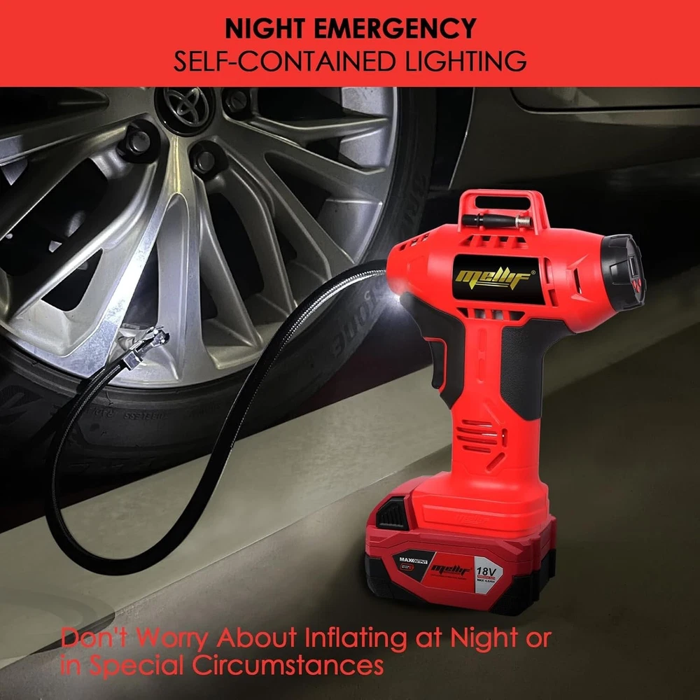 Cordless Tire Inflator Air Compressor Compatible with Milwaukee 18V Battery, 160PSI Portable Handheld Air Pump with Digital Pressure Gauge for Cars Motorcycles Bikes Sport Balls(Tool Only) About this item : Cordless tire inflator: This tire inflator is powered by a battery(Battery and Charger NOT Included), perfect for both home and professional use Automatic Shut Off: Preset the desired pressure level and start inflating job. This car air compressor will shut off automatically at the desired level. There is no need to worry about over inflating, the accuracy of the indicated pressure is +/- 1 PSI Intelligent Display: Easy to read digital gauge provides accurate digital display. LCD screen will display the preset tire pressure value the air compressor will automatically shut off when the value is reached. The unit of air pressure can be switched among bar, kPa and PSI Metal Cylinder & Led Light: This cordless tire inflator is built with metal cylinders and gears. It can continuously work for 20 minutes and compress up to 160 PSI. This efficient compressor can quickly and easily inflate 4 tires. The LED work light allows you to inflate in the dark Durable & Lightweight: This electric tire inflator is made with wear-resistant nylon braided inflatable tube, anti-freeze not break, explosion-proof and high temperature resistant. Cordless design convenience for use almost anywhere Wide Application: This portable tire pump is equipped with the tapered adapter, valve extender, inflation needle, suitable for SUVs, cars, motorcycles, bicycles, sport balls and inflatable pool toys, etc. Note: It's not suitable for large truck tires