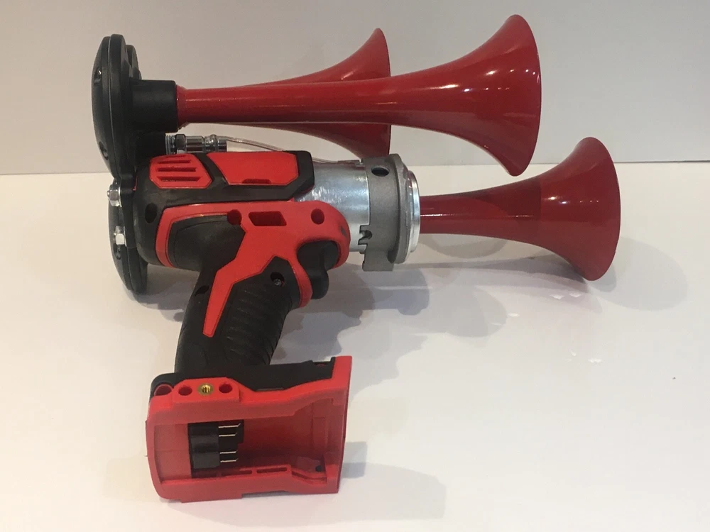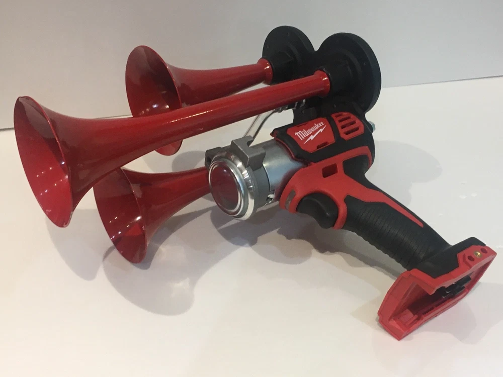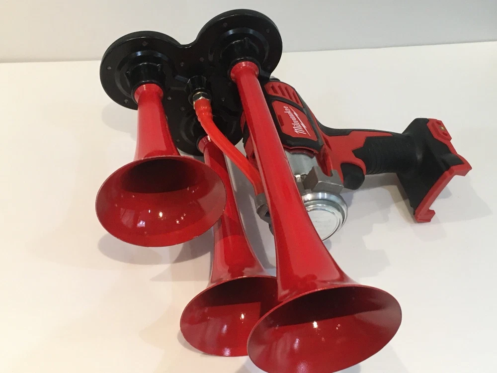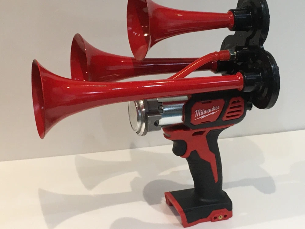 Milwaukee M18 Cordless Handheld and Very Loud ,Variable Tone, Air Horn - Train Horn. Comes w/Billet Finish Compressor & 3 Red Trumpets, Longes One is 11 Inches . Excellent Balanced Horn w/Stainless Steel Mounting Hardware and Working LED Light. May Include Clear, Red or Black Air Hose > Preferred hose color can be noted on checkout < Battery Not Included ! Trumpets may be RemovedUnscrewed) for Easier Siping & Handeling ! Compatible w/All M18 Batteries. In Mint Condition. Fast Shipping. Thanks for Your interest and God bless.