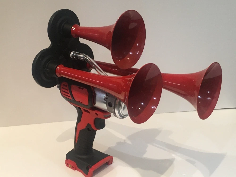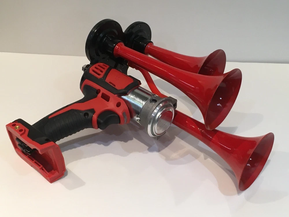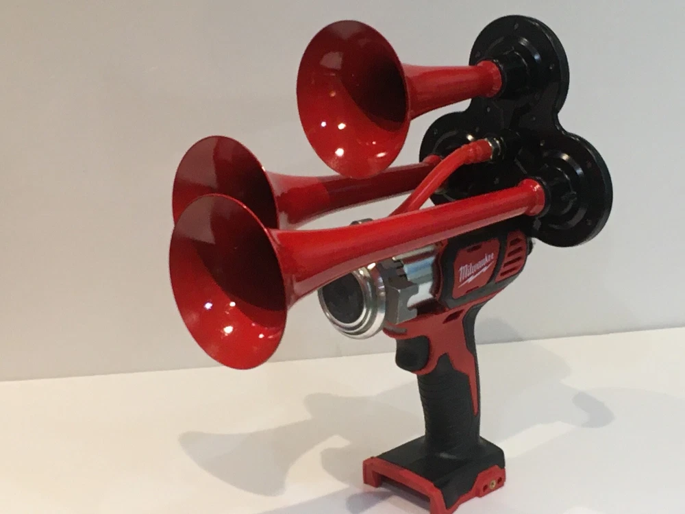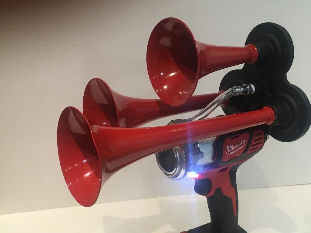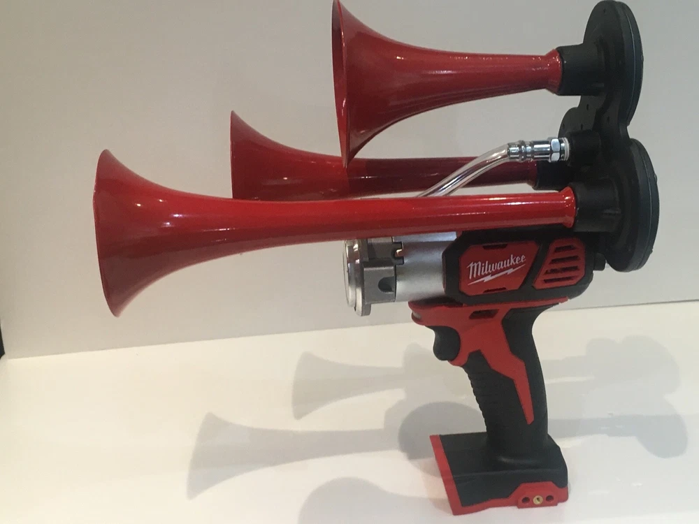 Milwaukee M18 Cordless Handheld and Very Loud ,Variable Tone, Air Horn - Train Horn. Comes w/Billet Finish Compressor & 3 Red Trumpets, Longes One is 11 Inches . Excellent Balanced Horn w/Stainless Steel Mounting Hardware and Working LED Light. May Include Clear, Red or Black Air Hose > Preferred hose color can be noted on checkout < Battery Not Included ! Trumpets may be RemovedUnscrewed) for Easier Siping & Handeling ! Compatible w/All M18 Batteries. In Mint Condition. Fast Shipping. Thanks for Your interest and God bless.