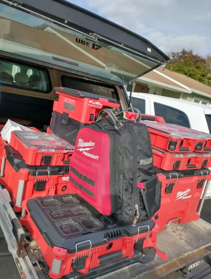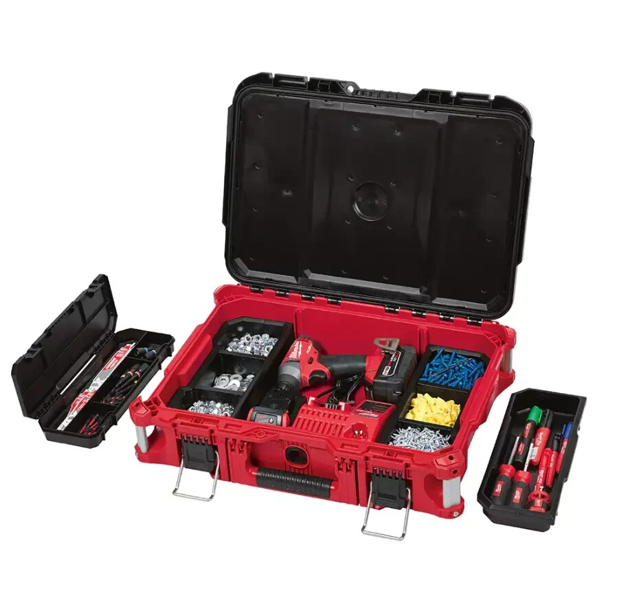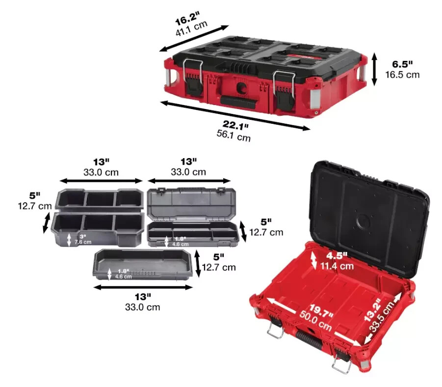 Milwaukee 48-22-8424 PACKOUT 22 in, 75 Pound. Medium Tool Box Black/Red- New About This Product The PACKOUT modular storage system is the industry's most durable and versatile storage system. The PACKOUT tool box is constructed with impact resistant polymers and metal reinforced corners so it can withstand harsh jobsite environments. The tool storage box connects with all other PACKOUT system components via integrated locking cleats and features a 75 lbs. of weight capacity. An IP65 rated weather seal protects tools and accessories from rain and other jobsite debris. Interior organizer trays allow users to keep equipment organized to fit their needs. A carry handle and reinforced hinges ensure the tool box is easily transportable wherever it is needed. The PACKOUT modular storage allows users to customize and build their own storage system to easily transport and organize tools and accessories. Highlights - IP65 rated which means you can have peace of mind that your toolbox will protect your tools against low pressure water, like rain or small jobsite mishaps, as well as offering full protection against dust and other particles - Metal reinforced corners - Metal reinforced locking point - Interior organizer trays - Mounting location for the one-key tick - a Bluetooth tracking device for Packout products - Heavy-duty latches - Reinforced hinge Dimensions Maximum Handle Length (in.): 6 in Product Depth (in.): 16 in Product Height (in.): 6.5 in Product Width (in.): 22 in Details - Color Family: Red - Color/Finish: Red - Features: Lid Strike, Lockable, Padded Handle - Holding Capacity (cu in.): 1200 cu in - Included Accessories: No Additional Items Included - Material: Resin - Modular Storage Type: Medium Box - Modular System Type: Milwaukee Packout - Product Weight (lb.): 10.21 lb - Tool Box Type: Modular Tool Box - Tool Storage Product Type: Modular Tool Box - Tools Product Type: Tool Storage - Weight Capacity (lb.): 75