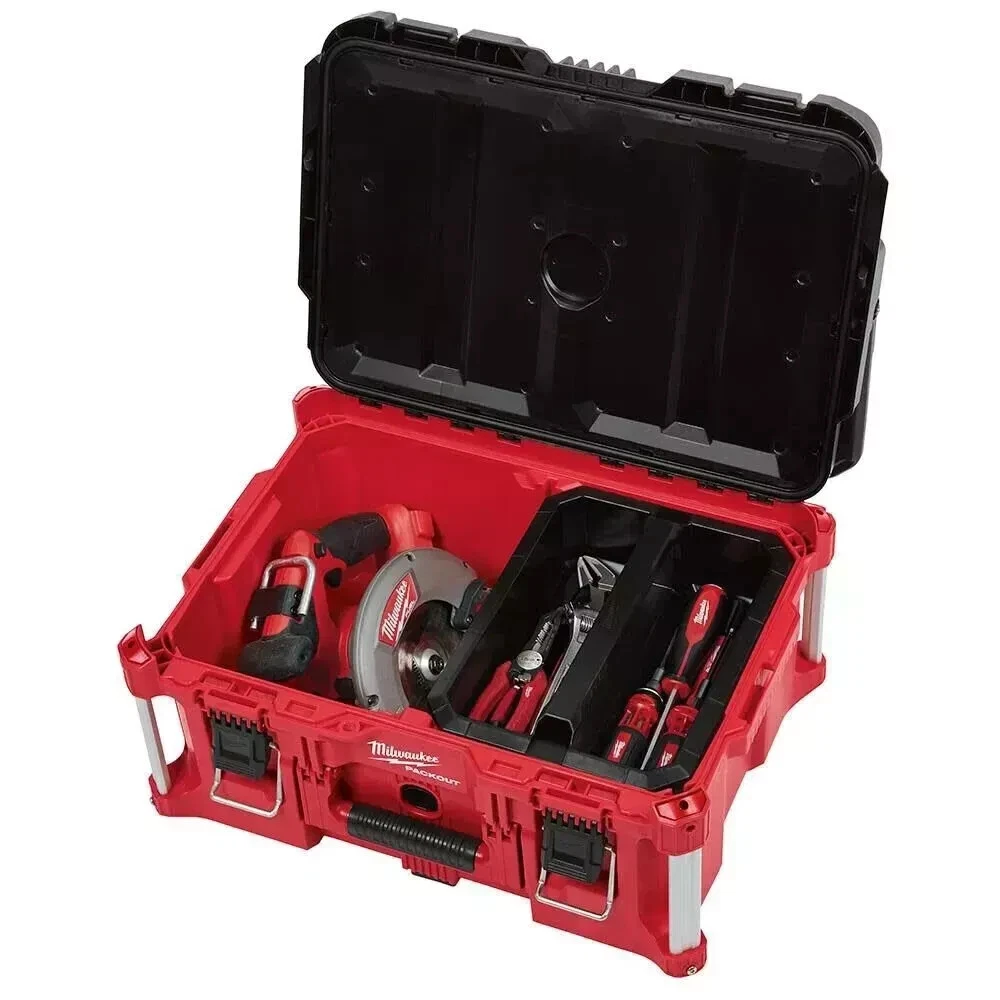 Milwaukee 48-22-8425 100-Pound Capacity Polymer Packout Large Tool Box- New About This Product The PACKOUT modular storage system is the industry's most durable and versatile storage system. The PACKOUT large tool box is constructed with impact resistant polymers and metal reinforced corners so it can withstand harsh jobsite environments. The tool storage box connects with all other PACKOUT system components via integrated locking cleats and features a 100 lbs. of weight capacity. An IP65 rated weather seal protects tools and accessories from rain and other jobsite debris. Interior organizer trays allow users to keep equipment organized to fit their needs. A carry handle and reinforced hinges ensure the large tool box is easily transportable wherever it is needed. The PACKOUT modular storage allows users to customize and build their own storage system to easily transport and organize tools and accessories. Highlights - IP65 rated which means you can have peace of mind that your toolbox will protect your tools against low pressure water, like rain or small jobsite mishaps, as well as offering full protection against dust and other particles - Metal reinforced top handle - Metal reinforced corners - Metal reinforced locking point - Interior organizer tray - Mounting location for the One-Key tick - a Bluetooth tracking device for Packout products - Heavy-duty latches - Reinforced hinge Dimensions Maximum Handle Length (in.): 22 in Product Depth (in.): 16 in Product Height (in.): 11 in Product Width (in.): 22 in Details - Color Family: Red - Color/Finish: Red - Features: Lid Strike, Lockable, No Additional Features, Padded Handle, Weatherproof - Holding Capacity (cu in.): 2235 cu in - Included Accessories: No Additional Items Included - Material: Resin - Modular Storage Type: Large Box - Modular System Type: Milwaukee Packout - Product Weight (lb.): 12.1 lb - Tool Box Type: Modular Tool Box - Tool Storage Product Type: Modular Tool Box - Tools Product Type: Tool Storage - Weight Capacity (lb.): 100 Ib