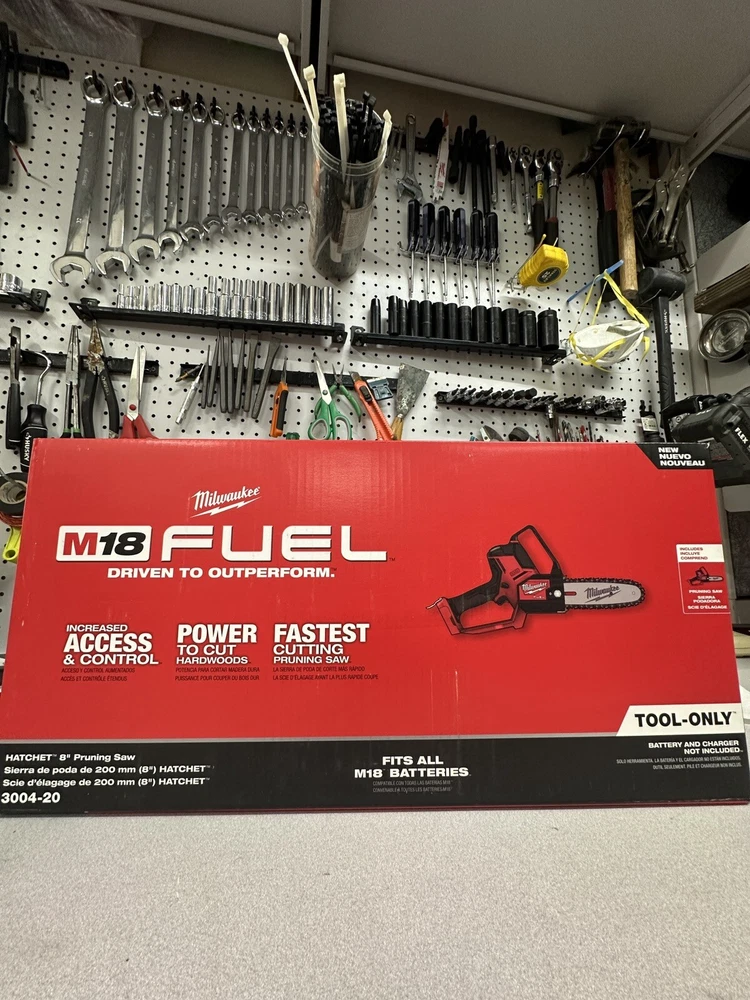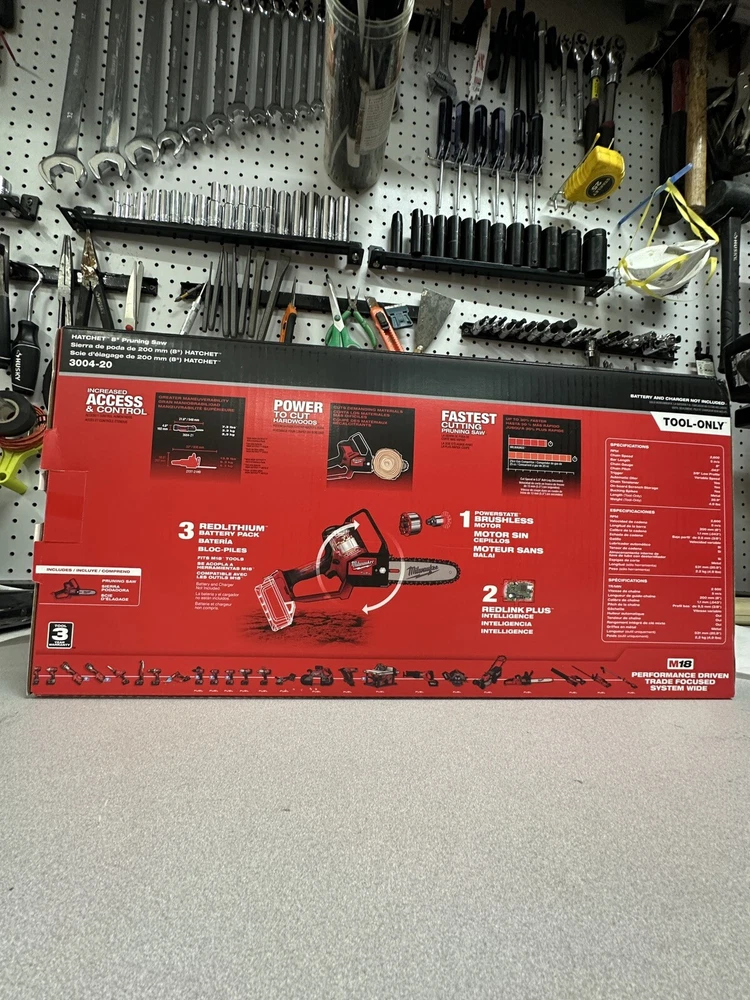 Milwaukee Pruning Chain Saw 8" 3004-20 FUEL Hatchet Brushless M18 NEW IN BOX. This chainsaw is a reliable tool for outdoor power equipment. It has a powerful 18V battery and comes with a saw chain accessory. The item is red in color and has a length of 8 inches. The brand is Milwaukee and it is a model M18. Tool only