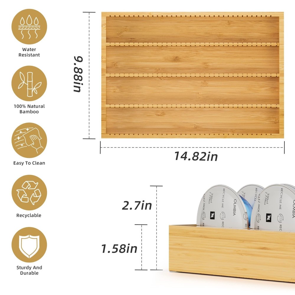 MinBoo Bamboo Coffee Pod Storage Holder Drawer Insert for Counter Compatible Nespresso Vertuo Vertuoline Capsules for Kitchen, Home, Office, Coffee Station Drawer Insert : nespresso vertuo pod holder Drawer Organizer Compatible with Nespresso Vertuo Vertuoline Capsules, According to different oz can hold different amount of Nespresso, it's a great nespresso pods holder. Simple and Stylish:Looks stylish enough to be displayed on a countertop and fits in many standard drawers, providing enough space to store and organize up to 14 oz capsules. This drawer organizer is perfect for home, office, kitchen, conference room, coffee station. It is a coffee station accessories that is very suitable for most decoration styles. Made of Natural Bamboo:Our coffee pod holder is made of bamboo, which is hard, durable, and easy to clean. It only needs to be wiped with a clean wet cloth, and has a long service life. Anti-slip bottom to protect your table top from scratches, ideal coffee bar essentials Perfect Size:14.82" x 9.88" x 1.58" Fits most cabinet drawers ,please make sure your drawer interior height is higher than 2.7in ensures effortless closure. MinBoo Brand After-sales Service:We promise a 100% refund! if there is any problem with our products. MinBoo is full of confidence in product quality. If there is any problem with the product quality or you think the MinBoo product is not suitable for you , We are happy to refund every penny you pay Please try to buy a MinBoo product. Shipping We offer FREE shipping on all orders! We ship within Three business days of payment, usually sooner. We use a selection of shipping services such as UPS, FedEx, USPS etc. We only ship to the lower 48 states, no APO/FPO addresses or PO Boxes allowed. Local pickups and combined shipping options are not provided at this time. Return You can return a product for up to 30 days from the date you purchased it ONLY if it's in the original condition. The product cannot be used or open. Any product you return must be in the exact same condition you received it and in the original packaging. Please keep the receipt. Feedback Customer satisfaction is very important to us. If you have any problem with your order, please contact us and we will do our best to make you satisfied. Contact Us If you have any queries, please contact us via ebay. We usually respond within 24 hours on weekdays. Please visit our eBay store to check out other items for sale! Thank you for shopping at our store.