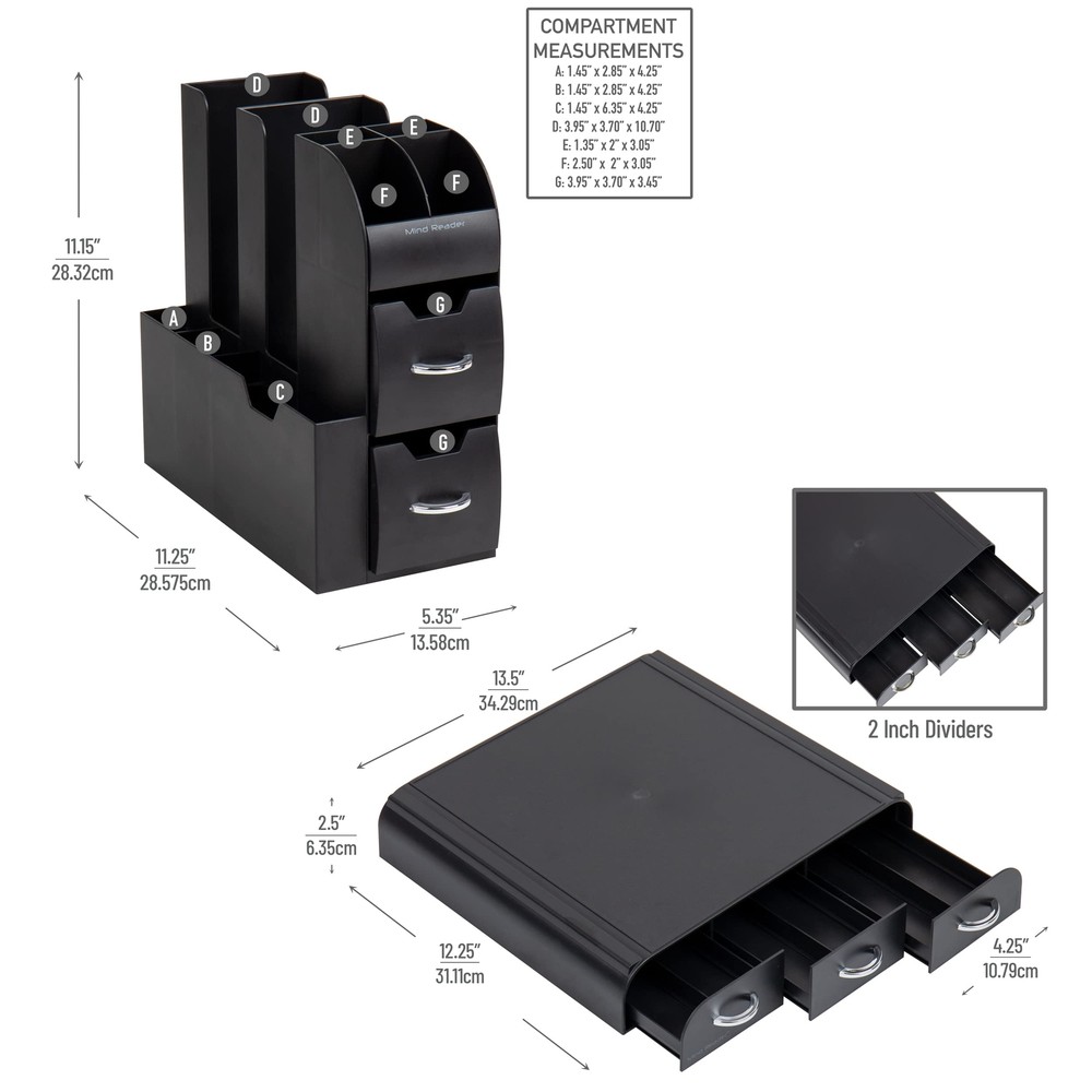 Mind Reader Single Serve Coffee Pod Drawer and Cup Condiment Set, 2 Pcs., 36 Pod Capacity, 5.35"L x 11.25"W x 11.15"H, Black Versatile Storage Solution: With a total of ten compartments and three drawers spread across two matching pieces, this set offers ample storage space to organize your coffee and condiments effectively Optimized Space Usage: The stackable design of the flat pod storage drawer provides a sturdy base for your coffee maker, while the slim tower organizer fits snugly on top, maximizing your counter space and creating an efficient setup Secure and Stable: Designed with a non-slip feature, both the drawer and condiment caddy stay securely in place during usage, preventing any accidental slips or spills Lightweight and Durable: Made from food-safe materials, this sleek set is lightweight, weighing only 1 pound (453 grams), making it easy to move and reposition as needed. Despite its lightweight design, it is built to withstand daily use Compact Dimensions: The pod drawer measures 13.5 inches long x 12.25 inches wide x 2.5 inches tall (34.29 x 31.11 x 6.35 centimeters), the condiment caddy is 5.35 inches long x 11.25 inches wide x 11.15 inches tall (13.59 x 28.57 x 28.32 centimeters) The K-Cup Combine brings together "The Anchor" and "The Organizer" in a convenient 2-piece system. Featuring a patent-pending, heat-resistant panel that allows you to place your coffee machine directly on top of the storage unit, The Anchor maximizes your counter space while minimizing your mess. The Organizer will hold all your serving essentials, including sugar, cups, stirrers and napkins. Forget the cheap wire mesh drawers with flimsy construction that eventually sag. This unit is built to last with attention to detail and superior materials. The patent-pending heat-resistant panel means you can safely place your coffee machine directly on top of the drawer without worrying that it will eventually sag or that the heat will compromise the coffee pods underneath. Anchor drawers can hold up to 36 K-Cups, 42 Verismo or CBTL single serve coffee pods. Organizer has 10 compartments that easily access all of your coffee needs. Clean and modern design perfect for home or office use. Chrome handles add a modern décor. Shipping We offer FREE shipping on all orders! We ship within Three business days of payment, usually sooner. We use a selection of shipping services such as UPS, FedEx, USPS etc. We only ship to the lower 48 states, no APO/FPO addresses or PO Boxes allowed. Local pickups and combined shipping options are not provided at this time. Return You can return a product for up to 30 days from the date you purchased it ONLY if it's in the original condition. The product cannot be used or open. Any product you return must be in the exact same condition you received it and in the original packaging. Please keep the receipt. Feedback Customer satisfaction is very important to us. If you have any problem with your order, please contact us and we will do our best to make you satisfied. Contact Us If you have any queries, please contact us via ebay. We usually respond within 24 hours on weekdays. Please visit our eBay store to check out other items for sale! Thank you for shopping at our store.