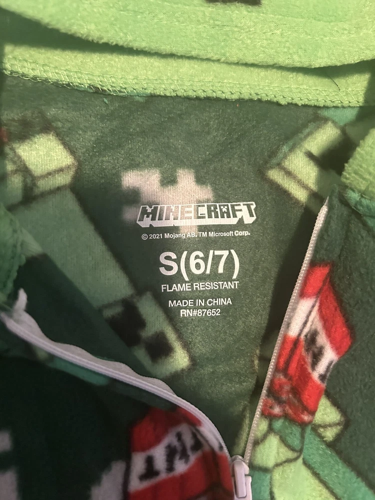 Get your little gamer ready for bed with these Minecraft Creeper Hooded One Piece Pajamas. These lightweight and cozy pajamas feature a zip closure and a crew neckline, perfect for keeping your child warm and comfortable throughout the night. The green fleece fabric and geometric pattern add a touch of fun to these pajamas, making them perfect for any occasion. These pajamas are machine washable, making them easy to care for and perfect for everyday use. They come in a size 6-7 and are made of polyester, ensuring they last for many wears to come. Whether your child is playing Minecraft or just lounging around the house, these pajamas are the perfect addition to their wardrobe.
