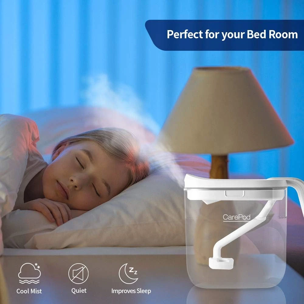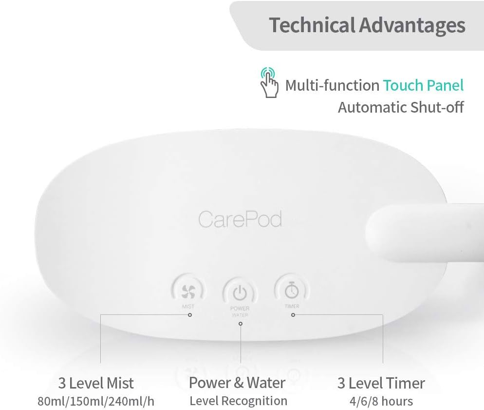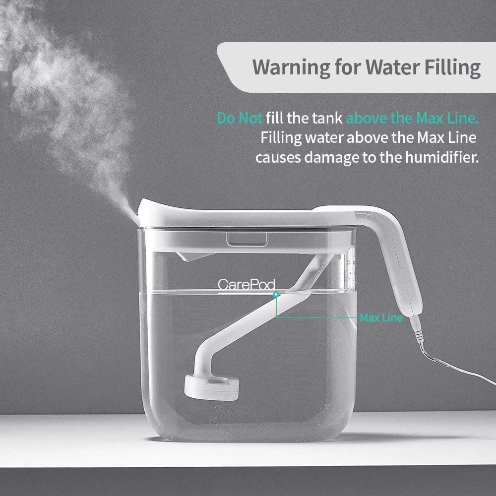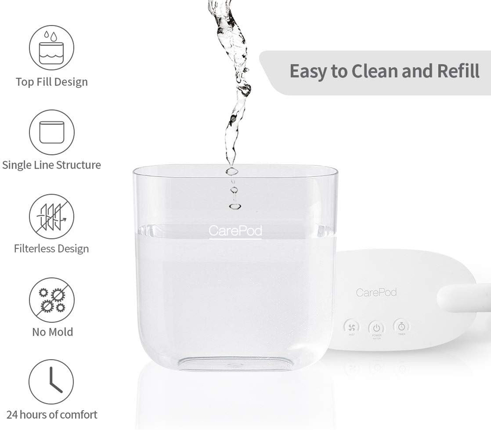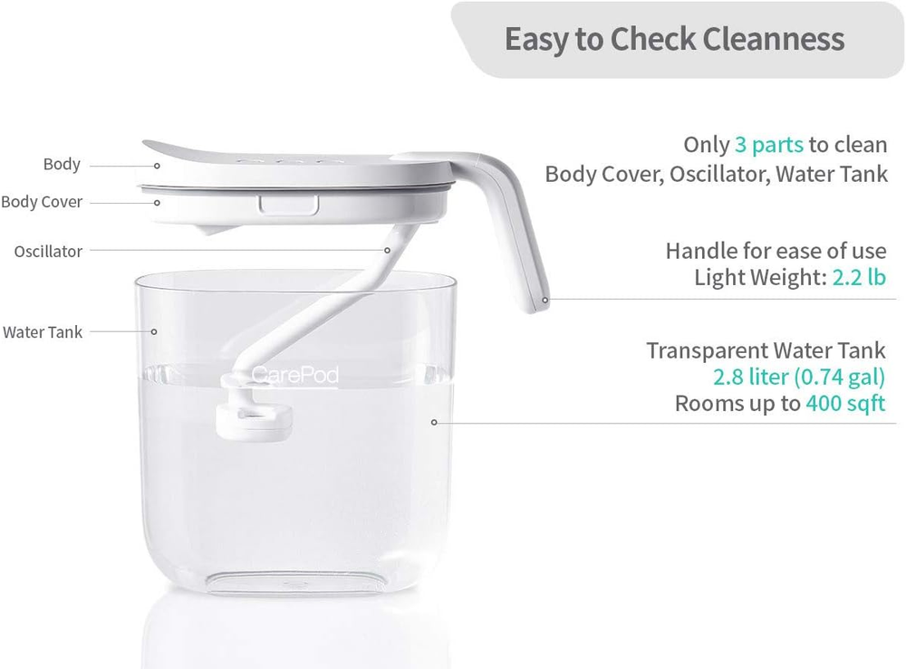 Invented by a Doctor | Scientifically designed to support and strengthen one’s health, well-being and immunity. Safe for family | Can be easily disassembled and cleaned Beautiful yet essential accessory that instantly glows up any home, office or indoor space. Automatic shut-off: Safely turns off the humidifier when the water level is low. Filterless design: Zero cost of filter replacement Rest Easy with Long Operation | Max 27 hours of continuous operation at humidity level 1 and max 10 hours of continuous operation at humidity level 3. Moisturizes air at max 300ml per hour. 3 level humidity Settings (100ml, 250ml, or 300ml) Product Description CarePod Humidifier MS021P's Key Features Only 3 Parts to Clean The body cover, oscillator, and water tank are the only parts to clean. The rounded corners of the plastic water tank make it much easier to clean thoroughly. No Hidden Spots A transparent water tank with rounded corners means there are no places for mold, bacteria, or any foreign material to grow, hide, or build up. Elegant Design The minimalistic design of the CarePod humidifier coordinates with any interior, creating an inviting and pleasant environment. Automatic Shut-off The CarePod humidifier automatically shuts off when the water level reaches a minimum level, to save energy and to protect the oscillator from damage. Doctor on a Mission A Korean dentist, Dr. HJ Kim, was set out on a mission to create hydrated air for healthier, resilient living in shared spaces across the world. Working to achieve this goal, he invented CarePod, a simple-to-use humidifier, to provide easy access to safe, clean air for the public. Open a New Era of Humidifier Thanks to its simple structure, the CarePod humidifier can be cleaned quickly with minimal effort. If you have been worrying about mold growth in your humidifier, the CarePod humidifier will put your mind at ease.