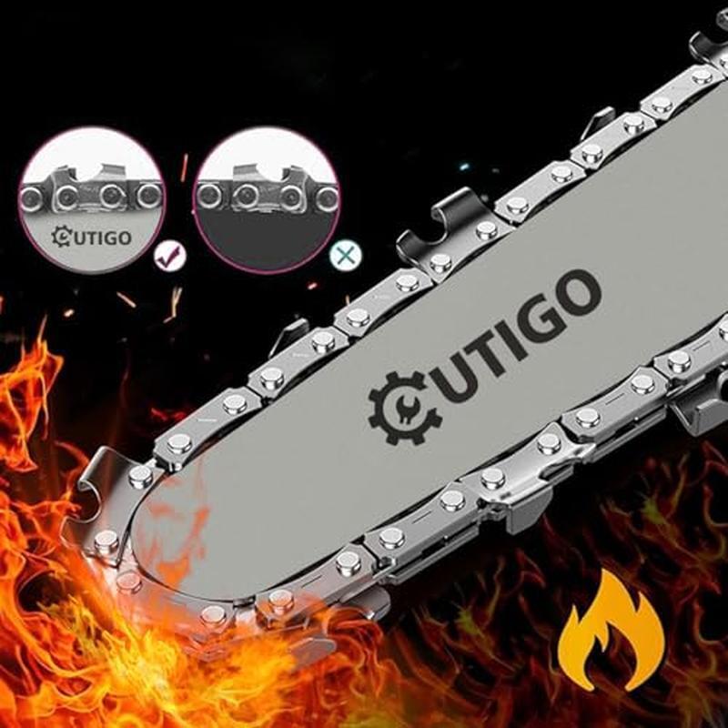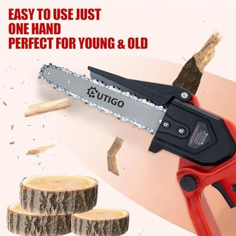 About this item 【Upgraded Motor Chainsaw】: OUTIGO cordless chainsaw is driven by a powerful 800W motor, which is more powerful, more stable, less noisy and more durable than traditional pure copper motors. It only takes 5-8 seconds to cut 8-inch diameter wood, which greatly saves your time and energy. 【Automatic Chain Lubrication】The 8-inch mini cordless chainsaw is equipped with an automatic chain lubrication system, and the transparent water tank can check the oil level. Just pour oil (universal motor oil) into the oil tank and press the oil filling chain by hand to automatically lubricate. Reduce the friction resistance of the chain when using the chain saw and achieve fast cutting. 【Multiple safety protections】: This handheld small cordless mini chainsaw provides you with all-round protection, ① Safety lock to prevent accidental start (When starting the chain saw, you must press the safety lock and start button at the same time. ) ② Splash guard: prevent debris from splashing ③ Non-slip handle: ergonomic, comfortable grip ④ Safety gloves: protect your hands ⑤ Goggles: prevent debris and dust from splashing and hurting your eyes. Let you rest assured that cutting work is easy. 【Durable Battery】: This handheld cordless chainsaw is equipped with 2 x 21V rechargeable lithium batteries, which can provide longer battery life when cutting wood and pruning branches. Equipped with a fast charger, it can meet your cutting needs at home, garden and outdoors. 【Best gift choice】: You will receive: 1 chainsaw, 2 batteries, 1 suitcase, 1 chains (one is installed), 1 blades (one is installed), 1 manual, 1 charger, 1 pair of gloves, 1 pair of glasses, 1 protective case, 1 user manual and 1 screwdriver. You can find everything you need in a mini chainsaw package. › product details Brand:OUTIGO Power Source:Battery Powered Horsepower:800 Watts Item Weight:1. 92 Kilograms Product Dimensions:9. 06"L x 5. 12"W x 18. 5"H Manufacturer:OUTIGO