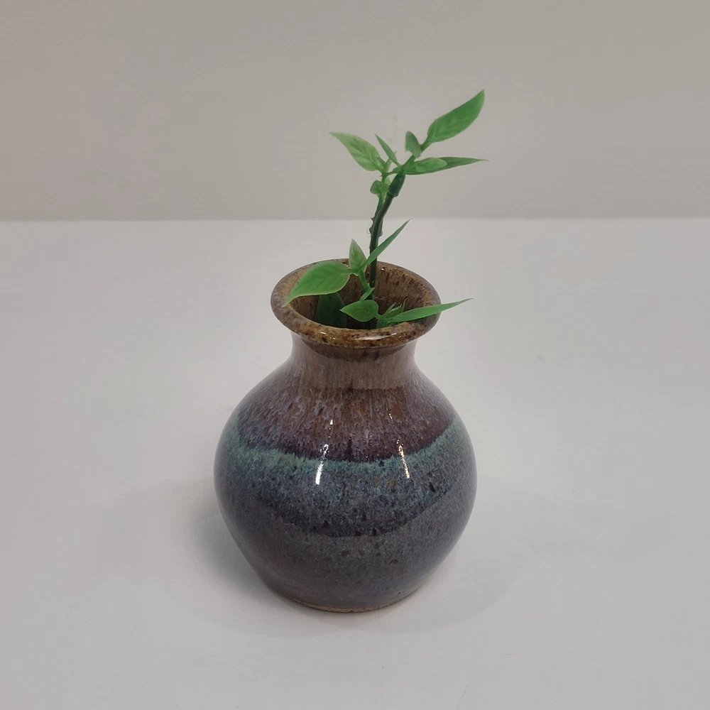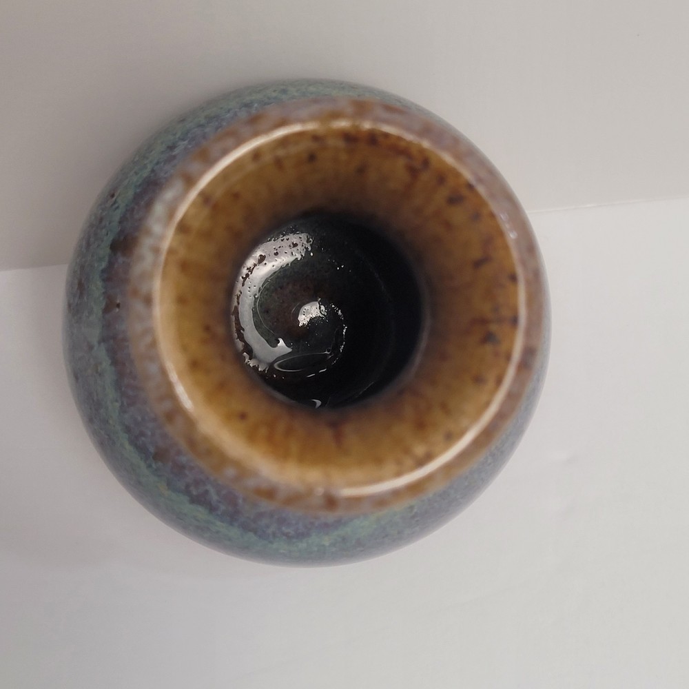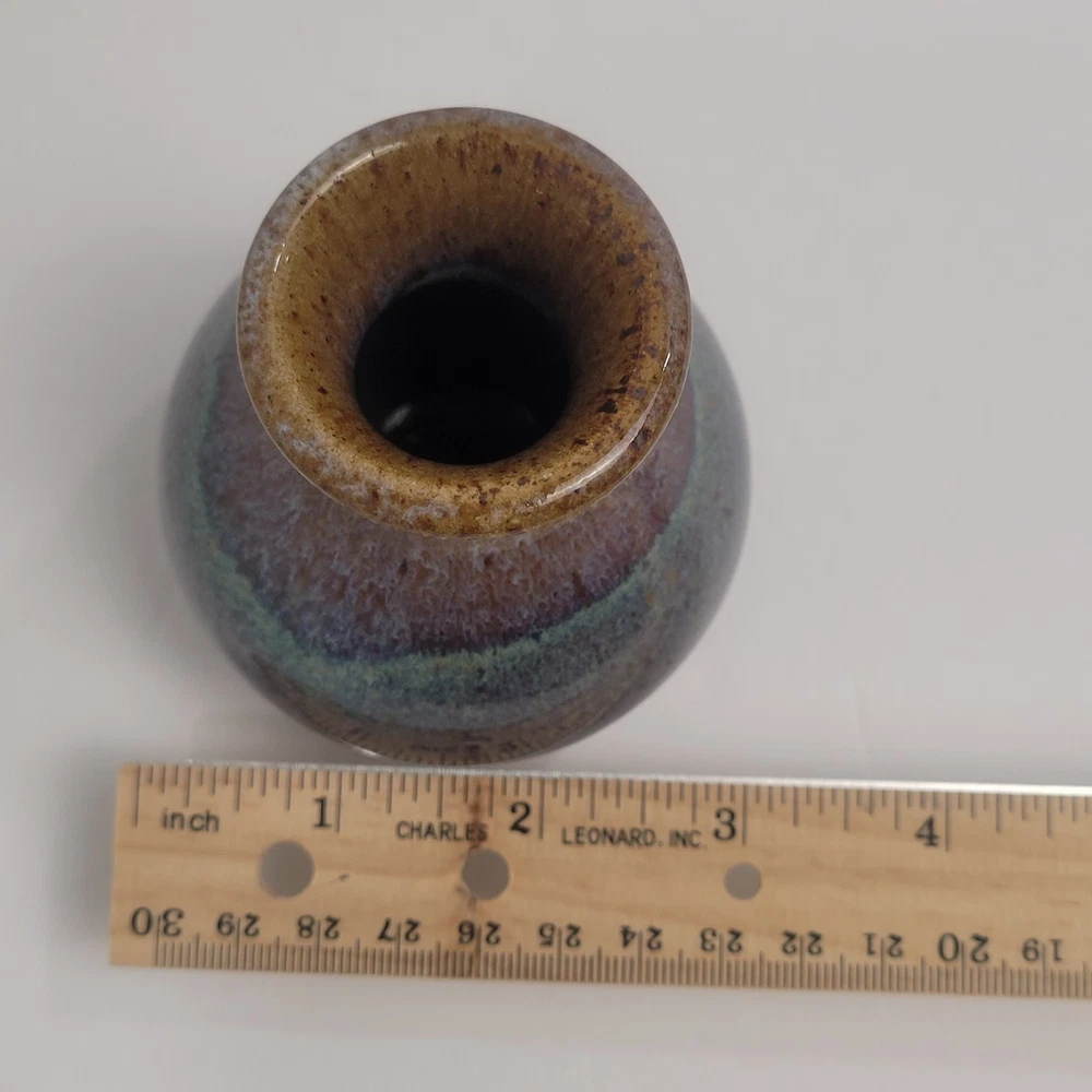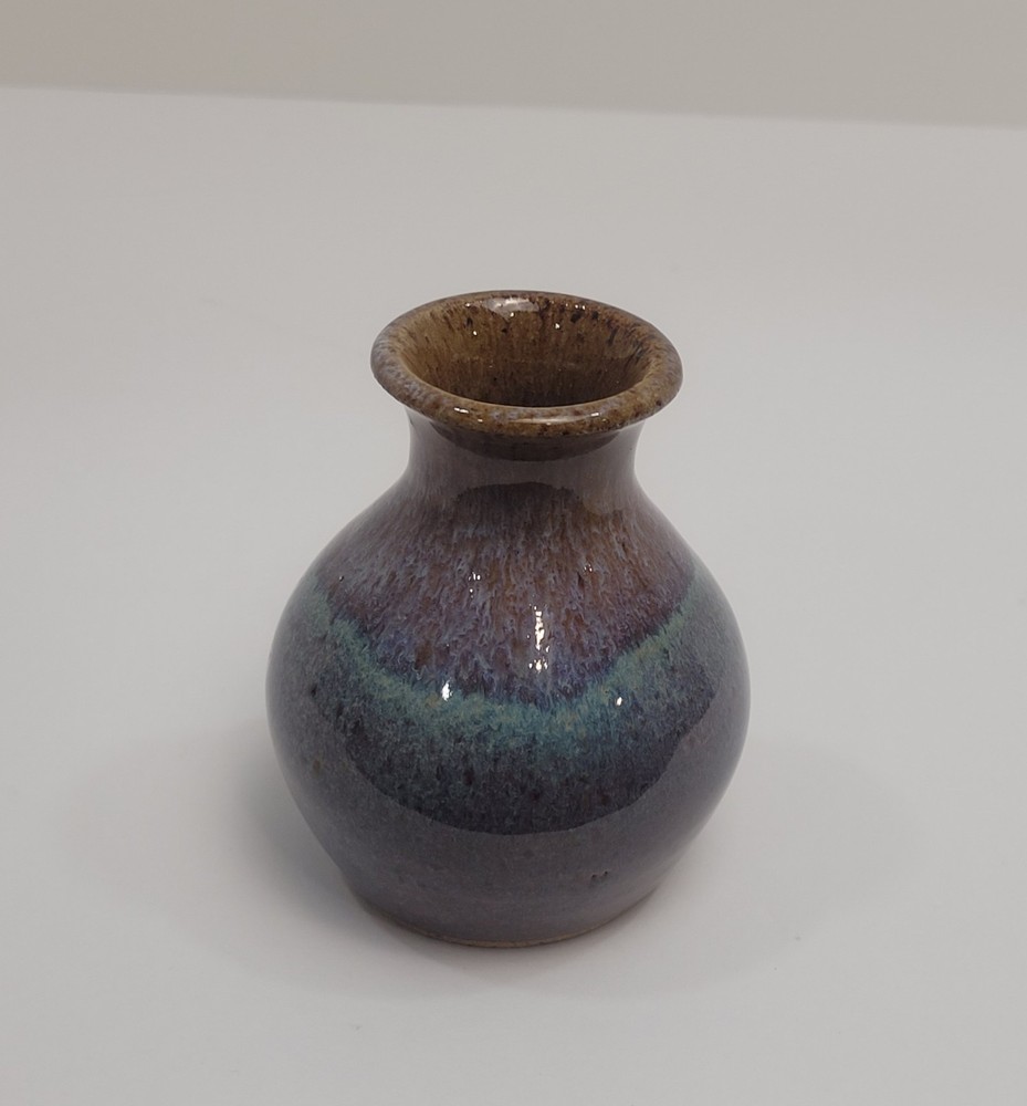 Art Pottery Drip Glaze Mini Bud Vase in shade of Purple, Blue and Brown. 3.5" Tall, Signed. Excellent condition.