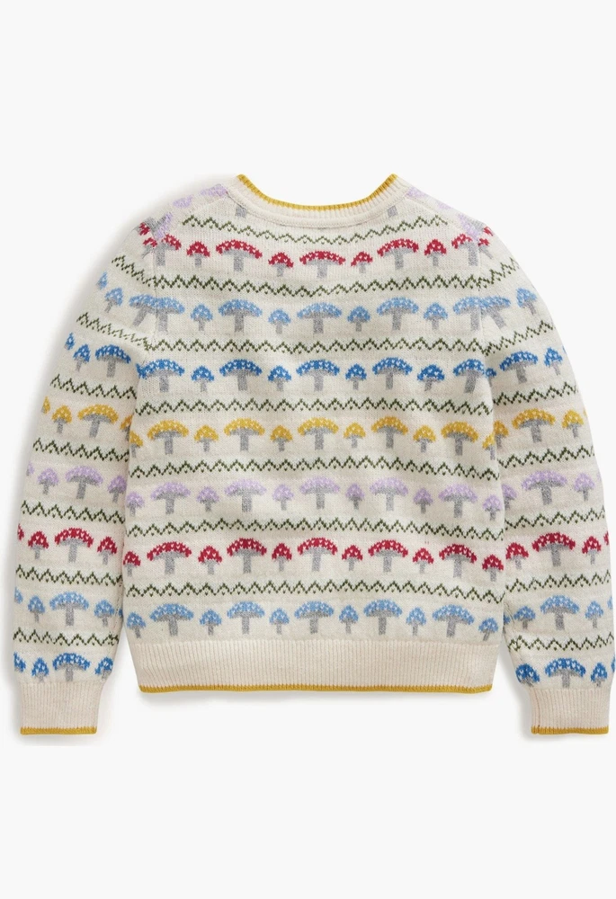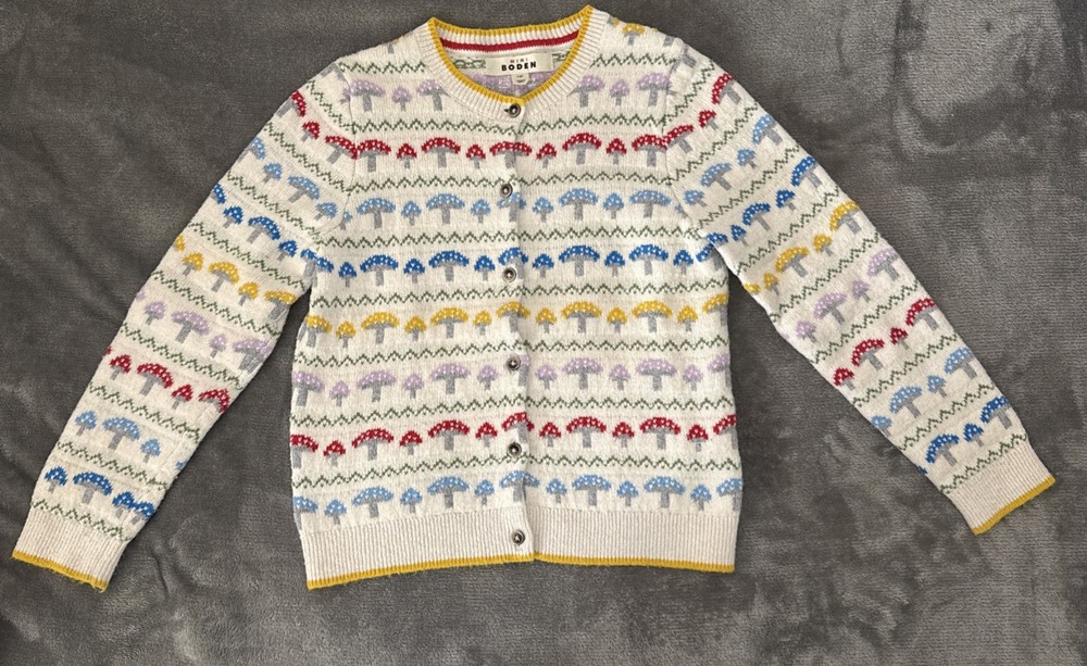 Adorable Mini Boden Edie Toadstool Fair Isle Cardigan featuring a whimsical toadstool pattern on a classic Fair Isle knit. Perfect for layering during cooler weather—both cozy and stylish. Details: * Size: 7–8 Years * Front button closure * Soft knit with a hint of wool * 57% cotton, 31% polyamide, 12% wool * Imported * Item #10463632 Condition: Excellent pre-owned condition. Always dry cleaned only, never washed.
