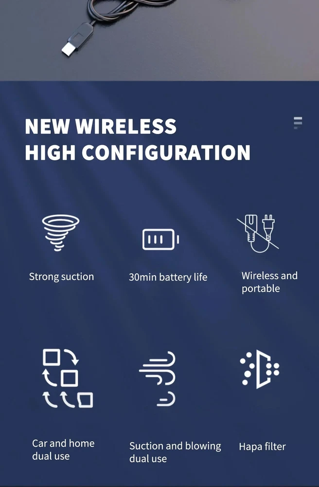 Introduction [Product Name]: Multifunctional Vehicle Vacuum Cleaner [Product functions]:mainly cleaning cars, vacuuming, blowing dust and so on [Package list]: vacuum cleaner X1 Accessories X 6 Charging line X 1 User manual X 1 [weight]:590g for Basic,610g for Pro Version Introduction 【Pro version】 [Product material]: ABS [Color]: Black [Vacuum degree]: 98000PA [Rated speed]: 35500rpm [Capacity of lithium battery]: 2 * 2000mAh [Charging mode]: Type-C charging line [Noise]: ≤ 32dB [Operating temperature]: - 20 ℃~+50 ℃ 【Basic version】 [Product material]: ABS [Color]: Silver [Vacuum degree]: 8000PA [Rated speed]: 15500rpm [Capacity of lithium battery]: 2 * 2000mAh [Charging mode]: Type-C charging line [Noise]: ≤ 32dB [Operating temperature]: - 20 ℃~+50 ℃