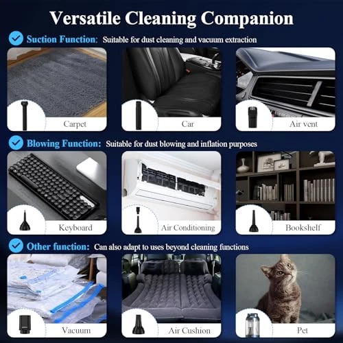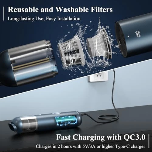 Return Policy Fast Delivery Trusted seller Mini Car Vacuum Cordless, 15000PA Strong Suction Handheld Vacuum Cordless with LED Light, 2H Quick QC 3.0 Fast Charging Up to 30 Mins Runtime, Portable Small Vacuum for Car, Home, Office, Corners Product Description 8 Accessories: Our car vacuum comes equipped with 8-in-1 multifunctional combinable accessories, combining vacuuming, blowing, inflating and pumping functionalities. The crevice nozzle and wide suction nozzle efficiently clean hard-to-reach areas in your car, such as card slots, seat cushions. The handheld vacuum's pumping power can be used to compress the bag, helping to save storage space. Blow nozzles can be used for various outdoor activities, such as inflate air mattresses, swimming rings Support QC 3.0 Fast Charging: The hand vacuum cordless rechargeable built-in 6600mAh large-capacity battery, supports QC 3.0 fast charging and can be fully charged in just 2 hours; Charge it in the car or charge with standard chargers, power banks, computers, or various storage devices Powerful 15000 PA Suction: Powerful brushless motor of the hand held vacuum cleaner has 93,000 RPM and provides up to 15 kPa of suction power, effectively removing dirt, dust, and debris from different surfaces; Two suction modes, Eco Mode can be used for 30 minutes, Max Mode can be used for 15 minutes; strong suction power portable vacuum cordless allows you to clean your trash quickly without having to clean the same place several times over and over again, which saves half of the time compared to the low pa cordless car vacuum Simple Design: The car vacuum cleaner has a stylish design and weighs only 0.9 lbs, making it very compact and lightweight. The mini car vacuum cordless is comfortable to hold and saves space, making it easy to carry and store. In addition, cordless handheld vacuum cleaner features a bright LED light and visual dusting light, making it easy to clean in dark places or at night. Washable Filter: Small Handheld vacuum cordless feature an enhanced HEPA filter that helps pick up and lock in 99.5 per cent of the microscopic dust particles that are invisible to the naked eye, and a high-quality stainless steel filter wrap that blocks most particles, further extending the life of the HEPA filter while ensuring optimal suction; The external metal filter and built-in HEPA filter element are dust-proof and can be washed and cleaned repeatedly. Please do not clean the fuselage. It is recommended that you empty the dust cup when in use Will Always Be With You: The car vacuums with best suction cordless comes with an exquisite storage box, which makes it perfect best gift for family or friends! is committed to providing customers with the highest quality shopping experience, if you have any problems, please contact us, we will help you solve your problems within 24 hours and lifelong friendly customer service Shipping Returns Payment Shipping Shipping is FREE to all addresses other than APO/PO boxes in the lower 48 states. All our stock ships from US-based warehouses. Shipped via USPS or UPS (depending on location and package weight) Unless stated otherwise, all orders will ship within 24-72 hours of your payment being processed. Check our feedback to see the great reviews of FAST shipping we offer. Returns Seller does not accept returns Payment We currently accept payment via eBay managed payments only. Once payment is cleared, we will dispatch your shipment within 1-3 business days. Please refer to the "Shipping" tab for more information regarding shipping speed to your destination.