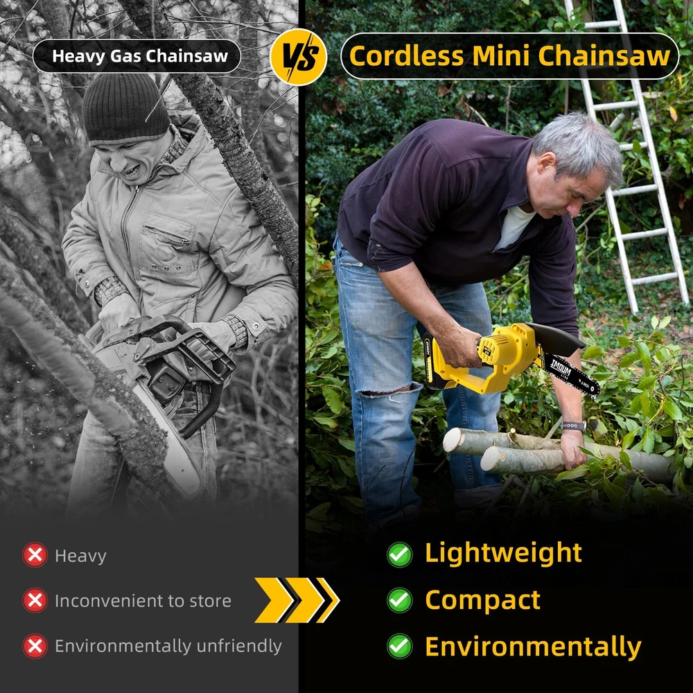 A cool gift gadget for dad, elderly men, husband, yard work lovers, DIYers Powerful & Efficient Cutting: The mini chainsaw features a newly upgraded 2024 550W motor, allowing for up to 30 cuts per charge. Adequate for trimming, pruning, and cutting in the garden or yard Ultra-Lightweight Chainsaw: Only 2lb, its lightweight nature ensures that you can keep going the small saw without any fatigue, making it ideal for seniors and women as a camping/wood/tree saw 2.0Ah Battery: This cordless chainsaw comes with a FCC & CE certified lithium-ion battery, provides an impressive 100 minutes of continuous use for outdoor tasks Pole Saw Attainable: Compatible with the exclusive extension pole, this battery powerd chainsaw can reach up to 16.5ft for easier trimming of higher tree branches (pole sells separately) Safety-First: Featuring a safety lock to prevent accidental starting, this handheld chainsaw also includes a widened hand guard for added protection. Keep your hands safe while working 365-day NO Worry Quality Service: Enjoy a one-year customer service for the chainsaw and battery, with returns or exchanges available within this period. Your satisfaction is our priority Out of the Box: This electric saw comes fully assembled and ready to use. Includes a chainsaw, 2 chains (one installed), a battery, a charger, and a pot of lubricant. Get started on your projects right away