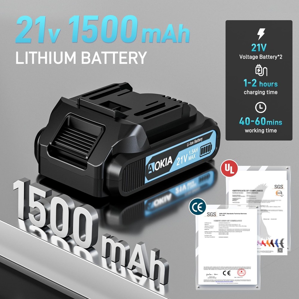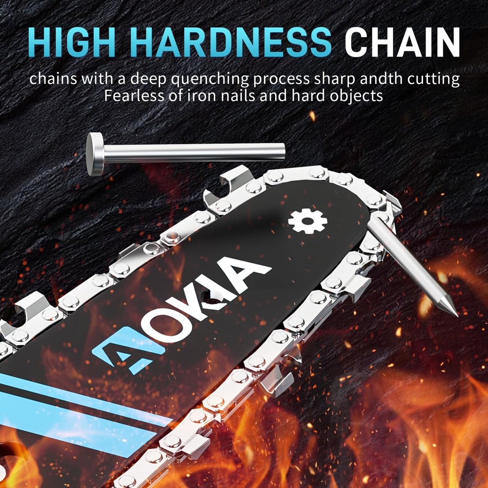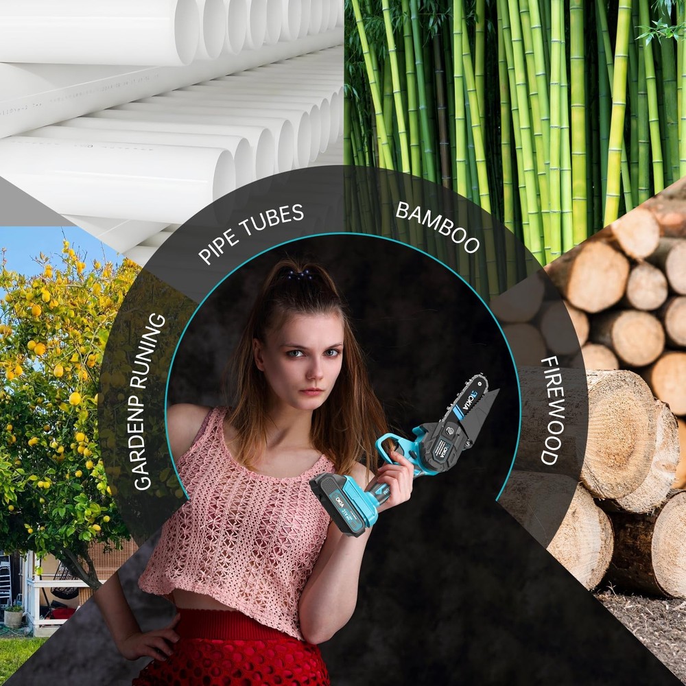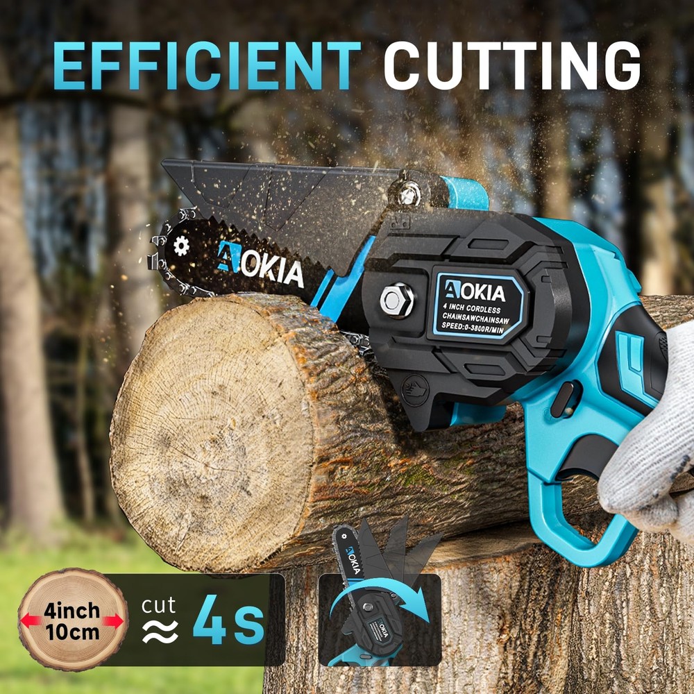 【HIGH-EFFICIENT CUTTING】Cordless portable mini chainsaw is powered by a pure copper motor, equipped high-quality guide chain that has undergone a deep quenching process to ensure cutting efficiency is higher and faster. 【LIGHTWEIGHT AND PORTABLE】4-Inch cordless chain saw weighs only 2.4lbs (including ONE battery), making it carry anywhere. One hand operation, women and the elderly can easily use this samll saw for cutting work. 【SAFETY DESIGN AND MORE RELIABLE】In order to protect you and your family. Our battery powered chainsaw adopt the strict safety measures: ①Security Lock prevent accidental activation. ②Blade guard prevent injury when pressing with the other hand. 【UPGRADE 21 VOLT BATTERY POWERED】This electric mini saw comes with 1500 mAh battery and fast charger, which can be used for a long time. So you don't have to worry about running out of power mid-task, you can cut more woods in yard. 【NOTE】After using the mini chainsaw for a few minutes, a few drops of oil need to be added to the chain. Please check if the chain is securely fastened before each use. If you have any issues when using the mini saw, please contact us. 【MINI SAW FOR YARD CARE】Handheld chainsaw can be widely used in daily life, whether it's cutting tree branches and wood or pruning garden and yard, can be done with this samll saw. It's also ideal tool for farms, parks, forests, pastures.
