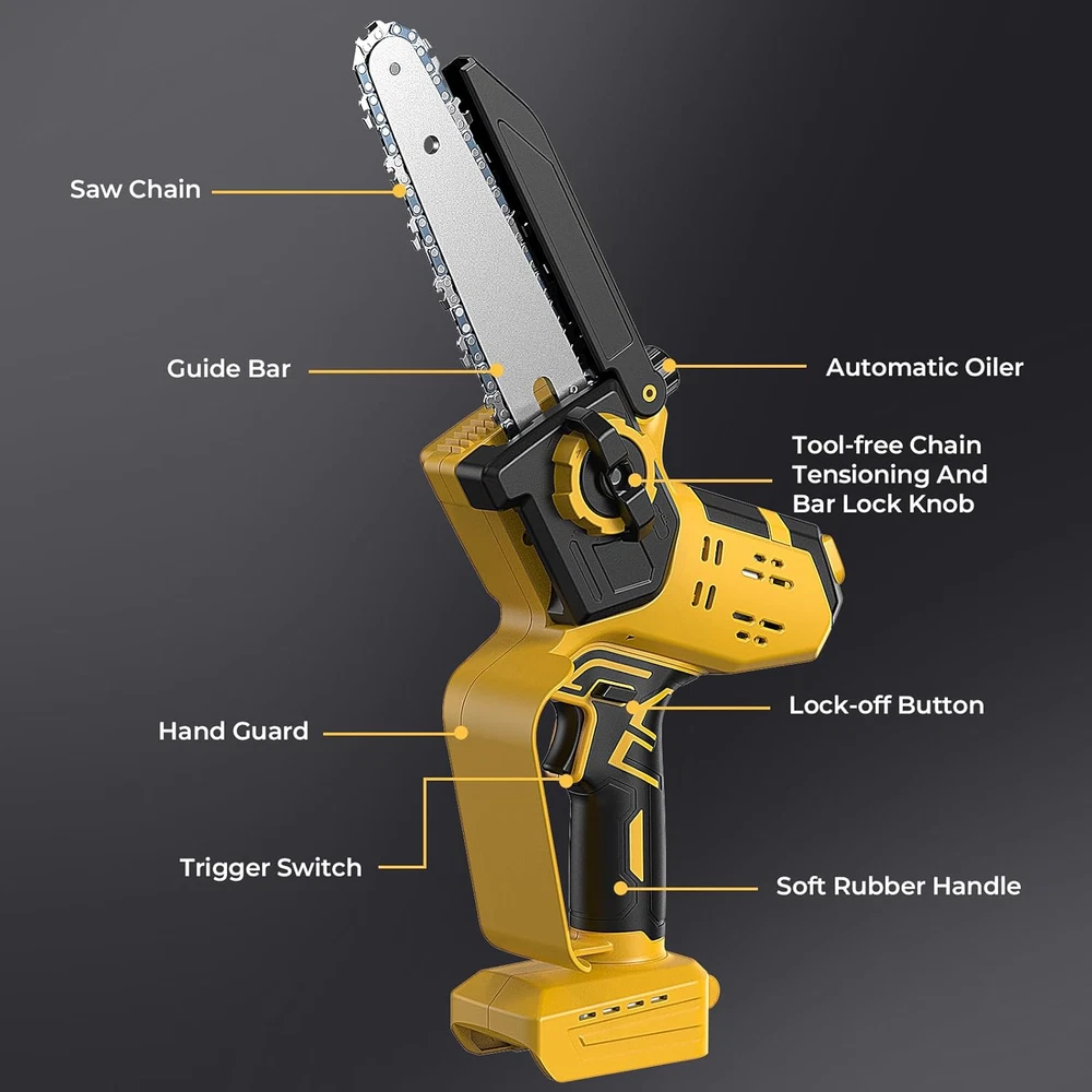 HIGH-EFFICIENCY BRUSHLESS MOTOR: The pruning chainsaw is equipped with a powerful 800W brushless motor. High-efficiency Brushless Motor delivers the power for more efficient cutting and maximizes run time and motor life. Chainsaw Compatible with DCB 20V MAX BATTERY: The Pruning Chainsaw Compatibility with DCB 20V MAX Battery, such as DCB200, DCB201, DCB203, DCB204, DCB205, DCB206, DCB230, DCB240, DCB246, DCB248, DCBP520, etc, Plug in your own battery and get your job done fast and easy! Low-voltage protection is our first concern. The machine will automatically shut down if the battery voltage is below 14.4v to prevent any overload damage. AUTO-OILING FOR CONTINUOUS LUBRICATION: Automatic oiler delivers proper chain lubrication and increased productivity. Lubricates the saw chain automatically while the pruning chainsaw is running, minimizing friction and wear and optimizing bearing and mechanical life. TOOL-FREE CHAIN TENSIONER: Easy access chain tensioner for quick adjustments to chain tension. The mini chainsaw with tool-free chain tensioning and bar lock knob making it easy to install and replace chain. No tools need at all. 8-INCH AND 6-INCH 2-IN-1 DESIGN: The 6"and 8" 2-in-1 suit design meets your extensive choice, gives you more flexibility in terms of cutting different sizes of woods. COMPACT DESIGN FOR BETTER HANDLING: Weighing just 2.8 lbs (tool only), the Pruning Chainsaw is 61% lighter and 3x more compact, designed to reduce fatigue while cutting, trimming and pruning. Use it to trim branches from downed trees, cut bundles of wood or branches, and manage thick brush or daily pruning needs. Compact design allows for easy access to tight spaces. EXCELLENT CUTTING PERFORMANCE: The mini chainsaw cordless is equipped with a powerful motor and sharp blades for efficient cutting. With a high chain speed of 8m/s, it only takes 6 seconds to cut 4 inches of wood. Up to 70 cuts per charge on 4x4 pressure treated wood (using a 20V MAX 4Ah battery). WHAT YOU GET: Package includes a Pruning chainsaw (battery not included), a 6" guide bar and chain (already installed on the machine), 1*8" guide bar, 1*8" saw chain, 1*scabbard, 1*user manual, and 24 months Limited Warranty. If you have any questions or comments about the item, please contact us. Product Description