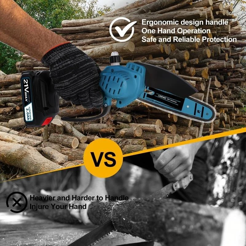 Feature: 1. Chainsaw 6 inch mini chainsaw. Easy to install, smoother chain work. External rotary knob, easy to adjust chain tension. And the mini chainsaw has a rubber handle design that absorbs shock and is non-slip. The design of the battery cooling hole can accelerate heat dissipation. 2. Strong abrasion and impact resistance: mini chainsaw with strong power is more durable. The cutting power is high, the speed is fast. 3. 6" CHAINS: The mini chainsaw is equipped with 8" chains, so its scope is wider. Effective heat dissipation, excellent sound insulation. 4. Wide range of applications: portable chainsaws can be easily used for outdoor cutting, interior design, cutting firewood and sawing trees, pruning branches and trees, as well as cutting different materials easily. It is the perfect gift for fathers, husbands and friends.