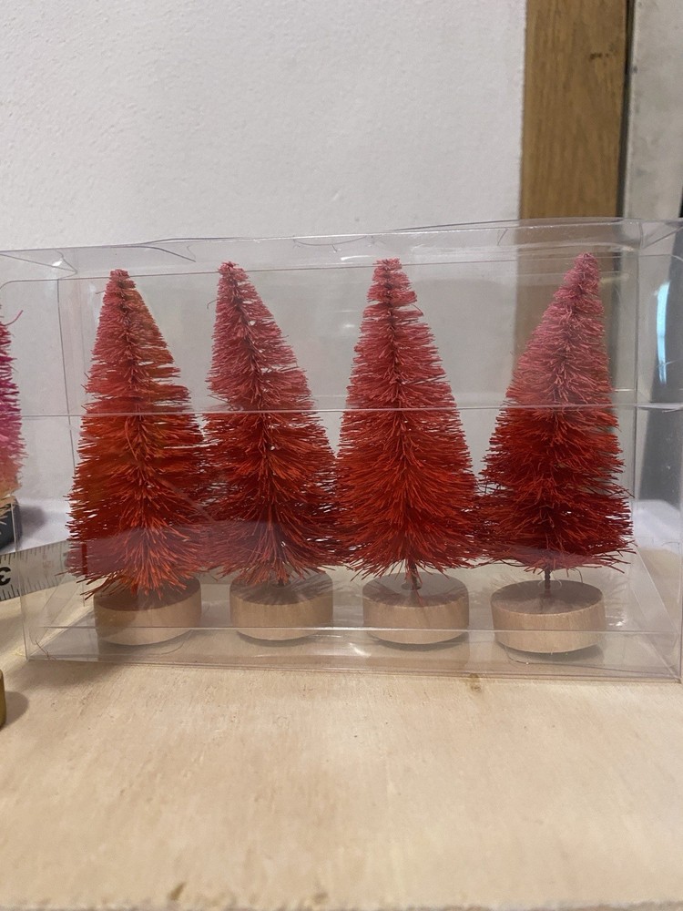 The product is a lot of mini artificial pine Christmas trees decorations in multicolor. They are designed for decorating doors and are perfect for the Christmas occasion. Made from pine material, these decorated trees are ideal for adding a festive touch to your home during the holiday season. Each tree can be easily displayed and enjoyed as part of your Christmas decorations.