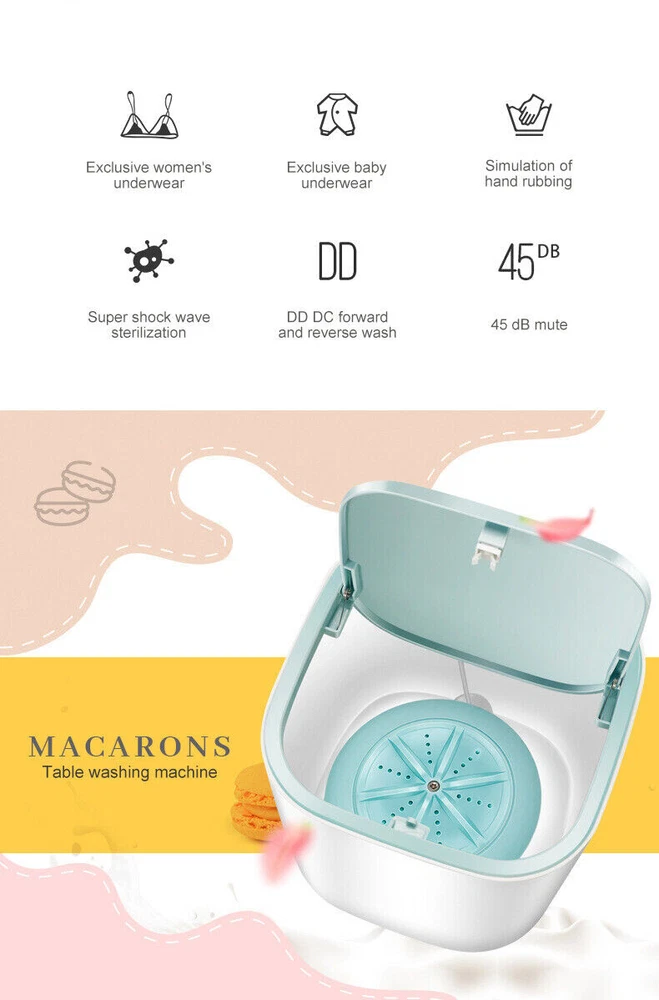 Mini Compact Washing Machine Portable Rotating Clothes Washer Spinner Cleaners 3.8L USB Power Portable Mini Washing Machine Baby Clothes Underwear Washer Compact Description: ★ USB power supply, high-frequency vibration. ★ Small, lightweight, portable, suitable for home and traveling. ★ Automatic shutdown at 30 minutes, no worry about forgetting. ★ Perfect for limited space such as dorms, apartments, condos, motor homes, RV's, etc. ★ The mini washer is perfect for baby clothes, underwear, socks, towels and more. Specification: ❖ Color:White ❖ Model: WV-781 ❖ Washing C apacity: 3.8L ❖ Material: Plastic ❖ Color : White ❖ Interface: USB ❖ Input Voltage: DC 5V ❖ Input Current: 2A ❖ Rated Voltage: DC 10V ❖ rated Power: 18W ❖ Forward Reverse Time: 15 seconds ❖ Ultrasonic Working Time: 60 seconds switching ❖ Size: 17x17x17cm/6.69x6.69x6.69 inch Package Includes: 1X Piece Washing Machine Note: 1. Due to the light and screen difference, the item's color may be slightly different from the pictures. 2. Please allow 1-3mm differences due to manual measurement. Payment Delivery details Terms of sales About us Contact us Payment We accept ebay payment 。 Fees such as import duties, taxes are not included in the item price or shipping costs. These charges are the buyer's responsibility. Delivery details Shipping: 2-9 working days to: USA Terms of sales We maintain high standards of excellence and strive for hundred percent customer satisfaction. Feedback is very important to us. We hope that you contact us immediately before you give neutral or negative feedback, so that we can address your concerns. It is impossible to address issues if we do not know about them! About us Your satis faction is our ultimate goal. We work hard to earn your trust and future business. Our certified technicians have tested each item before shipping. The unit comes with 1 year limited warranty on all manufacturing defects. a) If you receive a defective item, you may return it or ask for a discount. Please contact us within 14 days after you receive the package. b) What you returned must be intact and in its original packaging as re? u. Customer is responsible for shipping costs of the returned item. c) We will cover the cost of shipping back t with the shipping rate indicated in the registration page. We will send you a new unit or refund the full payment you paid. Thank you. Contact us Business Hour Business Hour: Monday To Friday: 8:30 AM to 5:00 PM (Beijing China time) Due to time zones, our reply to your questions may not be immediately. But within above working time, we will reply your email within 24 hours. If it's non-workdays, please kindly be patient and wait till Monday. Please contact us with ebay message. Please feel free to contact us if you have any questions. Monday To Friday: 8:30 AM to 5:00 PM (Beijing China time) Due to time zones, our reply to your questions may not be immediately. But within above working time, we will reply your email within 24 hours. If it's non-workdays, please kindly be patient and wait till Monday. Please contact us with ebay message. Please feel free to contact us if you have any questions. Features Durable Type Mini Washing Machine Brand Unbranded Model WV-781 Installation Portable Size Category Compact/Mini Load Type Top-Loading Power Source Electric Washer Capacity 3.8 L Color White Operating Sound Rating 40 dB or Less Water Consumption per Year 2000 gal/year or less Material Plastic Interface USB Input Voltage DC 5V Input Current 2A Rated Voltage DC 10V Power 18 W Forward Reverse Time 15 seconds Ultrasonic Working Time 60 seconds switching Size 17x17x17cm / 6.69x6.69x6.69 inch Smart Home Compatibility USB Energy Star 3 Stars EC Range A++ - G MPN Does not apply Manufacturer Warranty 3 Years Country/Region of Manufacture China UPC Does not apply On Nov 18, 2024 at 01:46:55 PST, seller added the following information: