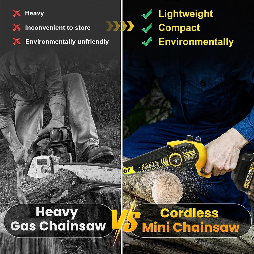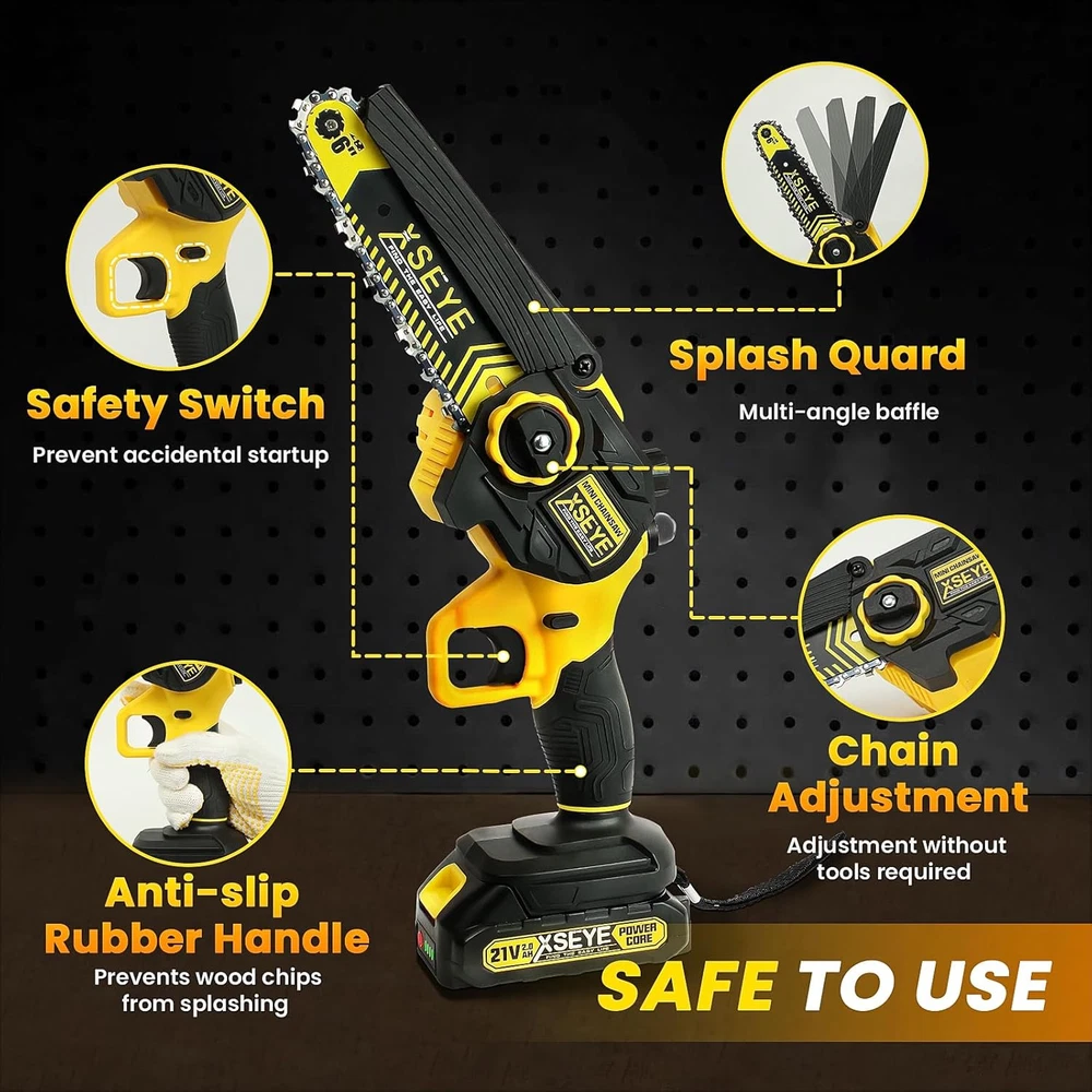 XSEYE mini chainsaw cordless comes with an automatic oiling system for hassle-free maintenance. Just pour oil into the tank, secure the cap, and press the bulb a few times to lubricate the chain. The auto-lubrication system minimizes chain wear, extends its lifespan, and ensures smoother, more efficient cutting performance. Mini chain saw battery powered is powered by a 21V 2000mAh rechargeable lithium-ion battery, delivering extended runtime and designed for easy removal, ensuring convenient recharging whenever needed. The battery is also equipped with a power indicator, allowing you to effortlessly track the remaining charge. Ideal for a wide range of cutting applications, this electric tree trimmer excels in wood cutting, garden pruning, pasture upkeep, backyard maintenance, and more. This Electric Chainsaw Cordless features a robust 775W pure copper motor, delivering an impressive idle speed of up to 21,000 RPM for powerful performance. Equipped with a high-quality metal chain, it effortlessly cuts through branches up to 6 inches (15 cm) in diameter, as well as wood and more. Ideal for tree trimming, camping, and gardening, it makes these tasks hassle-free and efficient. User safety is our top priority, which is why the mini chainsaw is equipped with a safety lock. The cordless chainsaw only activates when both the safety lock and trigger are pressed simultaneously. Additionally, a removable, adjustable splash guard on the guide plate helps prevent flying debris, while the included goggles offer excellent eye protection. Lightweight Mini Cordless Chainsaw weighs just 3.22 pounds and features an ergonomically designed handle for comfortable, fatigue-free one-handed use. It’s easy to maneuver and a joy to work with, making it ideal for beginners and gardeners alike. The cordless design ensures excellent portability, even in tight spaces. Perfect Gift Choice: Whether it's Christmas, Father's Day, Thanksgiving, birthday or anniversary, XSEYE Mini Chainsaw Cordless is the ideal choice for Dad, your husband, or any man in your life. Make this holiday season full of surprises and practical love by giving this thoughtful gift, ensuring he feels your care and support every time he uses it! 365-Day Warranty for XSEYE Product: We are committed to product quality and offer a 365-day support plan—no complicated return process required. Check the "Product Description" section for helpful usage and maintenance tips. If you have any questions, our team is always ready to assist you. Are you tired of struggling with branch trimming and gardening tasks? Why not opt for a lightweight yet powerful tool to simplify your work? Introducing XSEYE Mini Chainsaw—your solution for effortless gardening! Powered by a robust 775W pure copper motor, this mini chainsaw provides consistent performance for all your cutting needs. Its high-quality metal chain effortlessly slices through branches up to 6 inches (15 cm) in diameter. With a built-in 21V 2000mAh rechargeable lithium-ion battery, you can count on long-lasting power for various applications. Make XSEYE Mini Chainsaw your essential gardening tool, and enjoy a more efficient and hassle-free experience! Package Include: 1× Mini Cordless Chainsaw 1× Pre-installed Chain 1× 2000mAh battery with charger 1× Safety goggles 1× User manual 1× Pair of gloves
