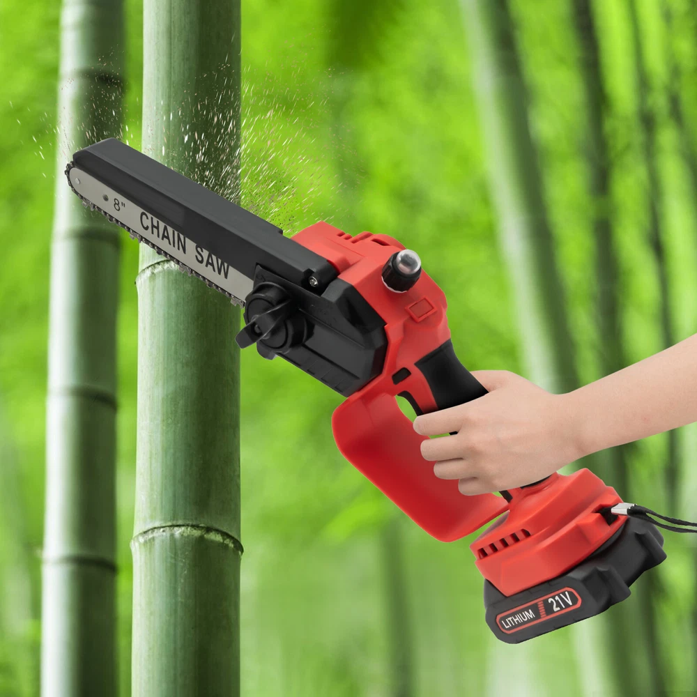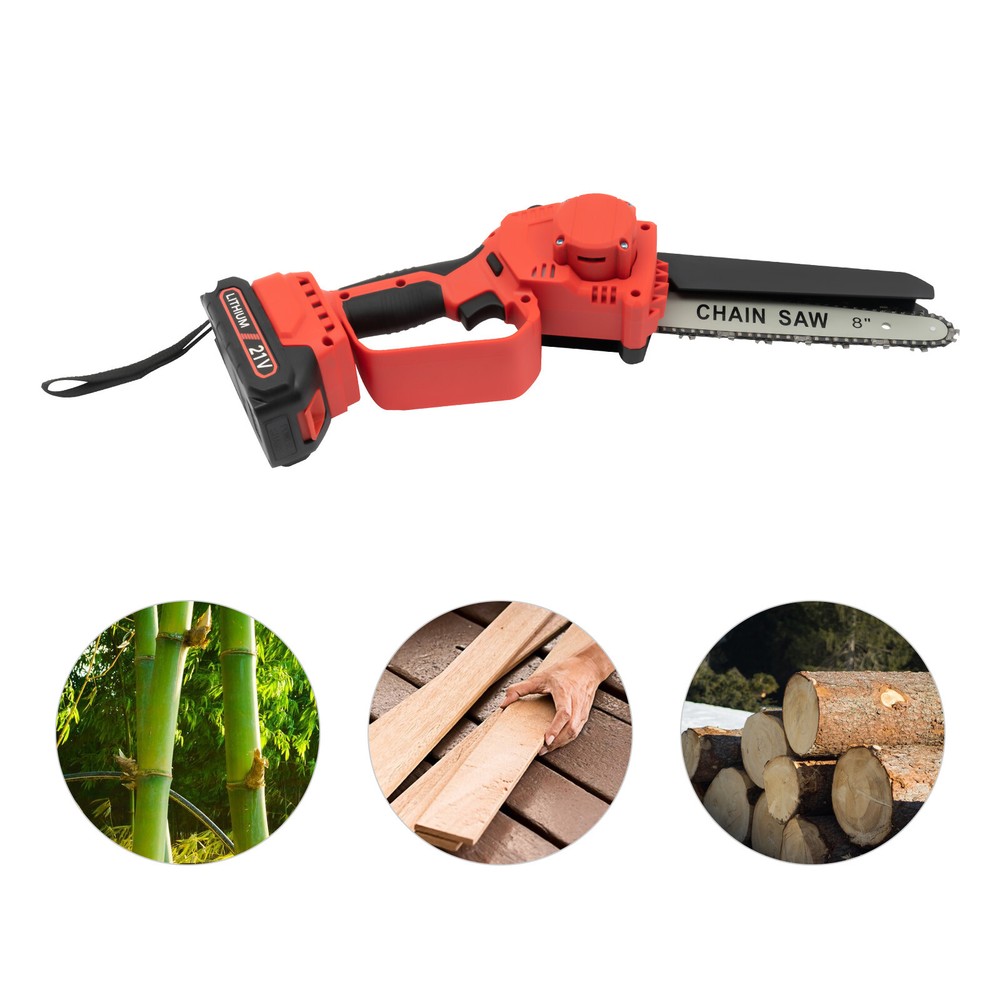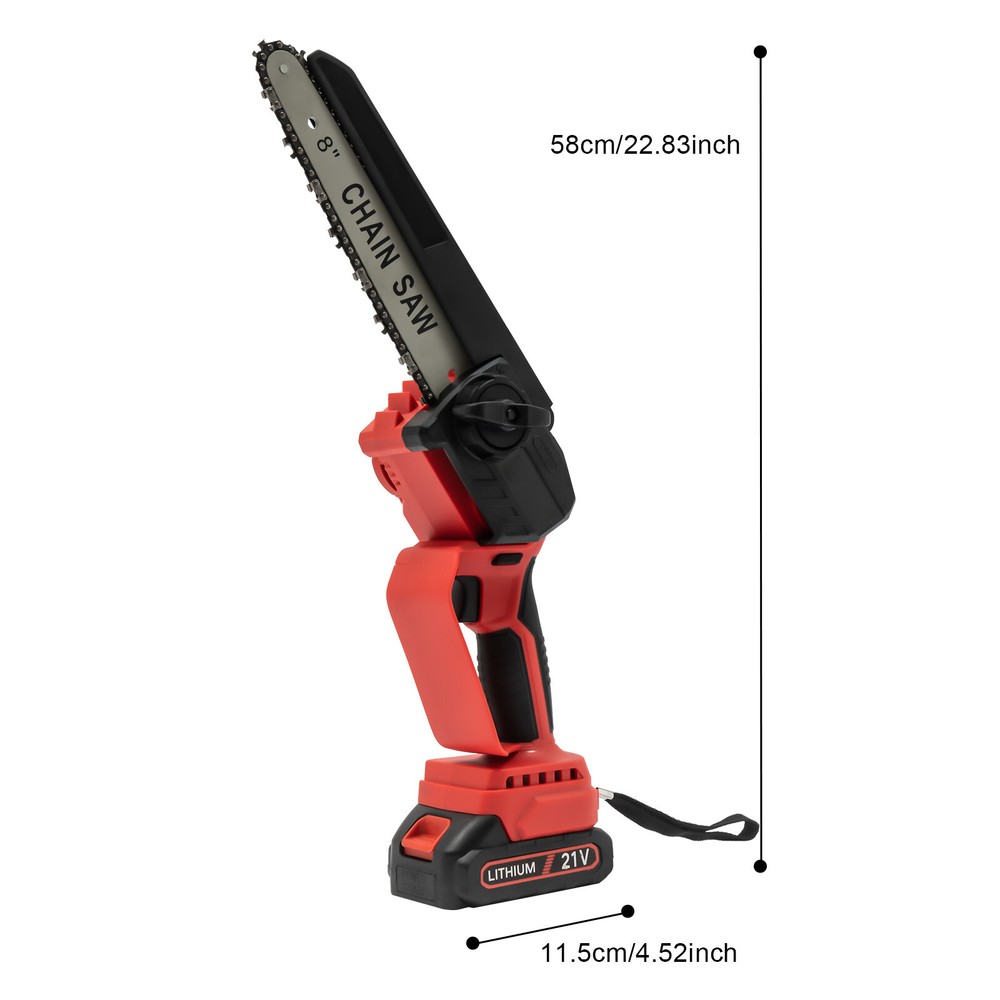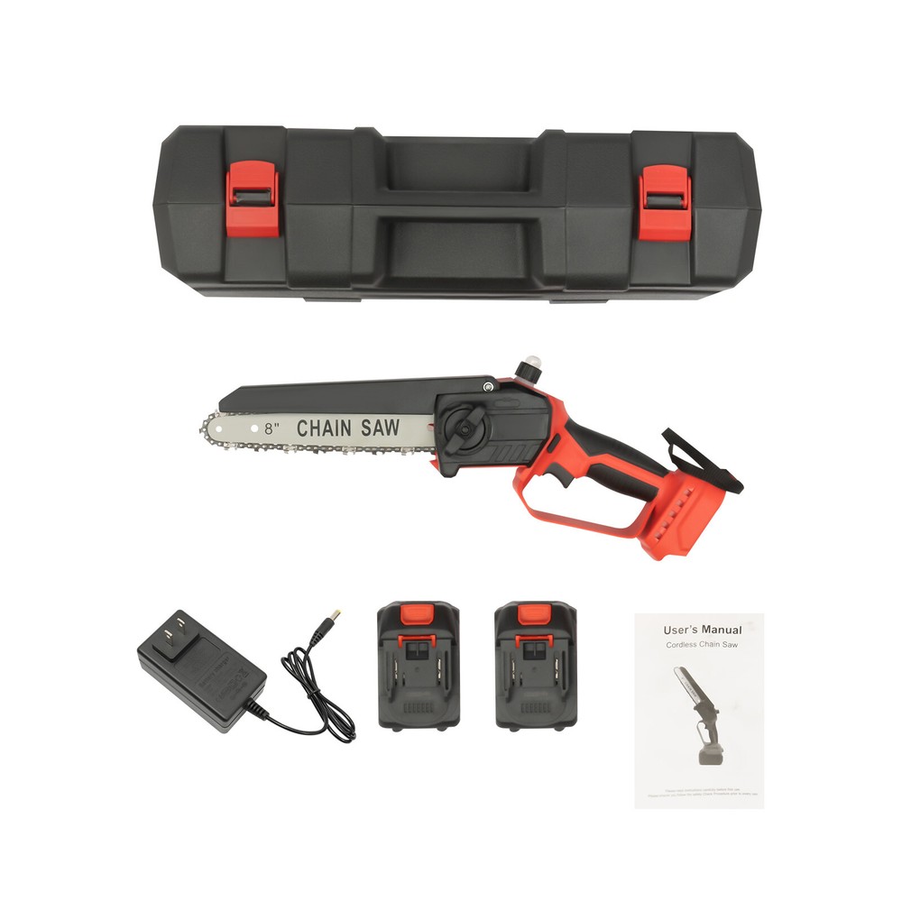 Mini Chainsaw Cordless 8 8 Inch Electric Chain Saw 800W With 2 Battery Power US DESCRIPTION 1 Description Say goodbye to heavy gasoline saws and laborious pull saws, and you can choose our mini cordless chainsaw for improving efficiency in pruning, wood cutting, and gardening. This product boasts high quality and provides a great cutting effect, all while featuring a lightweight and compact design. With a battery-powered power source, it can be conveniently used for outdoor operations, emergencies, and in locations without access to sockets. Whether you are a master carpenter or an occasional DIY tool-seeker, this product can bring you a wonderful experience! Key Features Premium Material: This product consists of high-quality PVC housing and steel guide plate&chain with a quenching treatment, effectively reducing wear and making it high-strength, anti-rust, and durable. Durable Battery: The two 2000mAh lithium-ion batteries with over-charge and overload protections can provide longer battery life without frequent charging and worrying about insufficient electricity that affects your work. The equipped charger can help recharge the two batteries to save money and energy. Cordless Chainsaw: The battery-powered&cordless design and slim handle enable you to use this chainsaw with one hand for cutting at different angles anytime and anywhere, which is very convenient, flexible, and lighter. Efficient Heat Dissipation: The heat-sink holes on the machine ensure good heat dissipation so that the heat during operation can be discharged at a faster speed to protect the motor from being burned out due to long-term use. Great Performance: Adopting a copper wire brushless motor with overload protection function, smooth bearing, and enlarged cooling fan, along with the metal gearbox, this chainsaw has high speed(5500rpm)&high efficiency and can realize continuous use with less vibration and maintenance. Powerful Function: Thanks to the high-quality guide plate with the adjustment knob that makes the chain rotate smoothly, and a high-strength chain with a quenching process and wooden teeth design, this chainsaw can achieve a large cutting diameter (8") and fast chain speed(800m/min) and provide you with pruning, sawing, and logging functions, saving you time and effort. Safe and Reliable: The durable safety lock and switch trigger give you double insurance to avoid accidental start. You should first press the safety lock and then pull the trigger to start the chainsaw. Moreover, the hand splash guard prevents wood chips and sparks from splashing, thus protecting the user's safety. Easy to Install&Use : With the simple structure, complete accessories, and English manual, you can install, disassemble, and use the cordless chainsaw easily. Even the elderly and women can easily operate and control. Convenient Storage&Carrying: The detachable design, portable case, and 6.5 lbs lightweight allow for convenient and effortless storage and carrying. It can be an excellent tool for ladder work, and you can take it with you when going outdoors. Stylish Appearance: The textured surface, smooth lines, and versatile black color with a little fresh red embellish give this machine a stylish, cool, and modern appearance, bringing you a good mood when working. Ideal Gift: With a fashionable style, portable design, and powerful functions, this chainsaw is an excellent gift to your father, friends, etc. for various holidays such as Christmas, Father's Day, and birthdays. Easy to Clean: Because of its smooth surface, you can wipe the dirt from this machine with a wet cloth. Details Protective Baffle: The protective widening baffle with a 90° rebound angle reduces workpiece debris splashing and protects you from injury during cutting. Ergonomic Handle: The ergonomic handle with soft rubber coating has textured skin, gives you a comfortable grip without slipping, absorbs shock, and reduces hand fatigue even in long-time use. It is easy to control to achieve a good balance and high-cutting performance. Chain Adjustment Bolt: It makes the replacement and installation of the chain and the adjustment of the tightness of the chain convenient and quick. Hanging Rope: The hanging rope on the chainsaw ensures easy carrying, prevents the chainsaw from falling, reduces fatigue, and is convenient to use. Manual Oiler: It can provide necessary lubrication for the chain, extend its service life, increase the safety of use, and protect the chainsaw. Application It is widely used in gardens, parks, farms, ranches, orchards, greenhouses, etc., and can be used for forest harvesting, cutting wood, pruning branches, gardening, home woodworking, bamboo sawing, logging, DIY crafts, and so on. How to Assemble Prepare the tools. Remove the cover. Install the chain on the guide plate. Please pay attention to the direction of the chain. Install the guide plate and the chain on the chainsaw, align the small holes, and then install the chain on the gear. Cover and Screw on. Adjust sprocket tension. Tighten the nut. Install the battery, check if the safety lock is locked, and then you can use it. Specifications Color: Black, Red Material: PVC, Steel Processes: Quenching, Rubber Coating Case Technique: Blow Molding Style: Modern Function: Cutting Motor Type: Copper Wire Brushless Motor Power Source: Battery Powered Number of Batteries: 2 Battery Technology: 5* Lithium-Ion (Li-Ion) Battery Capacity: 2000mAh Charging Time: About 3H Standby Time: About 20Min Charger Model: TZ-C30AE Plug: US Standard Charger Input: 100-240V, 50/60Hz, 1.0A Charger Output: 21-98V, 1000mAh Chainsaw Voltage: 21V Power: 800W Motor Speed: 5500rpm Chain Speed: 800m/min Baffle Rebound Angle: 90° Power Cord Length: 1m/3.28ft Cutting Diameter: 20cm/8inch Guide Plate Length: About 20cm/8inch The Single Side Length of the Chain: About 22cm/9inch Chainsaw Size(L*H): 11.5*58cm/4.5*22.8inch Portable Case Size: 48*13*19cm/18.9*5.12*7.5inch Each Battery Weight: 0.3kg/0.66 lbs Net Weight: