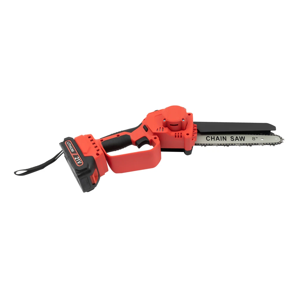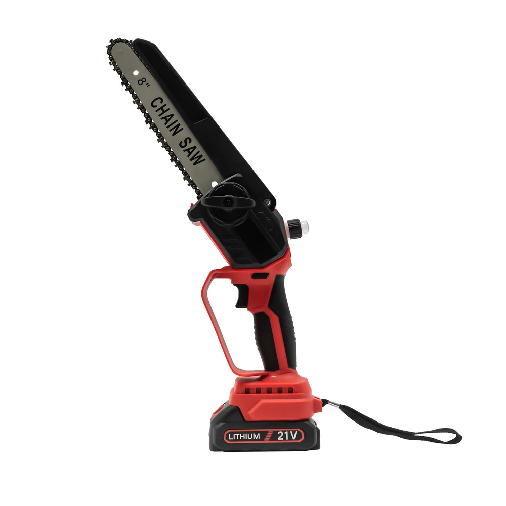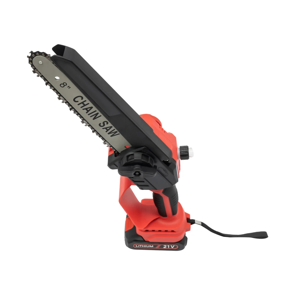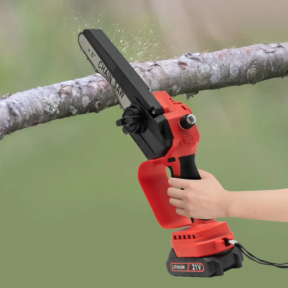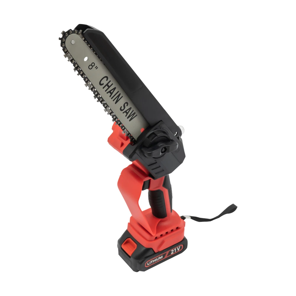 Mini Chainsaw Cordless 8 8 Inch Electric Chain Saw 800W With 2 Battery Power US DESCRIPTION 1 Description Say goodbye to heavy gasoline saws and laborious pull saws, and you can choose our mini cordless chainsaw for improving efficiency in pruning, wood cutting, and gardening. This product boasts high quality and provides a great cutting effect, all while featuring a lightweight and compact design. With a battery-powered power source, it can be conveniently used for outdoor operations, emergencies, and in locations without access to sockets. Whether you are a master carpenter or an occasional DIY tool-seeker, this product can bring you a wonderful experience! Key Features Premium Material: This product consists of high-quality PVC housing and steel guide plate&chain with a quenching treatment, effectively reducing wear and making it high-strength, anti-rust, and durable. Durable Battery: The two 2000mAh lithium-ion batteries with over-charge and overload protections can provide longer battery life without frequent charging and worrying about insufficient electricity that affects your work. The equipped charger can help recharge the two batteries to save money and energy. Cordless Chainsaw: The battery-powered&cordless design and slim handle enable you to use this chainsaw with one hand for cutting at different angles anytime and anywhere, which is very convenient, flexible, and lighter. Efficient Heat Dissipation: The heat-sink holes on the machine ensure good heat dissipation so that the heat during operation can be discharged at a faster speed to protect the motor from being burned out due to long-term use. Great Performance: Adopting a copper wire brushless motor with overload protection function, smooth bearing, and enlarged cooling fan, along with the metal gearbox, this chainsaw has high speed(5500rpm)&high efficiency and can realize continuous use with less vibration and maintenance. Powerful Function: Thanks to the high-quality guide plate with the adjustment knob that makes the chain rotate smoothly, and a high-strength chain with a quenching process and wooden teeth design, this chainsaw can achieve a large cutting diameter (8") and fast chain speed(800m/min) and provide you with pruning, sawing, and logging functions, saving you time and effort. Safe and Reliable: The durable safety lock and switch trigger give you double insurance to avoid accidental start. You should first press the safety lock and then pull the trigger to start the chainsaw. Moreover, the hand splash guard prevents wood chips and sparks from splashing, thus protecting the user's safety. Easy to Install&Use : With the simple structure, complete accessories, and English manual, you can install, disassemble, and use the cordless chainsaw easily. Even the elderly and women can easily operate and control. Convenient Storage&Carrying: The detachable design, portable case, and 6.5 lbs lightweight allow for convenient and effortless storage and carrying. It can be an excellent tool for ladder work, and you can take it with you when going outdoors. Stylish Appearance: The textured surface, smooth lines, and versatile black color with a little fresh red embellish give this machine a stylish, cool, and modern appearance, bringing you a good mood when working. Ideal Gift: With a fashionable style, portable design, and powerful functions, this chainsaw is an excellent gift to your father, friends, etc. for various holidays such as Christmas, Father's Day, and birthdays. Easy to Clean: Because of its smooth surface, you can wipe the dirt from this machine with a wet cloth. Details Protective Baffle: The protective widening baffle with a 90° rebound angle reduces workpiece debris splashing and protects you from injury during cutting. Ergonomic Handle: The ergonomic handle with soft rubber coating has textured skin, gives you a comfortable grip without slipping, absorbs shock, and reduces hand fatigue even in long-time use. It is easy to control to achieve a good balance and high-cutting performance. Chain Adjustment Bolt: It makes the replacement and installation of the chain and the adjustment of the tightness of the chain convenient and quick. Hanging Rope: The hanging rope on the chainsaw ensures easy carrying, prevents the chainsaw from falling, reduces fatigue, and is convenient to use. Manual Oiler: It can provide necessary lubrication for the chain, extend its service life, increase the safety of use, and protect the chainsaw. Application It is widely used in gardens, parks, farms, ranches, orchards, greenhouses, etc., and can be used for forest harvesting, cutting wood, pruning branches, gardening, home woodworking, bamboo sawing, logging, DIY crafts, and so on. How to Assemble Prepare the tools. Remove the cover. Install the chain on the guide plate. Please pay attention to the direction of the chain. Install the guide plate and the chain on the chainsaw, align the small holes, and then install the chain on the gear. Cover and Screw on. Adjust sprocket tension. Tighten the nut. Install the battery, check if the safety lock is locked, and then you can use it. Specifications Color: Black, Red Material: PVC, Steel Processes: Quenching, Rubber Coating Case Technique: Blow Molding Style: Modern Function: Cutting Motor Type: Copper Wire Brushless Motor Power Source: Battery Powered Number of Batteries: 2 Battery Technology: 5* Lithium-Ion (Li-Ion) Battery Capacity: 2000mAh Charging Time: About 3H Standby Time: About 20Min Charger Model: TZ-C30AE Plug: US Standard Charger Input: 100-240V, 50/60Hz, 1.0A Charger Output: 21-98V, 1000mAh Chainsaw Voltage: 21V Power: 800W Motor Speed: 5500rpm Chain Speed: 800m/min Baffle Rebound Angle: 90° Power Cord Length: 1m/3.28ft Cutting Diameter: 20cm/8inch Guide Plate Length: About 20cm/8inch The Single Side Length of the Chain: About 22cm/9inch Chainsaw Size(L*H): 11.5*58cm/4.5*22.8inch Portable Case Size: 48*13*19cm/18.9*5.12*7.5inch Each Battery Weight: 0.3kg/0.66 lbs Net Weight: