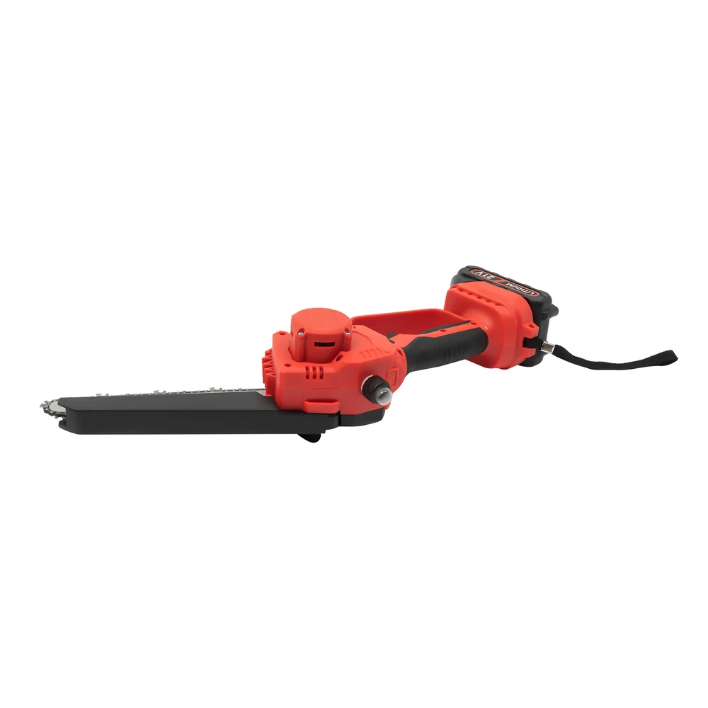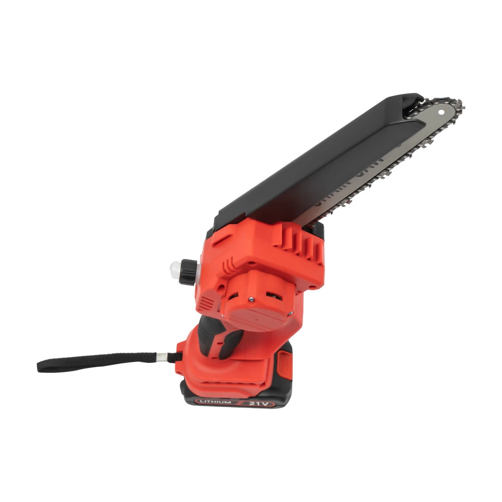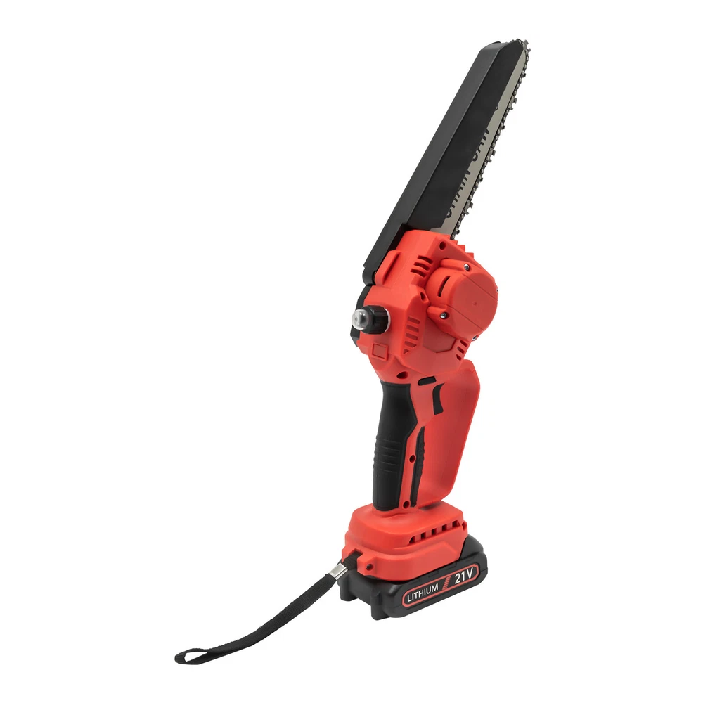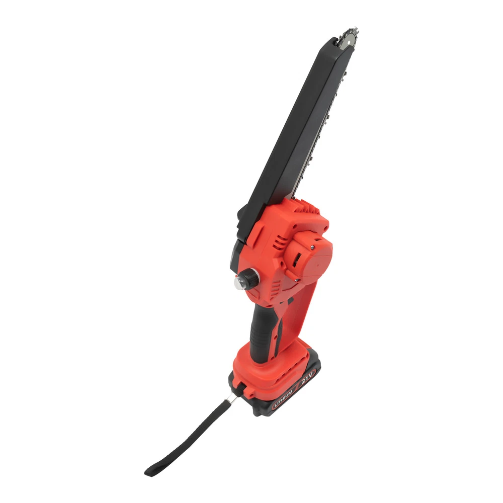 Mini Chainsaw Cordless 8 8 Inch Electric Chain Saw 800W With 2 Battery Power US DESCRIPTION 1 Description Say goodbye to heavy gasoline saws and laborious pull saws, and you can choose our mini cordless chainsaw for improving efficiency in pruning, wood cutting, and gardening. This product boasts high quality and provides a great cutting effect, all while featuring a lightweight and compact design. With a battery-powered power source, it can be conveniently used for outdoor operations, emergencies, and in locations without access to sockets. Whether you are a master carpenter or an occasional DIY tool-seeker, this product can bring you a wonderful experience! Key Features Premium Material: This product consists of high-quality PVC housing and steel guide plate&chain with a quenching treatment, effectively reducing wear and making it high-strength, anti-rust, and durable. Durable Battery: The two 2000mAh lithium-ion batteries with over-charge and overload protections can provide longer battery life without frequent charging and worrying about insufficient electricity that affects your work. The equipped charger can help recharge the two batteries to save money and energy. Cordless Chainsaw: The battery-powered&cordless design and slim handle enable you to use this chainsaw with one hand for cutting at different angles anytime and anywhere, which is very convenient, flexible, and lighter. Efficient Heat Dissipation: The heat-sink holes on the machine ensure good heat dissipation so that the heat during operation can be discharged at a faster speed to protect the motor from being burned out due to long-term use. Great Performance: Adopting a copper wire brushless motor with overload protection function, smooth bearing, and enlarged cooling fan, along with the metal gearbox, this chainsaw has high speed(5500rpm)&high efficiency and can realize continuous use with less vibration and maintenance. Powerful Function: Thanks to the high-quality guide plate with the adjustment knob that makes the chain rotate smoothly, and a high-strength chain with a quenching process and wooden teeth design, this chainsaw can achieve a large cutting diameter (8") and fast chain speed(800m/min) and provide you with pruning, sawing, and logging functions, saving you time and effort. Safe and Reliable: The durable safety lock and switch trigger give you double insurance to avoid accidental start. You should first press the safety lock and then pull the trigger to start the chainsaw. Moreover, the hand splash guard prevents wood chips and sparks from splashing, thus protecting the user's safety. Easy to Install&Use : With the simple structure, complete accessories, and English manual, you can install, disassemble, and use the cordless chainsaw easily. Even the elderly and women can easily operate and control. Convenient Storage&Carrying: The detachable design, portable case, and 6.5 lbs lightweight allow for convenient and effortless storage and carrying. It can be an excellent tool for ladder work, and you can take it with you when going outdoors. Stylish Appearance: The textured surface, smooth lines, and versatile black color with a little fresh red embellish give this machine a stylish, cool, and modern appearance, bringing you a good mood when working. Ideal Gift: With a fashionable style, portable design, and powerful functions, this chainsaw is an excellent gift to your father, friends, etc. for various holidays such as Christmas, Father's Day, and birthdays. Easy to Clean: Because of its smooth surface, you can wipe the dirt from this machine with a wet cloth. Details Protective Baffle: The protective widening baffle with a 90° rebound angle reduces workpiece debris splashing and protects you from injury during cutting. Ergonomic Handle: The ergonomic handle with soft rubber coating has textured skin, gives you a comfortable grip without slipping, absorbs shock, and reduces hand fatigue even in long-time use. It is easy to control to achieve a good balance and high-cutting performance. Chain Adjustment Bolt: It makes the replacement and installation of the chain and the adjustment of the tightness of the chain convenient and quick. Hanging Rope: The hanging rope on the chainsaw ensures easy carrying, prevents the chainsaw from falling, reduces fatigue, and is convenient to use. Manual Oiler: It can provide necessary lubrication for the chain, extend its service life, increase the safety of use, and protect the chainsaw. Application It is widely used in gardens, parks, farms, ranches, orchards, greenhouses, etc., and can be used for forest harvesting, cutting wood, pruning branches, gardening, home woodworking, bamboo sawing, logging, DIY crafts, and so on. How to Assemble Prepare the tools. Remove the cover. Install the chain on the guide plate. Please pay attention to the direction of the chain. Install the guide plate and the chain on the chainsaw, align the small holes, and then install the chain on the gear. Cover and Screw on. Adjust sprocket tension. Tighten the nut. Install the battery, check if the safety lock is locked, and then you can use it. Specifications Color: Black, Red Material: PVC, Steel Processes: Quenching, Rubber Coating Case Technique: Blow Molding Style: Modern Function: Cutting Motor Type: Copper Wire Brushless Motor Power Source: Battery Powered Number of Batteries: 2 Battery Technology: 5* Lithium-Ion (Li-Ion) Battery Capacity: 2000mAh Charging Time: About 3H Standby Time: About 20Min Charger Model: TZ-C30AE Plug: US Standard Charger Input: 100-240V, 50/60Hz, 1.0A Charger Output: 21-98V, 1000mAh Chainsaw Voltage: 21V Power: 800W Motor Speed: 5500rpm Chain Speed: 800m/min Baffle Rebound Angle: 90° Power Cord Length: 1m/3.28ft Cutting Diameter: 20cm/8inch Guide Plate Length: About 20cm/8inch The Single Side Length of the Chain: About 22cm/9inch Chainsaw Size(L*H): 11.5*58cm/4.5*22.8inch Portable Case Size: 48*13*19cm/18.9*5.12*7.5inch Each Battery Weight: 0.3kg/0.66 lbs Net Weight: