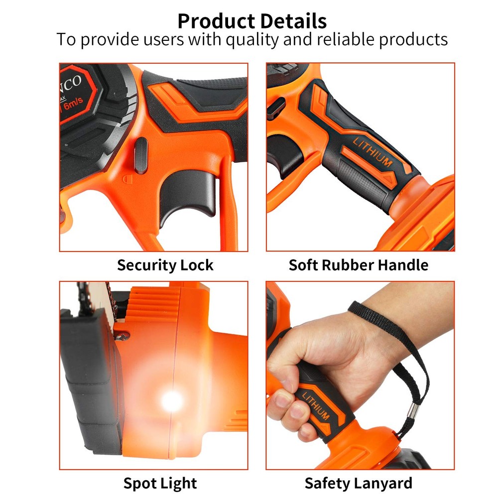 The 0.78kg (1.76 lb) lightweight, portable and safe design is the most important feature of this mini chainsaw. Say goodbye to heavy gasoline saws and laborious pull saws, this is an excellent choice for improving efficiency in tree top pruning, wood cutting and gardening. is committed to improving work efficiency for users. Whether you are a master carpenter or an occasional DIY tool-seeker, this product can bring you a wonderful experience. 【One-Hand and Lightweight】This mini chainsaw just about 0.8kg(1.76lbs) in weight and 13-inch long. It is easy to use for women and the elderly, and will not feel tired after a long time of use. This electric chainsaw is very suitable for treetop pruning, woodcutting, and gardening. The upgraded lanyard and spot light functions work with users in more scenarios. 【Power Cutting】The mini chainsaw cordless is powered by a 21V, 2.0Ah high-energy lithium battery and can work for 50-60 minutes. The powerful motor speed is up to 6m/s, and the output power of 550w can cut logs with a diameter of 4-inch in 5s. The deep quenched chain and the step-less speed control switch can achieve fast and smooth cutting without jamming and bark damage. 【Safe and Reliable】4 security measures to ensure that the battery chainsaw has reliable safety: ①With a security lock to prevent children from mistouch. ② Baffles prevent debris splash. ③Rubber grip improves slip resistance and comfort. ④When the temperature reaches 200°F, the motor automatically stops working to provide protection. 【Quality Accessories】In order to improve user experience, this small handled power chain saws is equipped with 2Pcs battery, 2Pcs guide plate, and 2Pcs chain. In addition, it also provides gloves, cleaning brush, oil bottles, screwdrivers, wrenches and a detailed manual in English, is very suitable as a gift to friends, DIY lovers, fathers, woodworker, craftsman. 【Easy to Install and Maintain】The electric chainsaw has been installed, you only need to fully charge the battery before you use it. Equipment maintenance only needs simple oiling and wiping, does not need to wash with water. If you have any questions during use, please contact us and we will reply within 24 hours.