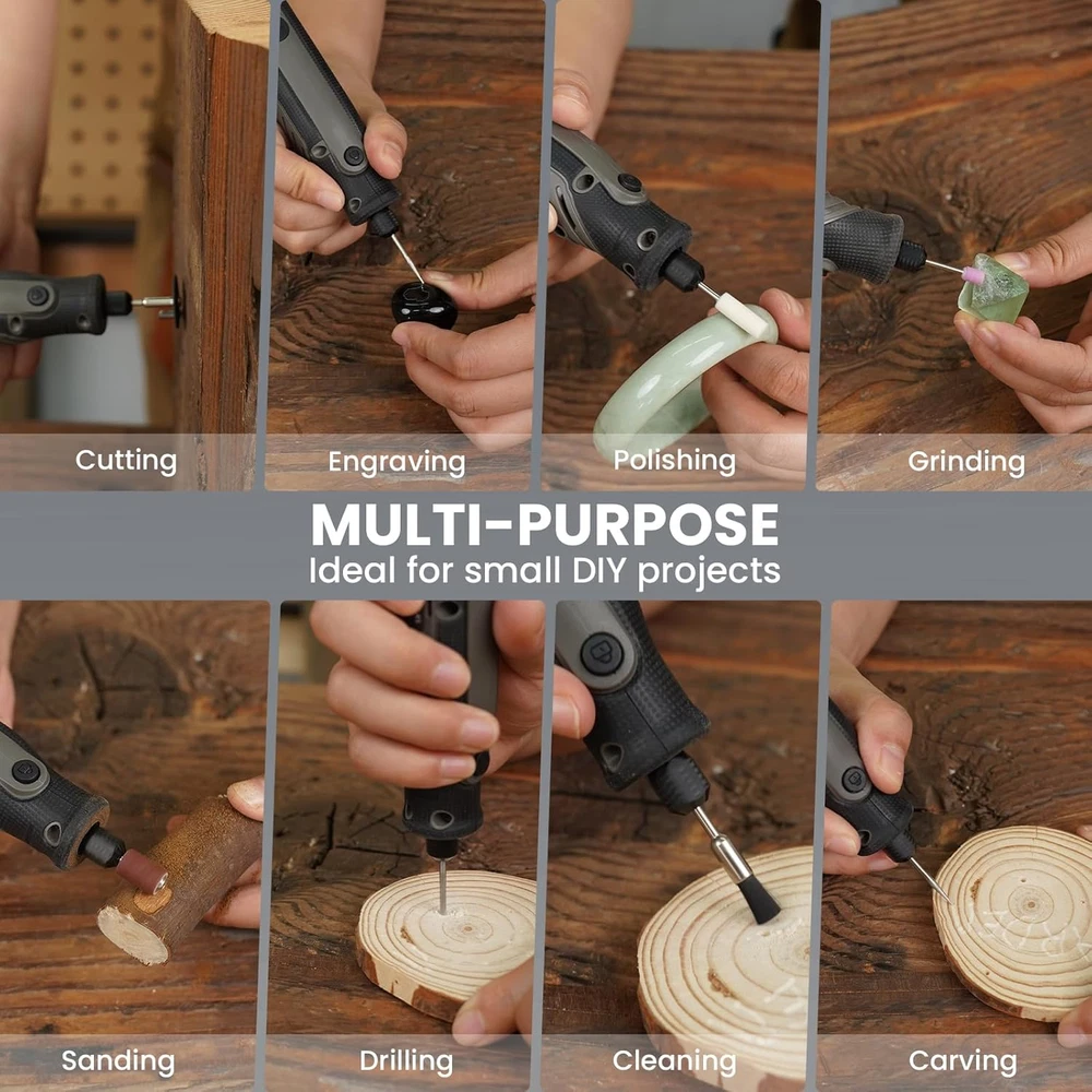 【More Beautiful than Traditional Electric Grinders】HARDELL mini cordless rotary tool uses a display screen, which can quickly read the current speed gear even in a backlight or extremely bright environment, making your DIY project smoother. The display screen also makes the present you give is more unique. 【Multifunctional Tool for DIY Craft Kit】Cordless Rotary Tool Kit is equipped with 69 accessories, and comes with three chuck sizes of 1.6/2.3/3.2mm. which allows you to smoothly in plastic cutting, wood carving, metal/glass engraving, jewelry polishing, seashell drilling, and other small household DIY crafts. 【Switch easily 5 Speeds】Rotary tool has 5-speed settings (5000/8000/11000/14000/18000RPM). The finer speed allows you to easily adjust the speed according to different usage scenarios. It is easy to operate and can be switched with one click, even for beginners. ▶Long press the button to close the rotary tool. 【Small Body, Easy to Control】 Mini rotary tool is 6.5 inches and 0.35 pounds, anyone can hold it easily for detail work. The body is made of dotted anti-slip rubber, allowing you to create art without feeling tired or sore in your arms. 【Fully charged in 1h~2h by USB Charging】Rotary tool kit is equipped with a 4V rechargeable battery and a TYPE-C charging cable, which can be used with a variety of charging plugs, so you don’t have to worry about losing it, and being unable to charge. Product Description The video showcases the product in use. The video guides you through product setup. The video compares multiple products. The video shows the product being unpacked. The Rotary Tools are suitable for small household tasks, and overload protection measures will be activated when operating large DIY crafts. Clean up dust and sawdust, do not clean up rust. 1 Sanding 2 Grinding 3 Cutting 4 Engraving 5 Cleaning Mini Rotary Tool display help read battery status Mini Rotary tool display help read the RPM