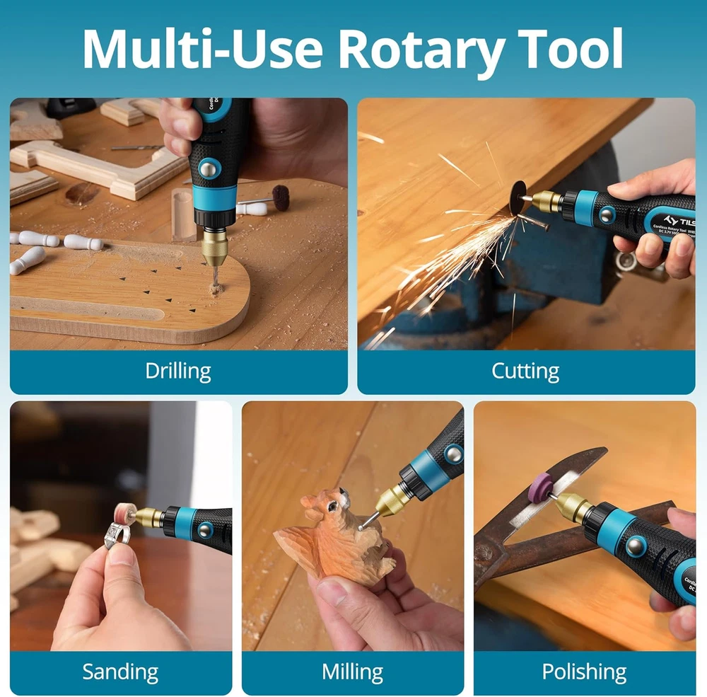 【Cordless Rotary Tool】With our cordless rotary tool, you can work freely anytime, anywhere, and easily say goodbye to tangled cords and restricted movement. 【Lightweight & Comfortable Design】Tilswall 3.7V rotary tool weighs only 0.26 pounds, the lightweight design can effectively reduce hand fatigue. The size is compact and mini, and the hand grip part is designed with soft rubberized cover for a comfortable grip. 【Multifunctional Rotary Tool Set】This rotary tool set has 82 accessories for carving, cutting, drilling, sanding, polishing and many DIY projects. 【3 Speed Settings】 The mini rotary tool has 3 speeds ranging from 5,000 rpm to 15,000 rpm to meet your DIY needs at all stages of creation. Choose the right gear and you are ready to start your fine work. 【Long Battery Life】Our cordless rotary tool is powered by a long-lasting battery that ensures uninterrupted operation. You can enjoy unlimited creative fun! Product Description