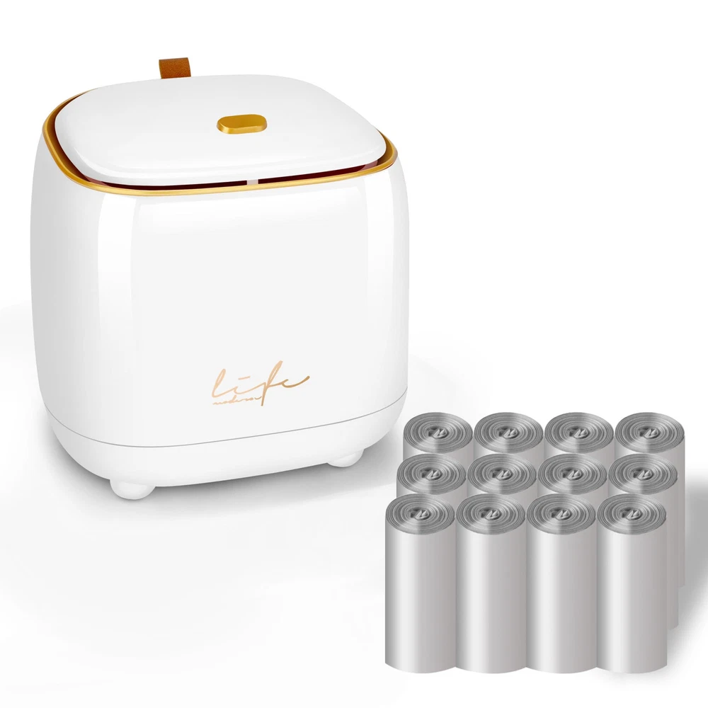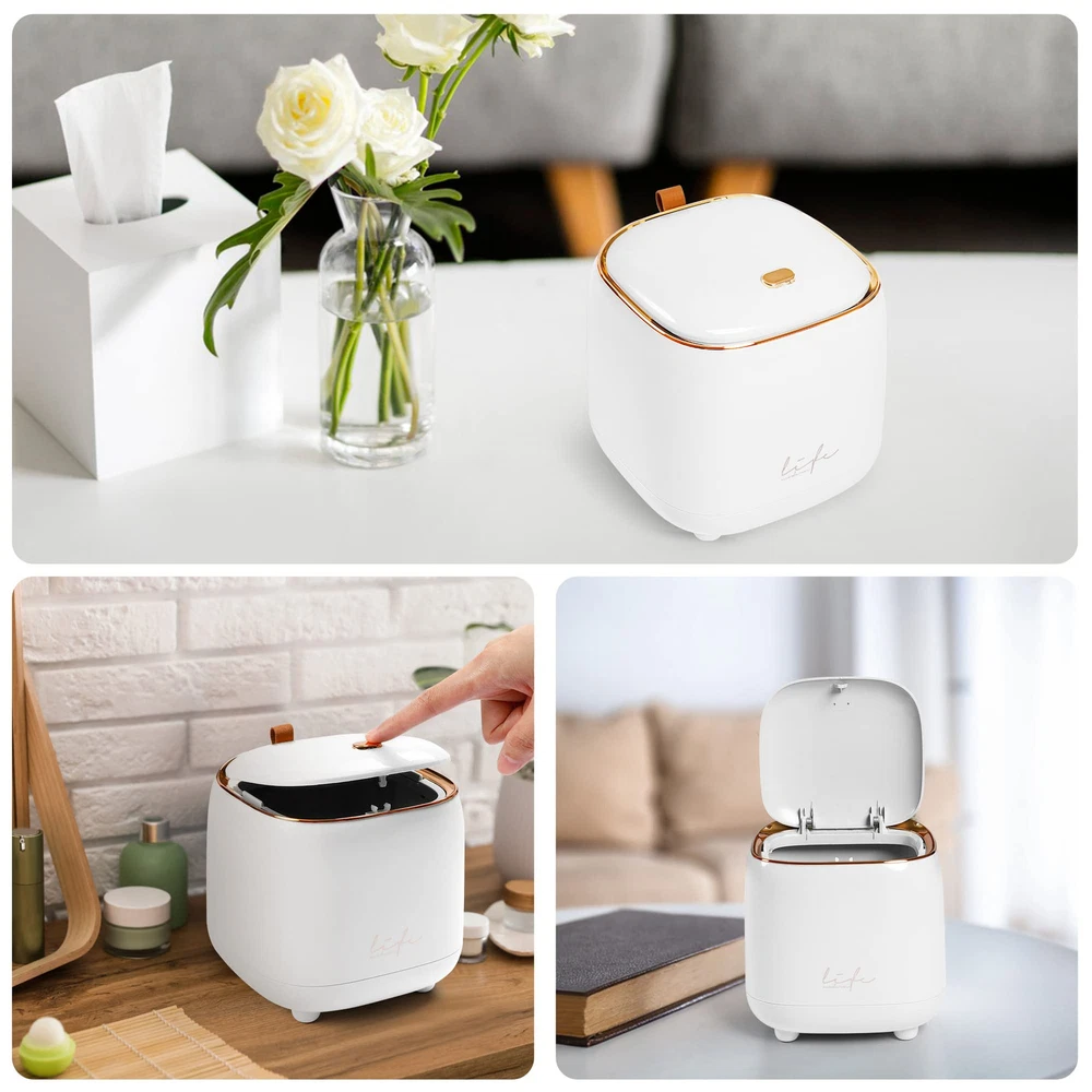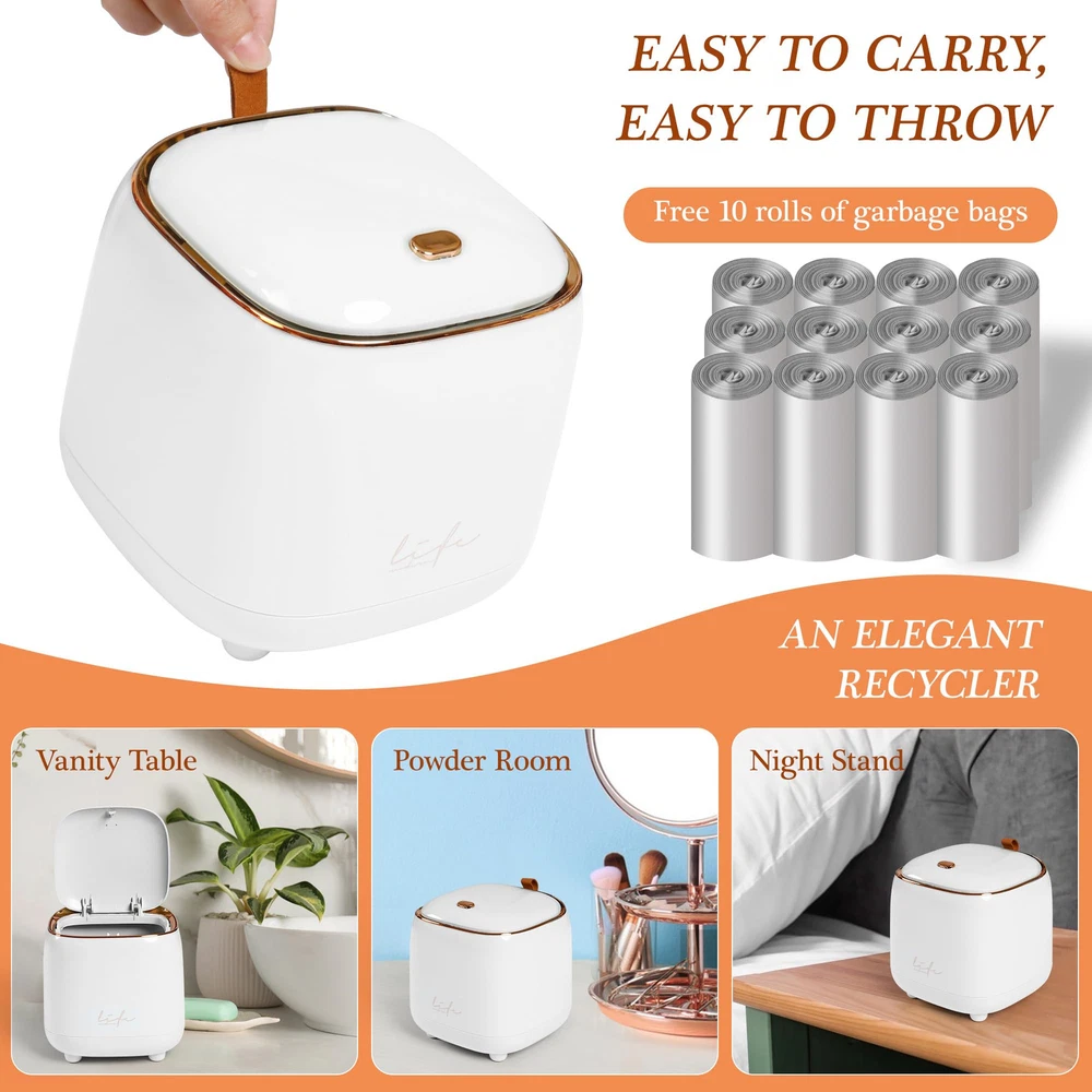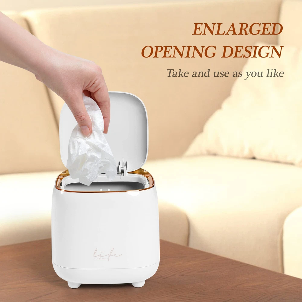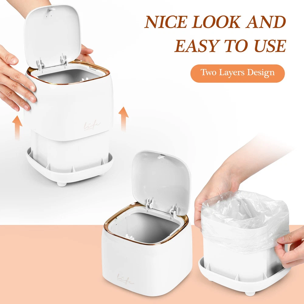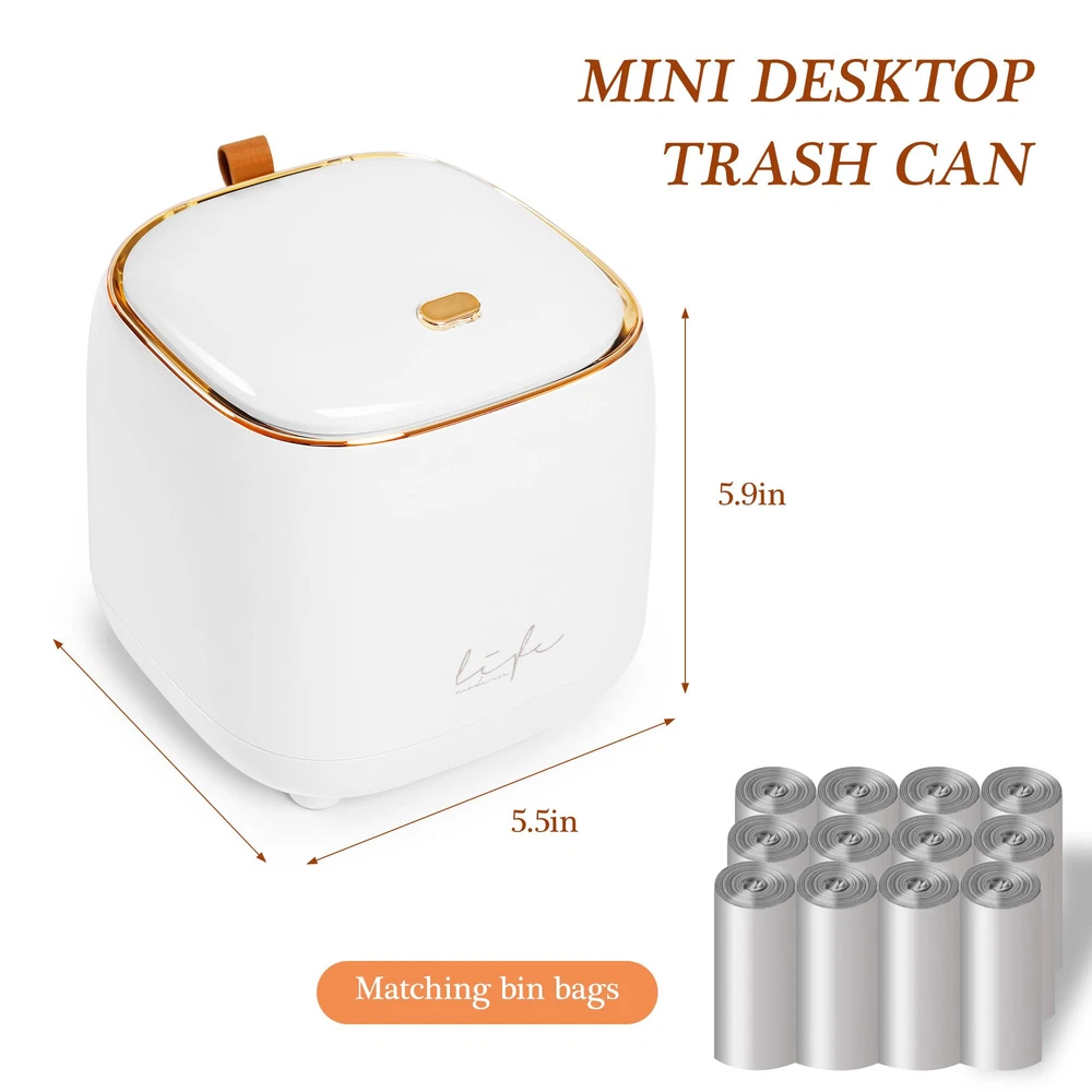 Mini Desktop Trash Can * This is an absolutely adorable countertop trash can * It is possibly for a desk or even for kitchen waste * It is a high quality nice little bin for cosmetic waste * This would be a great solution for a bathroom- small waste like q-tips, cotton balls, tissues, etc * This is good for desk in our room where we always have little bits of trash like post-its and staples * the blue one, which is more of a light blue-green, almost celeste color * Super solid construction * It is cute and tidy and easy to use. Dimensions: 5.5" in diameter and 5.9" in heights. Capacity: 1.5 L / 0.40 Gal. Please pay attention to the product size!!! It' s just like a 1.5 liter cup. These Desktop Trash Cans Are Easy to use, stylish and unique. Cute and beautiful to decorate your home or Office, It Will Make Your Space More Neat and Hygienic, the Stylish Look Can Also Decorate the Room or Table, So This Trash Can is Sure to Be a Great Helper. With high quality and durable quality materials. Lid Design to Prevent the Spread of Odors. Detachable Bucket Body for Easy of Garbage Bags. It also comes with 10 rolls of trash bags, which should last quite a while. THOUGHTFUL DESIGN-Press the lid design to effectively avoid odor overflow, sealed and anti-odor, prevent the trash from pouring out, the trash is not exposed, cover the lid to prevent the odor from emitting, allowing you to better enjoy the convenience of this mini tabletop trash can. PRACTICAL DESIGN- The outer cylinder and the inner cylinder adopt a snap-on design, which is easy to remove the garbage bag or wash with water, keep clean wherever you go. DESKTOP TRASH CAN DIMENSIONS-Height: 1.5l / 0.4 Gal Mini Countertop Trash Can, Length*width*height: 14.5*14.5*15cm(5.5"*5.5"*5.9" Inch), 12 rolls of matching garbage bags will be sent upon order. meet your daily storage needs and keep your desktop, bedRoom, bathroom,livingroom,office tidy everyday. DURABLE-Mini desktop trash can made of ABS materials, BPA-free, smooth inside and out, easy to clean and wash. These stylish desktop or desk trash cans are perfect for any home or office, It will make your space more neat and hygienic, the fashion appearance can also decorate the room or desk, So this trash can must be a good helper. Package includes: 1 press-on desktop mini waste container (white ) + 12 rolls of matching size waste bags