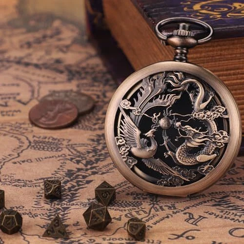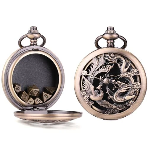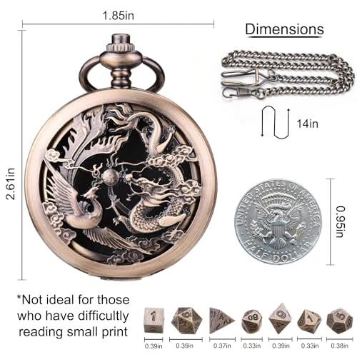 Return Policy Fast Delivery Trusted seller Mini D&D Dice Set DND Pocket Watch Shell 7PCS Micro Polyhedral Dice Set Metal Dice Dungeons and Dragons Gift Accessories Bronze Product Description Mini D&D Dice Set for DND Player - 7pcs tiny metal DND dice are easy to carry. Ideal Dice Case - All D&D dices are put in a hollow Dragon & Phoenix pocket watch case, which can be worn with a necklace or pocket watch chain as you wish, stylish and portable. DND Gifts for DND Lovers - This D&D Dice Set is sure to be loved by the Dungeons & Dragons, Warhammer, Baldur's gate enthusiast or dnd starters! Dimension - 0.33~0.39'' D4~D20 zinc alloy dice, 1.85'' diameter dice case, 14'' stainless steel pocket watch chain, 27'' stainless steel necklace. Shipping Returns Payment Shipping Shipping is FREE to all addresses other than APO/PO boxes in the lower 48 states. All our stock ships from US-based warehouses. Shipped via USPS or UPS (depending on location and package weight) Unless stated otherwise, all orders will ship within 24-72 hours of your payment being processed. Check our feedback to see the great reviews of FAST shipping we offer. Returns Seller does not accept returns Payment We currently accept payment via eBay managed payments only. Once payment is cleared, we will dispatch your shipment within 1-3 business days. Please refer to the "Shipping" tab for more information regarding shipping speed to your destination.