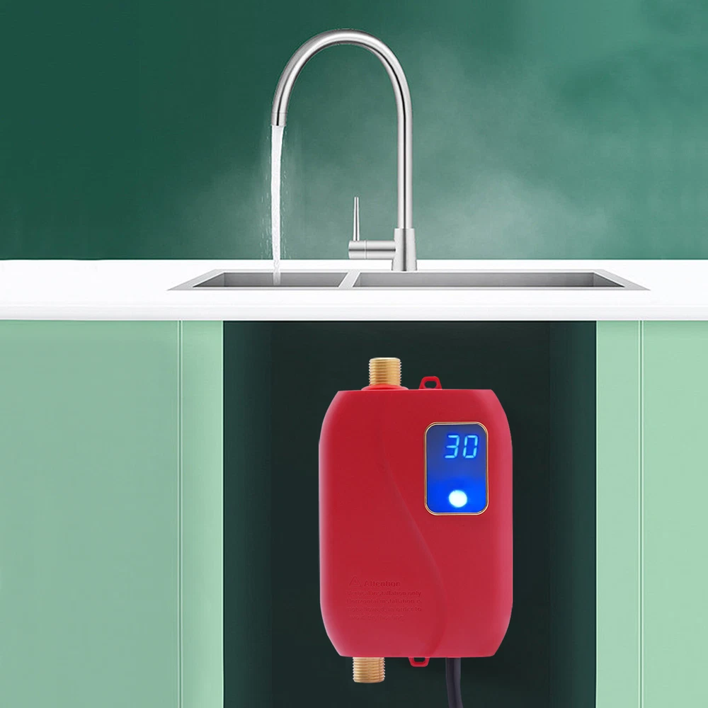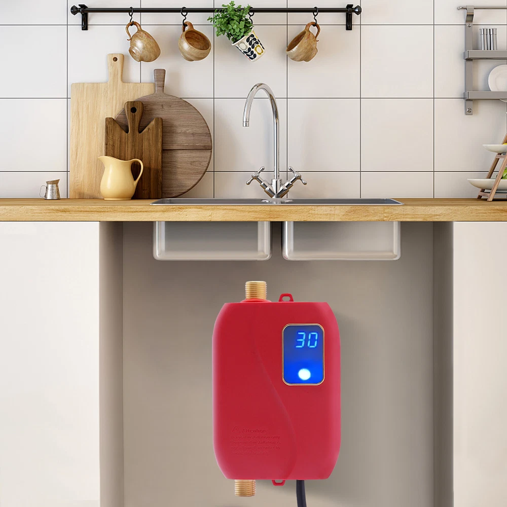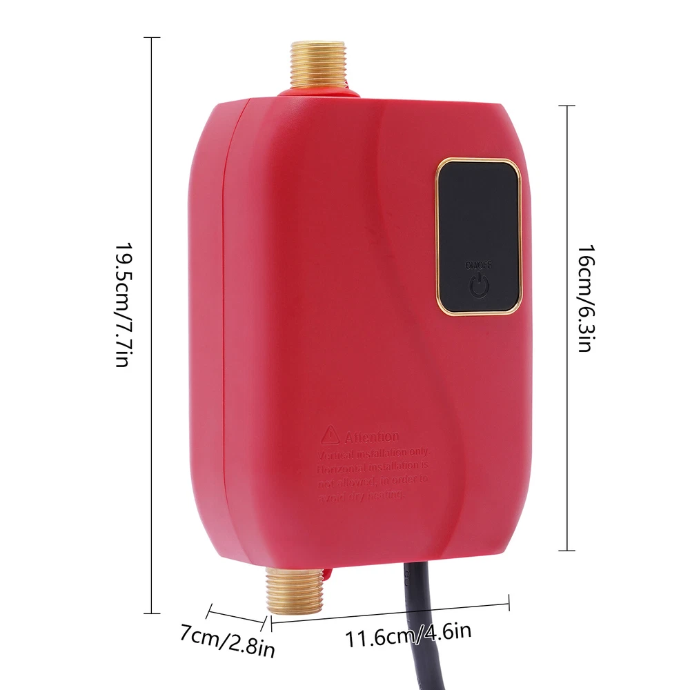 Specifications Model: XY-FC Color: Red Style: Modern Shape: Rectangle Material: Brass, ABS, 304 Stainless Steel, 316L Stainless Steel Surface Treatment: Pickling Plug: US-Standard Power Source: Corded Electric Water Inlet Mode: Bottom Water Inlet Mounting Type: Wall-Mounted, Floor-Mounted, Under Sink Temperature Regulation Range: 20-50°C/68-122°F Power Cord Length: 1.05m/3.44ft Assembly Required: Yes Number of Items: 1 Power: 3000W Voltage: AC 110V Frequency: 50-60Hz Waterproof Level: IPX4 Water Pressure: 0.04-1.2MPa Wire Request: Wire Cross Section ≥2.5mm²/0.0038in² Suggest Minimum Reserved Installation Space: 30*30*25cm/11.81*11.81*9.84in Gross Weight: 1.1kg/2.42lbs Net Weight: 0.95kg/2.1lbs Product Size: 11.6*7*19.5cm/4.57*2.8*7.68in Tank Length: 16cm/6.3in Package Size: 23.5*9.5*18.5cm/9.25*3.74*7.28in Package Included 1*Water Heater 1*English Manual All Accessories for Assembly Notes Please carefully read the manual and strictly follow the precautions to have a better experience. Please note that this product only supports vertical installation, as horizontal installation may cause dry burning. And ensure to add water before connecting to the power supply during the first use. This product is recommended to be connected with wires with a cross-sectional area of ≥ 2.5 square millimeters, and connected to trip switches of over 32a for use. If the water flow decreases, please check if the filter element is blocked. Please allow the slight color difference caused by the shooting light and 1-3cm error due to manual measurement, and make sure you do not mind before you order. Application It is very suitable for installation in small residential areas, garages, offices, sinks, kitchens, apartments, bathrooms, RVs, terrace sinks, and other areas that require hot water but have limited space. It is suitable for different water pressures in different regions and can also be used in high-rise households. High Efficient: With the joint efforts of a 3000W power and a fast thermal conductivity heating pipe, it can provide you with uninterrupted hot water within 3-5 seconds of the faucet being turned on. Clear Temperature: When turned on, you can long press the power button for 6 seconds to set the unit between Fahrenheit or Celsius degrees, allowing people accustomed to different units to quickly determine the current temperature.
