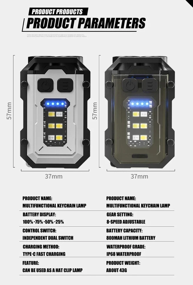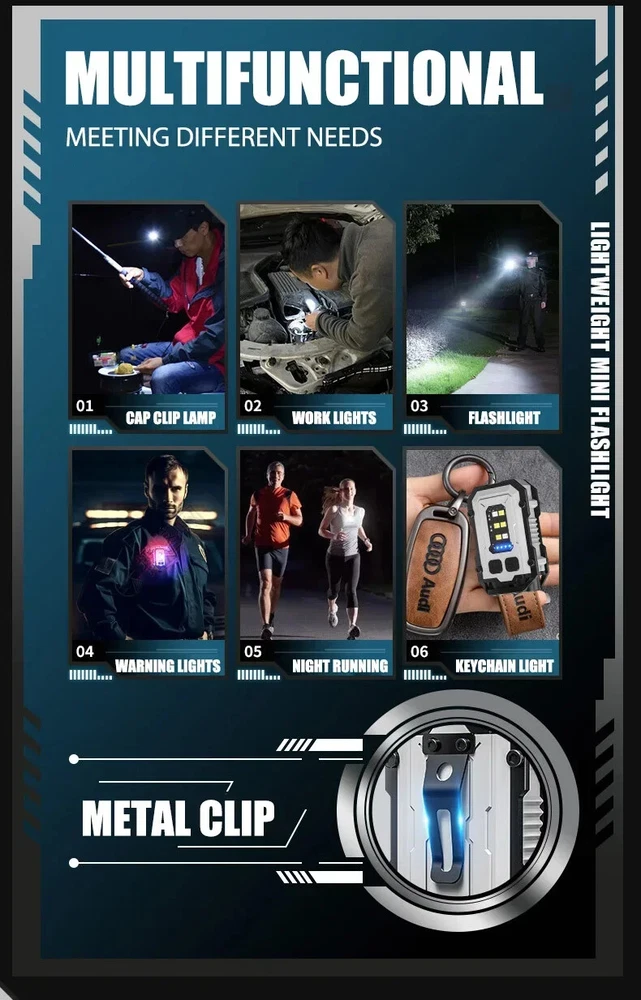 Product Description 【Super Bright Keychain Flashlight】 This clip flashlight has dual LED main lights that can produce up to 500 lumens. Lighting distance exceeds 98 feet/30 meters. IP65 waterproof, you can use it even when it rains (Please note: it cannot be immersed in water). Press and hold the switch for 2 seconds to turn it on, then press the button to switch the lighting mode. Press and hold for 2 seconds to turn it off. 【8 Modes Light Sources】 This keychain flashlight has 8 light modes. 4 Types of main lights: single source/strong light, single source/low light, dual source/strong light, dual source/low light. 4 Types of COB side lights: white /strong light, white/low light, red light, red and blue flashing light. Besides, the main light and COB light can work at the same time. Multiple light modes to meet your various needs. 【Lightweight & Compact Flashlight】 This clip on EDC flashlight has a mini body and a 2.4oz/43.5g weight. It can be hung on your keychain, very convenient for daily carry. The shell of the light is fixed with an aluminum alloy, which is very sturdy and shock-resistant. It is the perfect flashlight for daily use or emergency use. 【Extremely Long Working Hours】 This mini flashlight is powered by a rechargeable 750mAh lithium battery, which can provide ultra-long working time. Besides, this keychain light uses USB C fast charging (charging cable included) and can be fully charged in as soon as 2 hours. Moreover, the pocket light has battery indicator lights, which allow you to quickly know the remaining power. No longer worry about battery when you are outdoors. 【Magnetic & Clip on Flashlight】 This flashlight has a powerful clip on the back, which can be clipped on hats, clothes, and bag straps. Great for night running, hiking, exploring, fishing, camping, and more. It can also be used as a warning light for dog walking at night. There is a strong magnet at the tail, which can be used as vehicle repair lighting or as a warning light in emergencies. This flashlight also has a keychain hole, so you can hang it on your keys and take it with you every day. package include: 2 X Mini keychain flashlight 2 X Charging cable Payment Returns Contact Us Shipping Feedback 1. We only accept eBay payments. 2. All payments must be made within 3 days after auction won. Item may be returned for refund or replacement within 30 days of the purchase date. Returned merchandise must be unused, in original packaging and include all accessories. Shipping costs are non-refundable. Please do not hesitate to leave us your 5 Star ★★★★★ of DSR positive feedback if you are satisfaction with our products ,delivery or services . If you have Any Questions Or Unsatisfied with your purchase, please Email us firstly to get a better solution before you leave a neutral or negative feedback, we work hard to make sure every customer 100% satisfied and resolve anyproblem for you. Please email us first in the following situations: 1.The item can't work properly. 2.The item broken on the post. 3.You bought or received the wrong items. 4.You have not received your shipment within the period. 5.Before you give us Negative feedback. 6.Before you open a case/return on eBay. All questions will be replied within 24 hours (Except Saturday and Sunday or holidays). Thank you for your kindness! 1. eBay Payments Confirmed Addresses Only. 2. No Delivery to Alaska and Hawaii or PR. 3. No P.O. Box and APO/FPO Delivery. 4. Tracking Number will be provided. 5. Domestic shipping is within the 48 Contiguous States of United States, the delivery time is between 2 and 8 days. Items will be shipped by UPS, USPS or Fedex within 3 business day after receiving full payment. 6. International shipping is from China, the delivery time is between 10 and 30 working days. As a seller , Positive Feedback is very important to us. We try our best to let our customers to be happy. If you have any question about your order, please contact us ,please let us know before you Leave the Negative feedback ,We are willing to do our best to make up for it, Thank you very much ! Payment 1. We only accept eBay payments. 2. All payments must be made within 3 days after auction won. Returns Item may be returned for refund or replacement within 30 days of the purchase date. Returned merchandise must be unused, in original packaging and include all accessories. Shipping costs are non-refundable. Please do not hesitate to leave us your 5 Star ★★★★★ of DSR positive feedback if you are satisfaction with our products ,delivery or services . Contact Us If you have Any Questions Or Unsatisfied with your purchase, please Email us firstly to get a better solution before you leave a neutral or negative feedback, we work hard to make sure every customer 100% satisfied and resolve anyproblem for you. Please email us first in the following situations: 1.The item can't work properly. 2.The item broken on the post. 3.You bought or received the wrong items. 4.You have not received your shipment within the period. 5.Before you give us Negative feedback. 6.Before you open a case/return on eBay. All questions will be replied within 24 hours (Except Saturday and Sunday or holidays). Thank you for your kindness! Shipping 1. eBay Payments Confirmed Addresses Only. 2. No Delivery to Alaska and Hawaii or PR. 3. No P.O. Box and APO/FPO Delivery. 4. Tracking Number will be provided. 5. Domestic shipping is within the 48 Contiguous States of United States, the delivery time is between 2 and 8 days. Items will be shipped by UPS, USPS or Fedex within 3 business day after receiving full payment. 6. International shipping is from China, the delivery time is between 10 and 30 working days. Feedback As a seller , Positive Feedback is very important to us. We try our best to let our customers to be happy. If you have any question about your order, please contact us ,please let us know before you Leave the Negative feedback ,We are willing to do ou