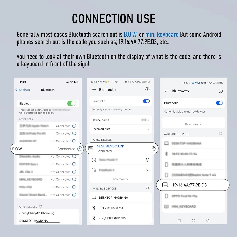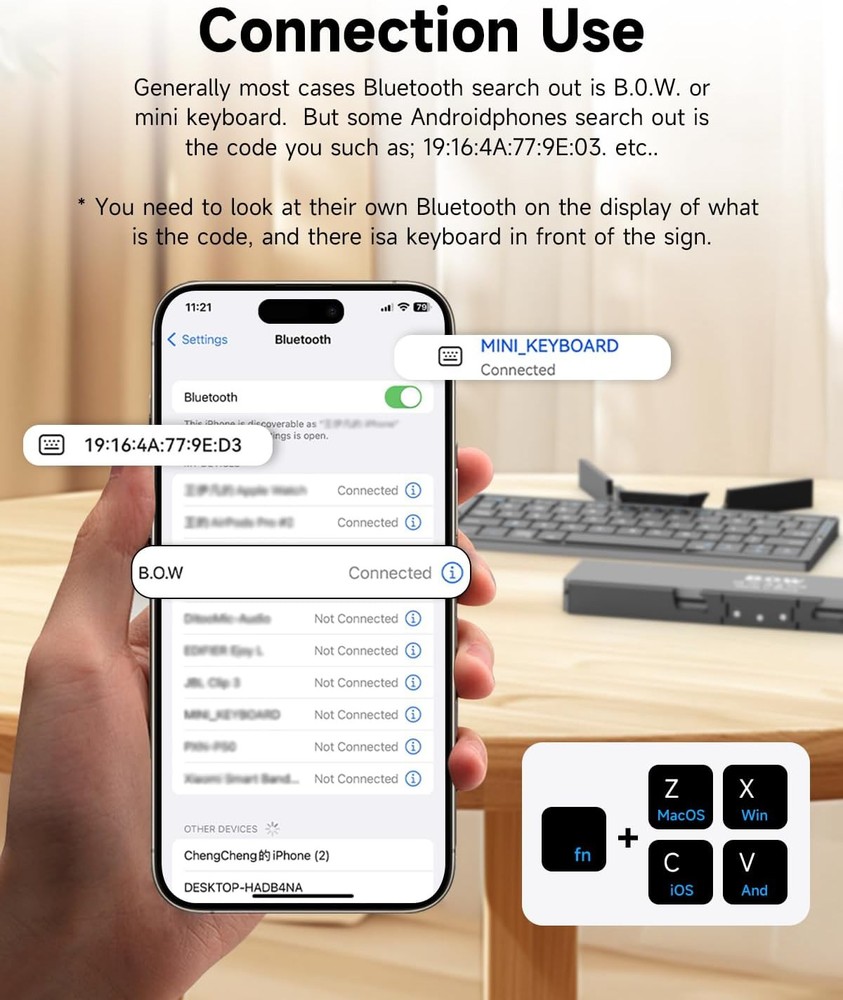 Mini Foldable Bluetooth Keyboard with Magnetic Stand,Aluminum Alloy White Product Details Package Dimensions: 9.33 x 4.33 x 0.94 inches Item Weight: 8.8 ounces Manufacturer: B.O.W Brand: SIKAI CASE Compatible Devices: Laptop, Tablet Connectivity Technology: Bluetooth Keyboard Description: Wireless Recommended Uses For Product: Travel Special Feature: Lightweight,Magnetic,Travel Color: White Number of Keys: 60 Keyboard backlighting color support: Single Color Style: Modern 【Foldable Bluetooth Keyboard with Magnetic Bracket】American Broadcom chip.Ergonomic, foldable Mini Bluetooth keyboard with 60-key format. The touch buttons on the portable keyboard are designed with matte finish to provide a comfortable feel. Horizontal fold, more convenient to hold. With a hidden bracket, there is a place for your equipment to be placed, and it is easy to use.It's a great mini keyboard for elementary and junior high school students with smaller hands. Please note:The maximum size of the iPad supported by the magnetic stand can support 11 inches (11 inches or more are not supported), but support the use of the connection, can not use the stand, please note before purchase! No digital keys, simple keys 60 keys, the mini keyboard because it is a portable bluetooth keyboard, the keys may be slightly smaller, if you have a mind before buying, please note! 【Folding mini Keyboard compatible 】iOS/Windows/Android/ MacOS/HMS Foldable mini keyboard is perfectly compatible with iOS, Android and Windows operating systems for cell phones, tablets, laptops, desktops, and provides stable and fast Bluetooth connectivity. With just one touch, the foldable Mini Bluetooth keyboard can instantly switch between registered devices with scissor-foot structure keys, easy to press without worrying about damage 【160mAh Wireless Rechargeable Foldable mini Keyboard】Built-in rechargeable lithium battery, 2 hours of charging time provides up to 45 hours of continuous typing or up to 90 days of standby time. With a full charge, it is enough for your short business trip or vacation. The foldable mini keyboard also features an energy-saving mode that puts you to sleep after ten minutes of inactivity and wakes you up with a single click. 【Mini Bluetooth Keyboard Includes phone tablet stand】The innovative magnetic folding design fits easily in your handbag, duffel bag or bag. Size when folded together (when folded): 7.97"x1.83"; Open size:7.97"x3.51". Weighing only 250 grams, you can even put it in your jacket pocket and unfold it everywhere: at ICE, in a cafe or on a picnic blanket by the lake.Magnetic bracket (be careful: just suck the role of the bracket, the magnetic force is not very big please do not adsorb other items) 【 How to use After-sales service】: 1. How to use: Keyboard open】 Pairing mode:1,Press Fn and Bluetooth 1/Bluetooth 2/Bluetooth 3 at the same time to put the keyboard into pairing mode. 2, Turn on the Bluetooth on your device.3,Click the name of this keyboard"B.O.W"in the Bluetooth device list. - 4, Once the Bluetooth connection is established, the message "Connected" will be displayed. If you have any questions, please don't hesitate to contact us, we will reply within 24 hours. Please note; when connecting Bluetooth, generally most cases Bluetooth search out is B.O.W. However, some Android phones search out is the code for example; 19:16:4A:77:9E:D3, etc., you need to look at their own Bluetooth on the display of what is the code, and there is a keyboard in front of the sign before you can connect!Not suitable for placing too thick cell phone cases for cell phones and ipads with cases, please note that!