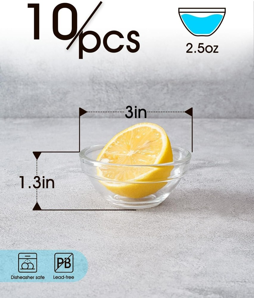 Mini Glass Bowls, 3In 2.5Oz Small Prep Bowl, 10 Pcs Stackable Pinch Bowls for Di About this item: Made You a More Organized Cook: Mini prep bowls is perfect for setting out your ingredients prior to starting cooking, such as small portion of chopped vegetables, herbs, and seasonings, that way you don't forget an ingredient and cut down drastically on mess Great for Personal Dipping Sauces: Measures 3x1.3in, the mini bowl is not too big to crowd your plate but big enough to hold plenty of dip. Each guest can have their own sauce and go to decide how much to use. It's a great presentation move to serve your sauce in a small bowl for a dinner party Great for Reducing Waste: Offering condiments like ketchup, mustard, dips, and so forth in pinch bowls encourages people to use them more efficiently, and looks more aesthetically pleasing Easy to Clean & Stackable: With smooth and nonporous interior, the pinch bowl is easy to clean up by hand or in the dishwasher. Thanks to the wide top and narrow bottom, the bowls can be stacked together very well and are very suitable for small cabinets Clear Glass is Easy to Use: Allows for easy identification of contents and easy to see how much is in it. Besides, it doesn't get those irritating tomato sauce stains or worrying about scratching other surfaces