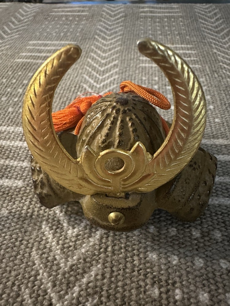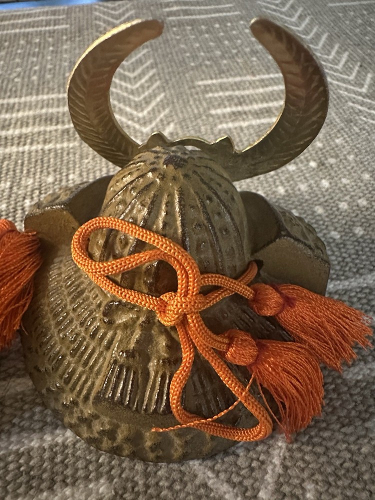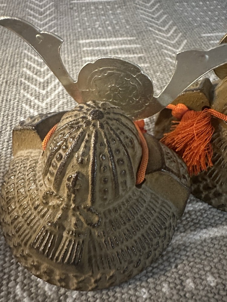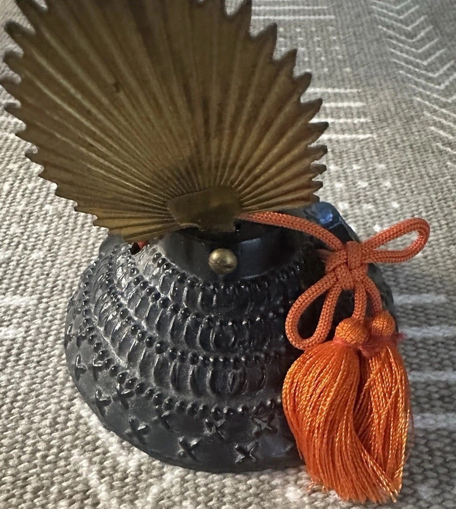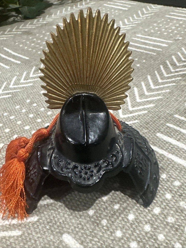 Miniature Japanese Samurai Helmet Kabuto Replica – Cast Iron w/ Brass Crest & Tassels Set of 3 miniature Japanese kabuto (samurai helmets), made from cast iron with decorative brass crests (maedate) and traditional orange tassels. Each helmet features unique detailing inspired by iconic samurai armor. These pieces are commonly used as display items, paperweights, or collectible decor, especially during Kodomo no Hi (Children’s Day) in Japan. Details: • Material: Cast iron (body), brass (crest), synthetic tassels • Origin: Japan (likely 20th century) • Function: Decorative, collectible, or paperweight • Quantity: Sold individually or as a set • Approx. Size: 3” wide × 3–4” tall • Weight: Hefty; each piece is solid metal
