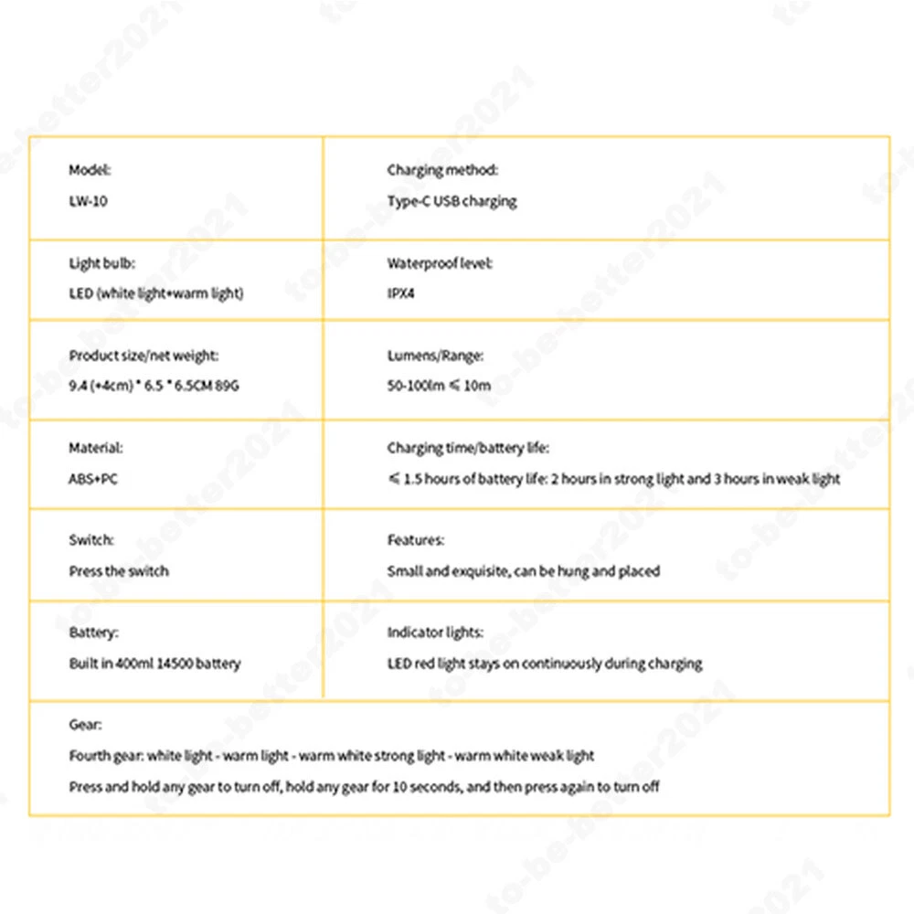 You may also like 2 IN 1 Ozone Plasma Pen Fibroblast Pen Skin Moles Dark Spot Remover Anti-Agings 120.79 USD Free shipping 5 in 1 Analyzer Scalp Care Beauty Equipment Multifunctional Hair Growth Machine 491.29 USD Free shipping 11/13.3/15.6" Notebook Sleeve Laptop PC Case Bag Cover for Macbook HP Waterproof 28.69 USD Free shipping 65W 4 in 1 3A Fast Charging Data Cable Dual Type-C for iPhone Huawei Android 9.87 USD 10.39 USD Free shipping 5% off 360° Battery Motion Sensor Security LED Light NO WIRES Garden Outdoor Indoor USA 12.82 USD 13.49 USD Free shipping 5% off Electrical Change Over Switches 2P 3P 4P Dual Power Automatic Transfer Switch 53.19 USD 55.99 USD Free shipping 5% off Non-invasive 808nm Dual Handle 3 Waveband Laser Picoseconds Hair Removal Machine 2094.46 USD 2204.69 USD Free shipping 5% off 3 Wavelengths 755 808 1064nm nonpain Permanent diode laser hair removal machine 1885.08 USD 1984.29 USD Free shipping 5% off Pocket Action Camera 270-degree Rotation WiFi Vlog Camera 30M Sports Cam 4K HD 59.37 USD 62.49 USD Free shipping 5% off 2 in 1 808nm Double Handled Diode Picosecond Laser Tattoo Hair Removal Machine 2093.41 USD 2203.59 USD Free shipping 5% off 900ml SPE/PEM 99.99% Purity H2 Molecular Hydrogen Inhalation Breathing Machine 1518.76 USD 1598.69 USD Free shipping 5% off Driveway Motion Sensor Alarm -800M Wireless Home Security Entry System Detector 38.29 USD Free shipping Desktop Picosecond Laser 532nm 755nm 1064nm for Tattoo Freckle Removal Machine 4710.09 USD 4957.99 USD Free shipping 5% off 2In1 Portable Dual Handle 808 Diode Picosecond Laser Tattoo Hair Removal Machine 1493.01 USD 1571.59 USD Free shipping 5% off 4/5/6/8KW Power Inverter Pure Sine Wave DC12/24/48/60/72V to AC110V Home RV LCD 151.61 USD 159.59 USD Free shipping 5% off 30X Professional Clear 1P 3P 5P 7P 3FP 5FP 7FP Tattoo Bayonet Cartridge Needles 20.8 USD 21.89 USD Free shipping 5% off SAFE & SECURE SHOPPING 100% SATISFACTION GUARANTEED FAST SHIPPING Store Categories Store Categories Other AU Oversea Warehouse DE Oversea Warehouse UK Oversea Warehouse USA Oversea Warehouse China Warehouse FR Oversea Warehouse You may also like Mini LED Camping Lantern Tent Light 400mAh Rechargeable Emergency Light for Home Product Description Features: 1.Compact Design: This LED camping light boasts a small and exquisite form factor, making it the perfect companion for any outdoor enthusiast. Easily packable, it won't take up much space in your backpack or camping gear. 2.Versatile Placement: Designed with convenience in mind, the super bright lantern can be hung or set down to illuminate any space. Whether you're reading in your tent or lighting up a campsite, this lamp provides flexible lighting options. 3.Affordable Quality: Experience a high-quality camping light without breaking the bank. Our portable tent lamp delivers exceptional value, offering reliable performance and durability at a price that's accessible for all campers. 4.Colorful Illumination: Set the mood or increase visibility with multiple light color options. Whether you need a soft glow or a bright beacon, this outdoor emergency light can adapt to your needs with its variety of color settings. 5.Type-C Charging: Stay powered up with the convenience of Type-C USB charging. This modern and efficient charging method ensures your handheld LED lantern is ready to go whenever you are, with widespread compatibility and quick recharge times. Specification: Bulb: LED (White Light + Warm Light) Product Size: 9.8cm (3.86in)*6.5cm (2.56in)*6.5cm (2.56in) Net Weight: 89g Material: ABS+PC Switch: Push Switch Battery: Built-In 400ml 14500 Battery Charging Method: Type-C USB Charging Gear: Four Gears: White Light-Warm Light-Warm White Strong Light-Warm White Weak Light Press And Hold Any Gear To Turn Off, And Press Again After Staying In Any Gear For 10 Seconds To Turn Off Waterproof Level: IPX4 Lumen/Range: 50-100lm ≤10m Charging Time: ≤1.5 Hours Battery Life: Strong Light 2 Hours Weak Light 3 Hours Indicator Light: LED Red Light Stays On When Charging Package Include: 1* Camping Light 1* Type-C Charging Cable Payment Method Shipping and Handing Time Returns Feedback Contact us Payment Method PayPal Only. We ship to your Ebay shipping address only. Item will be shipped out within 24 hours once we have received your payment via PayPal with confirmed shipping address only Warm Tips: Import duties, value added taxes and any other charges are not included, as an eligible importer, you are responsible for any reasonable tax or importation fees. Shipping and Handing Time We ship to your Paypal registered address only! Items will be shipped within 24 hours on payment received. All items are shipped from China or Hongkong using Post Airmail, Please allow 25-30 days for your order to arrive due to International shipping. If you do not receive your item after 35 days. please contact us immediately for further assistance. We will be responsible for any damages or losses incurred in the shipping process. Import duties, value added taxes and any other charges are NOT included in the item price or shipping costs. As an eligible importer, you are responsible for any reasonable tax or any other importation fees. Returns A customer-centered shopping experience has always been our goal and we want you to be completely satisfied with every item that you purchase online from us. If you are not satisfied with an item that you have purchased from us, you may return the item within 30 days of the order date for a full refund of the purchase price, minus the shipping & handling fees. Any "Free Shipping" item returned will have the outbound freight charge deducted from the total return. Buyers will pay for return shipping charges. Shipping, handling and insurance fees are NOT refundable. Please read our terms and conditions above carefully. Bidder or Buyer must agree all terms and conditions before placing a bid or purchasing. Feedback 1. If you are satisfied with our products and 