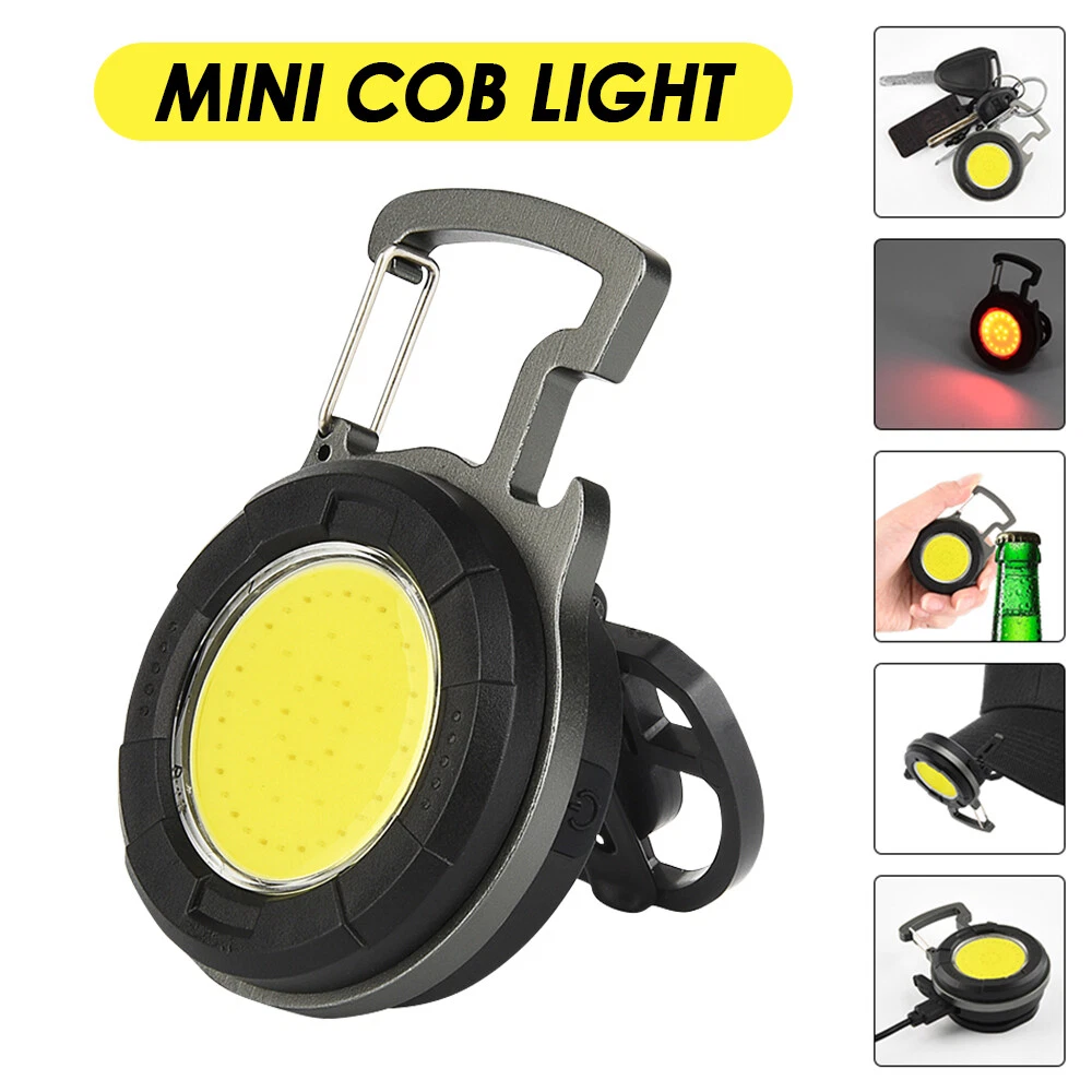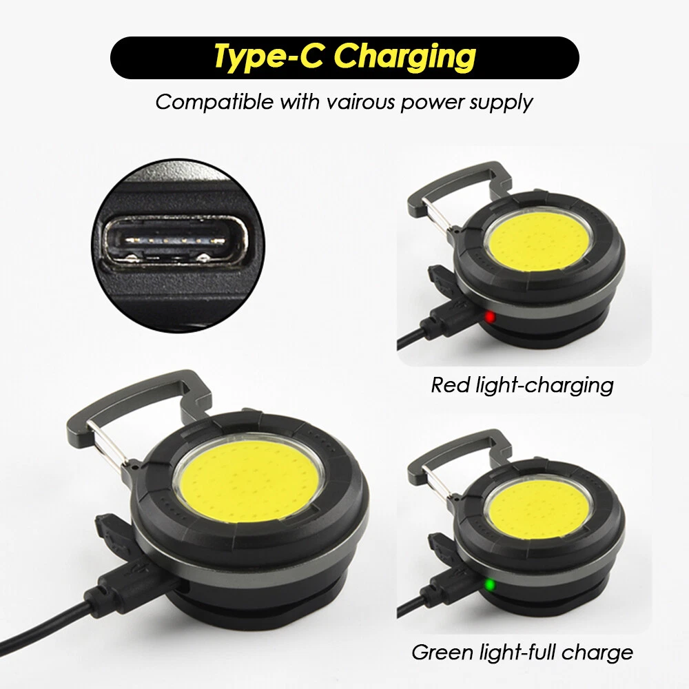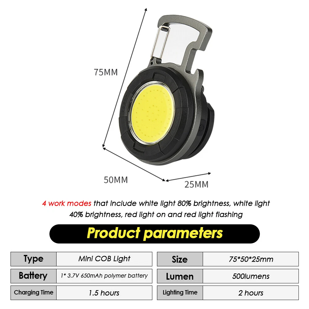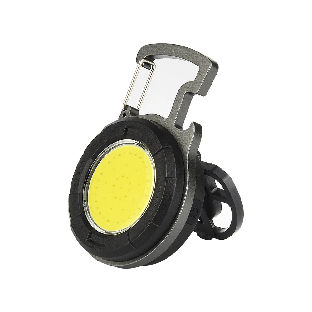 Mini COB Work Light Pocket Lamp Portable LED Flashlight USB Rechargeable Keychain Corkscrew with Magnet 4 Light Modes for Camping Outdoor Fishing Feature: 1. Super Bright COB Light: This keychain LED flashlight provides 1000lumens at maximum. At night, it can create a bright enough environment for you, which is applicable for night fishing, outing, camping, road upkeep, etc. 2. Easy to Carry and Place: Lightweight and equipped with a carabiner, the mini LED pocket lamp can hang in a key chain and be carried anywhere. This small work light of magnetic type can attach to any metal, and 160°adjustable bracket on the back allows you to position the light at different angles or hang it somewhere. 3. 4 Lighting Modes: 4 work modes that include white light 80% brightness, white light 40% brightness, red light on and red light flashing meet your different needs. 4. USB Rechargeable: The keychain flashlight is powered by built-in 650mAh polymer battery, which can light up for 2 hours after fully charged for 1.5 hours. It can be charged by car charger, laptop, adaptor and power bank. 5. More Usage: You can use it as a corkscrew, or a head light by fixing it on your hat. Specification: Type: Mini COB Light Battery: 1* 3.7V 650mAh polymer battery Charging Time: 1.5 hours Lighting Time: 2 hours Lumen: 1000lumens Size: 61*46*21mm Package Included 1/2/4 * COB Work Light 1/2/4 * USB Charging Cable Item Specifics Brand : Unbranded Type : Flashlight Features : Rechargeable, Waterproof, Lightweight, Portable,4 MODES Power Source : USB Voltage : 3.7 V Lighting Technology : LED Color : Black Battery Included : Yes Operating Time : 1-5 Hours Lumens : 1000 lumens Model : Mini cob work light Lighting Technology : LED Color : Black Battery Included : Yes Operating Time : 1-5 Hours Lumens : 1000 lumens Model : Mini cob work light