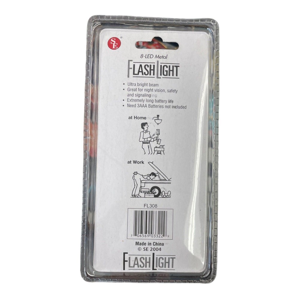 Material:MetalUPC:706569033229Model:FL308Features:HandheldLighting Technology:LEDType:FlashlightVoltage:4.5Operating Time:5-10 HoursMPN:FL308Power Source:BatteryBattery Technology:AAABrand:SEColor:SilverPersonalize:NoCountry/Region of Manufacture:ChinaNumber of Batteries:3gtin13:706569033229