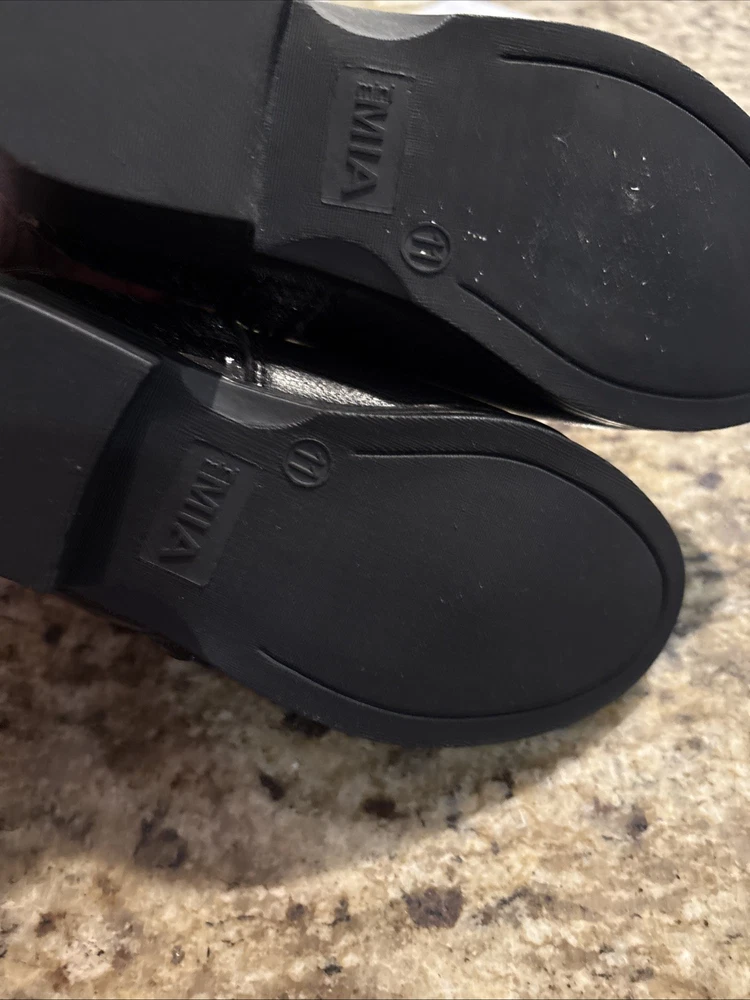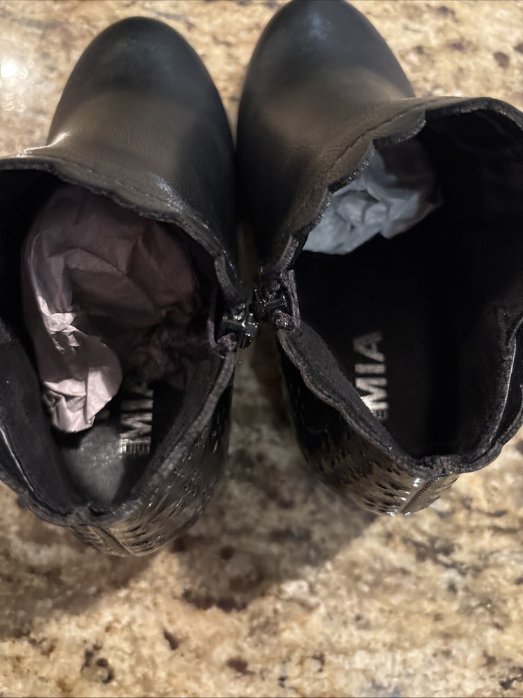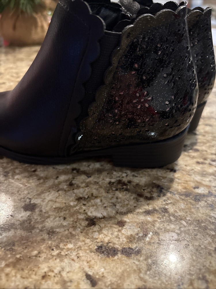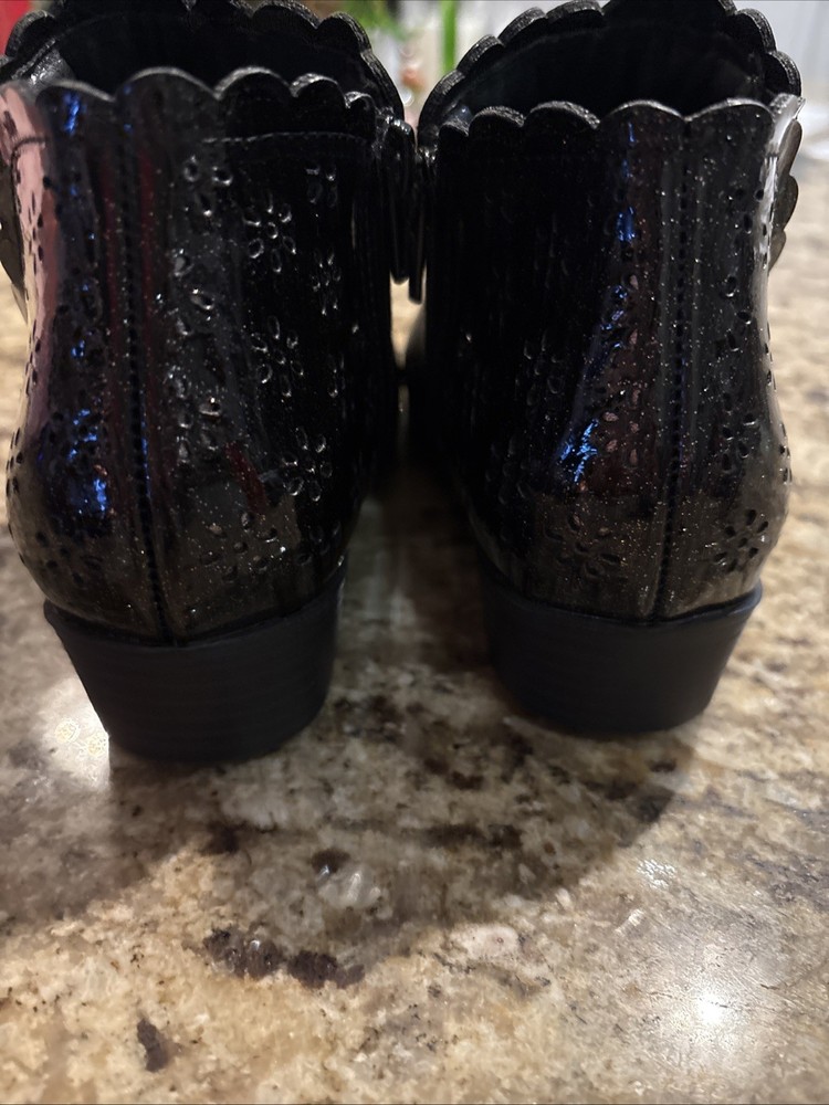 The Mini Mia Girls Lil Chessi Black Tumble Boots in size 11M are stylish ankle boots perfect for casual occasions in the winter and fall seasons. Made of faux leather with a synthetic lining, these boots feature a round toe shape, low heel height, and a zip closure for easy wear. The black color and solid pattern make them versatile for various outfits, while the moderate cushioning level provides comfort for all-day wear. Designed by MIA, these booties are a fashionable choice for girls looking to add a touch of cool to their wardrobe.