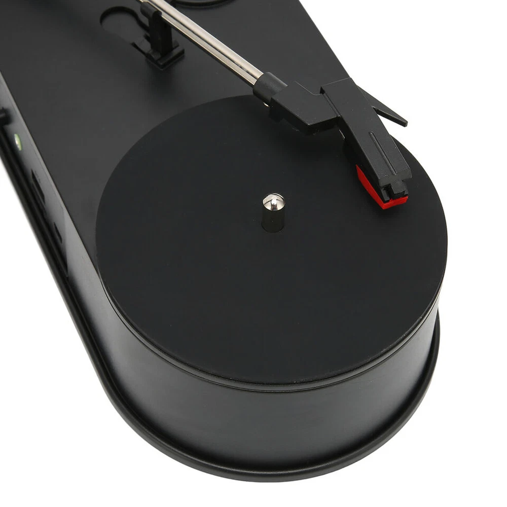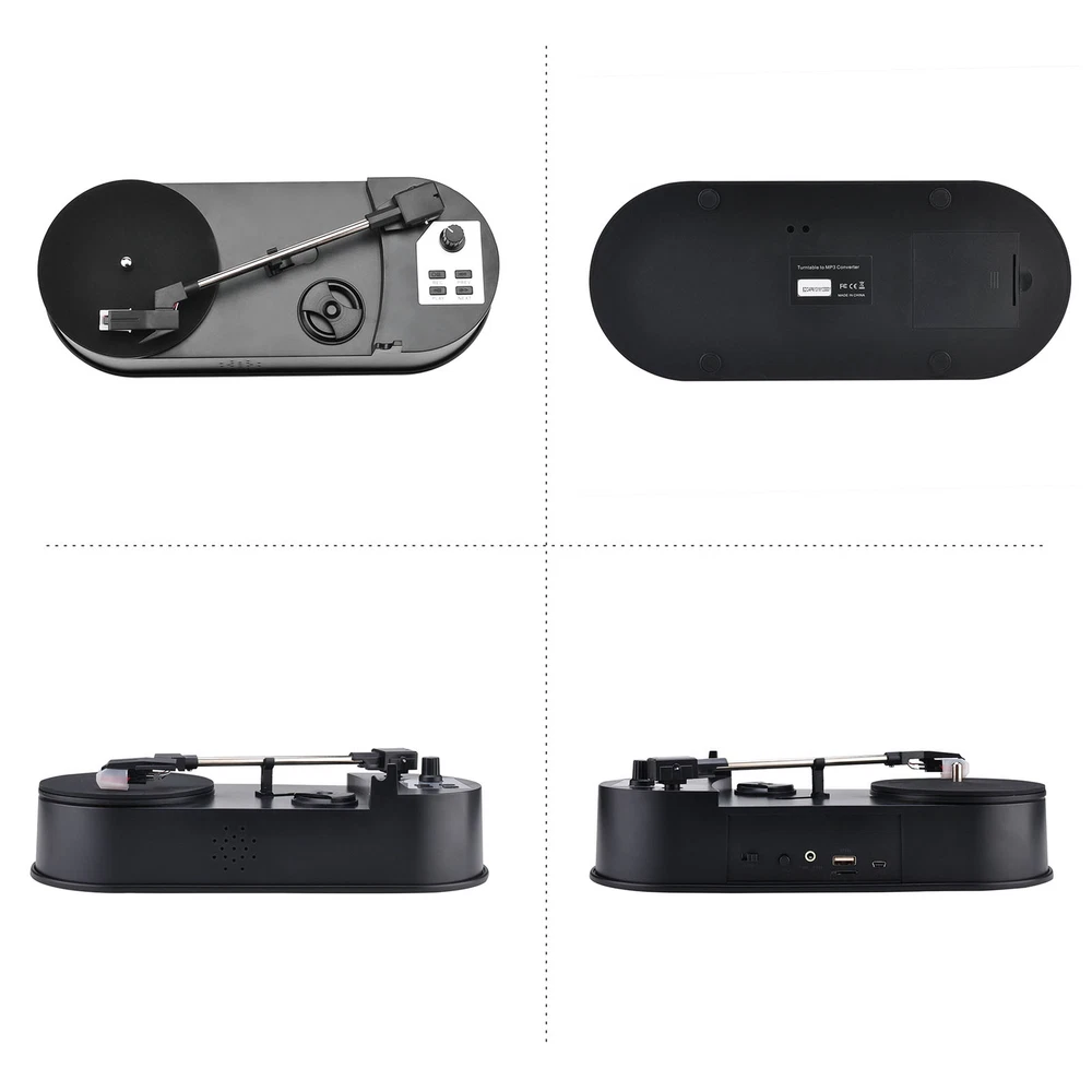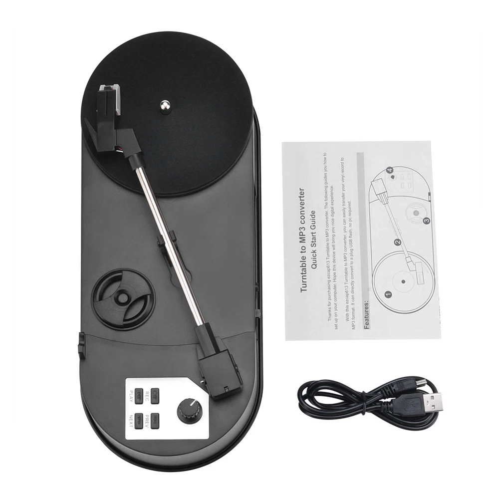 Features: 1.Mini vinyl turntable record player can play records, support LP: 33/45 PRM 2.With this Turntable to MP3 converter, you can easily transfer your vinyl record to MP3 format. It can directly convert to a plug USB flash, no PC required. 3.The USB vinyl to MP3 converter is coupled with playback function so you can easily check the recorded file. 4.Just simply press the recording button then the vintage vinyl player will start to record (convert)the playing music to MP3 format, the green indicator will be quick flashing (if not, means not recording, re-plug your USB flash and try again). Press the recording button again to stop recording and save a MP3 file in USB flash or SD card. 5.Vinyl turntables player is made of high quality ABS material, durable, wear resistant and long lasting. So stable performance and high reliability is guaranteed. Specifications: Connectivity Technology: USB Material: ABS Style: Vintage Color: Black Power Supply: AA battery/ USB Port Packing List: 1 * Vinyl Turntable 1 * Manual 1 * USB Cable