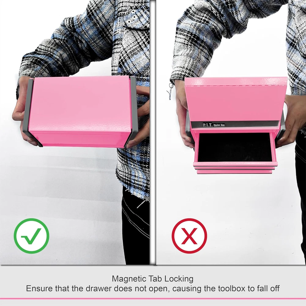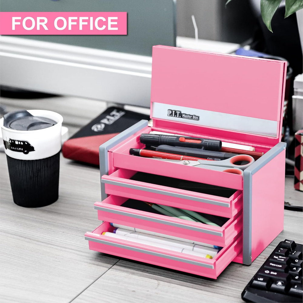 Multiple Storage Mini Tool Box - 8.6 X 4.6 X 4.8 Inches, lightweight and portable design, suitable for your day use. You can also match the 5-Drawer Micro Roll Cab to use together or separately. Please check the size before you place an order. It's a small box, if you mind, please don't buy it Magnetic Tab Locking - The magnetic locking is an easy-to-use locking mechanism that utilizes powerful magnets to lock automatically when you close the lid. The design of tab locking can close the drawer to ensure that your tools do not fall out while you are moving Wide Application - Strong function for home, office, warehouse, jobsites and so on. The micro tool box is suitable for storing small tools and accessories storing various parts like business cards, pens, pencils, paper clips, and much more Smooth Glide 3 Drawers - 3 drawers are equipped and provide a smooth glide operation Equip with Liner - Provides protective moisture barrier between tools and drawer, and protect your tools from rust High Quality Material - This tool box is made of high quality Q235 steel for long-lasting durability. The surface is covered with powder pink paint finish, which is beautiful and easy to clean Product Description P.I.T. MINI METAL TOOL BOX THE SIZE of MINI BOX Wide Application COMPARE WITH TOOL BAG Stackable ToolBox Colorful Tool Box Add to Cart Add to Cart Add to Cart Add to Cart Add to Cart Add to Cart Customer Reviews 4.2 out of 5 stars 1,721 4.2 out of 5 stars 1,721 4.2 out of 5 stars 1,721 4.2 out of 5 stars 1,721 4.2 out of 5 stars 1,721 4.2 out of 5 stars 1,721 4.2 out of 5 stars 1,721 Price $39.99 $ 39 . 99 — $39.99 $ 39 . 99 $39.99 $ 39 . 99 $39.99 $ 39 . 99 $39.99 $ 39 . 99 $39.99 $ 39 . 99 COLOR Pink Red and with Colorful Drawer Red Black White Blue Green DRAWER 3 3 3 3 3 3 3 MATERIALS Q235 steel Q235 steel Q235 steel Q235 steel Q235 steel Q235 steel Q235 steel BOX SIZE 8.6 X 4.6 X 4.8 INCHES 8.6 X 4.6 X 4.8 INCHES 8.6 X 4.6 X 4.8 INCHES 8.6 X 4.6 X 4.8 INCHES 8.6 X 4.6 X 4.8 INCHES 8.6 X 4.6 X 4.8 INCHES 8.6 X 4.6 X 4.8 INCHES MINI BOX ✔ ✔ ✔ ✔ ✔ ✔ ✔ Different type for your choice
