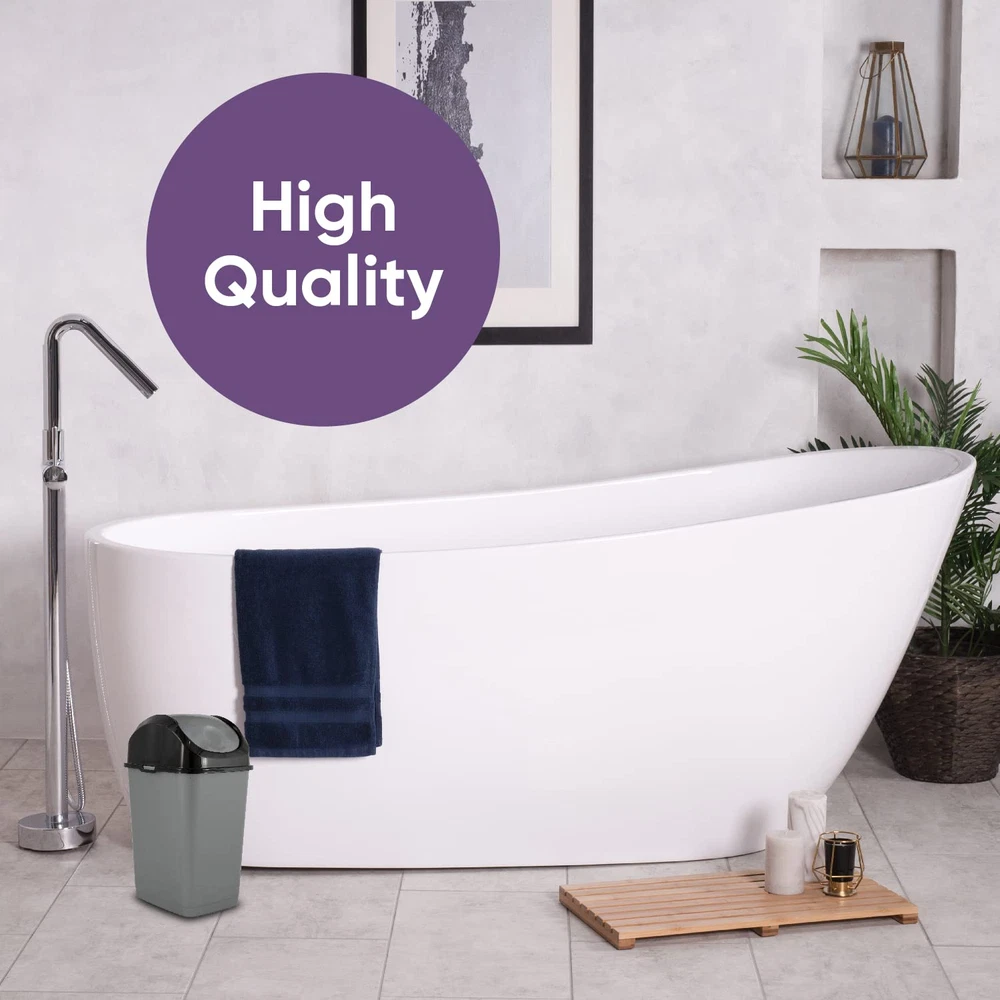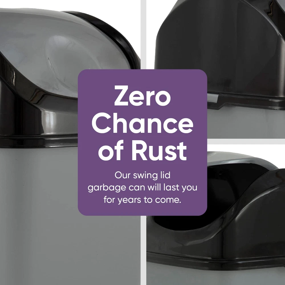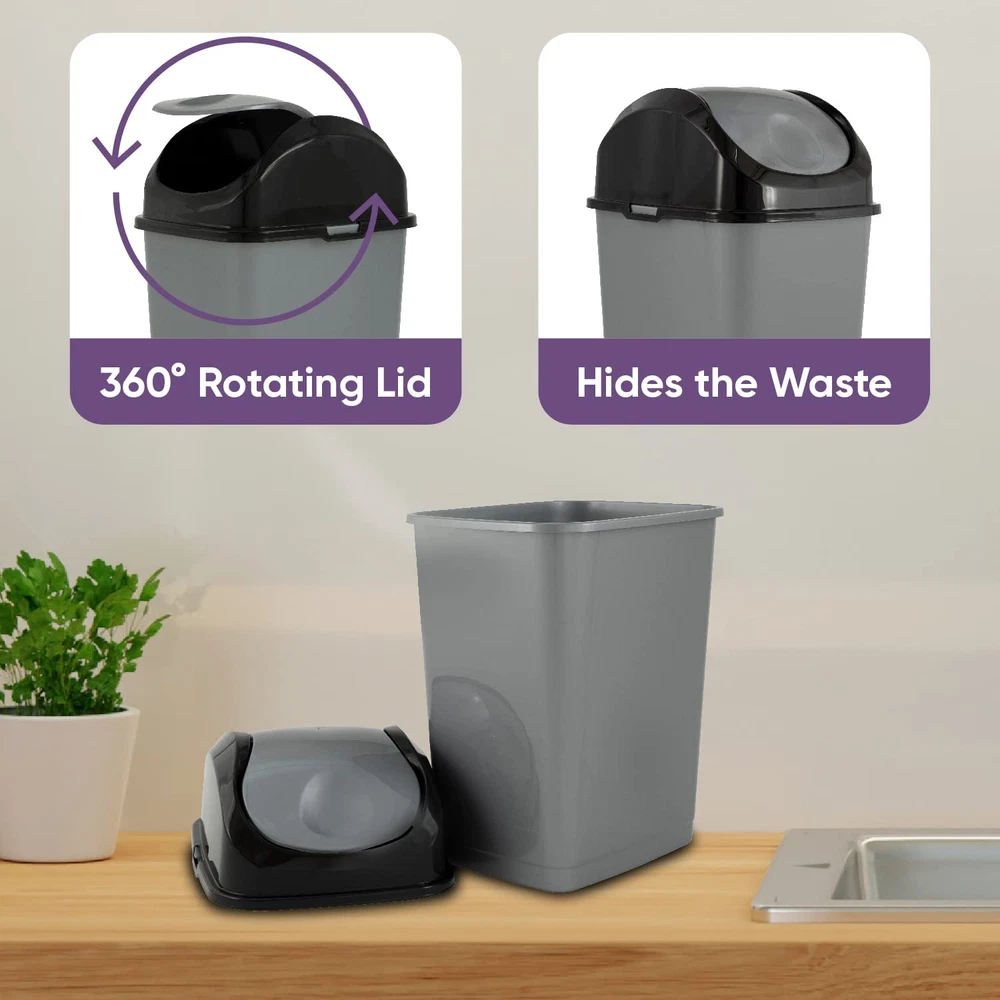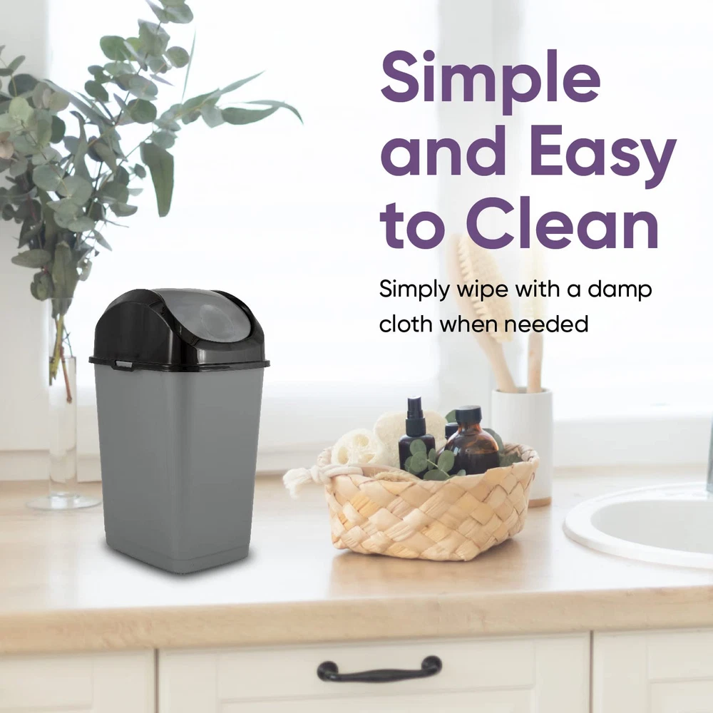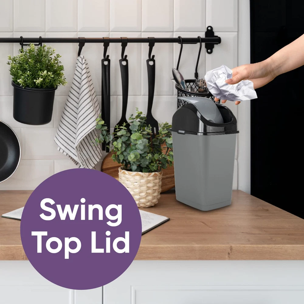 (PAY ATTENTION TO SIZE): There is no space too tight for this tiny miniature waste bin, measuring 8 x 7 x 5.5 inches. Capacity: 1.25 gallon, 5 Qt TOP QUALITY - This extra mini trash can is sturdily built with the highest quality plastic. Ideal for a heavily used tiny waste can or storage bin. EASY TO CLEAN: This mini waste can has no chance of rusting making it waterproof, hassle-free to maintain, and clean with water. VERSATILE BIN: Use this trashcan to dispose of peels, dirt, lint, papers, and tea bags, or to store small stuff such as crafts, tools, cleaning supplies, and more… LIGHTWEIGHT and COMPACT - This portable wastebasket is mini and very lightweight so it can easily be carried from your car to work and back home. Product Description Swing Top Lid you don't have to work hard and open the cover of your trash can just use this easy swing lid which is really practical and closes right away thus keeping all the trash out of sight. High Quality This high quality slim Waste Bin is especially designed to fit "narrow areas" and is a great space saver. It offers a easy to use swinging cover that opens smoothly from both sides, a classical design and shape . Zero Chance of Rust Unlike stainless steel trash cans, this durable and high-quality plastic garbage can, will never rust! Our swing lid garbage can will last you for years to come. Easy To Clean The trash can is made of durable plastic that is strong and easy to clean – simply wipe with a damp cloth when needed