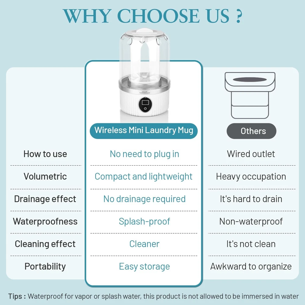 Underwear Washer, Portable Rechargeable Mini Washing Machine for Underwear 【Ultra-Light Travel Washing Machine】 Weighing only 1.3 lbs (lighter than competitors!), this mini portable washing machine features food-grade PP material for hygienic cleaning. Perfect as an underwear washing machine for delicates or travel washing machine for RVs/campers. Stores vertically in tight luggage spaces. Note: Spin-dry function not included. 【Gentle Hand-Wash Simulation】 Patented 360° dual-roller scrubbers mimic hand-washing motions (40% gentler than traditional machines). Designed specifically as a baby clothes & socks mini washer, with enhanced stain removal for bras, underwear, and sensitive fabrics. 【Space-Saving Portable Design】 Fits under beds, dorm closets, or carry-on luggage. 1.0L capacity occupies 65% less space than standard portable mini washing machines. Includes foldable handle for effortless transport. 【Long-Lasting Rechargeable System】 3000mAh battery delivers 50 mins effective runtime (Pro Tip: Pause 10 mins after 20 mins of use). Two smart cycles: Quick 5-min rinse or deep 10-min clean. USB-C fast charging included. 【24/7 Customer Support Guarantee】 Contact our US-based team anytime for issues with your mini washer. 100% satisfaction guarantee with replacement/refund within 30 days. Response in <12 hours!