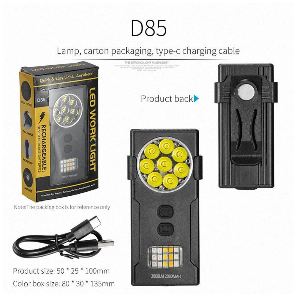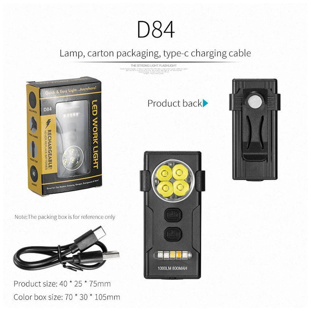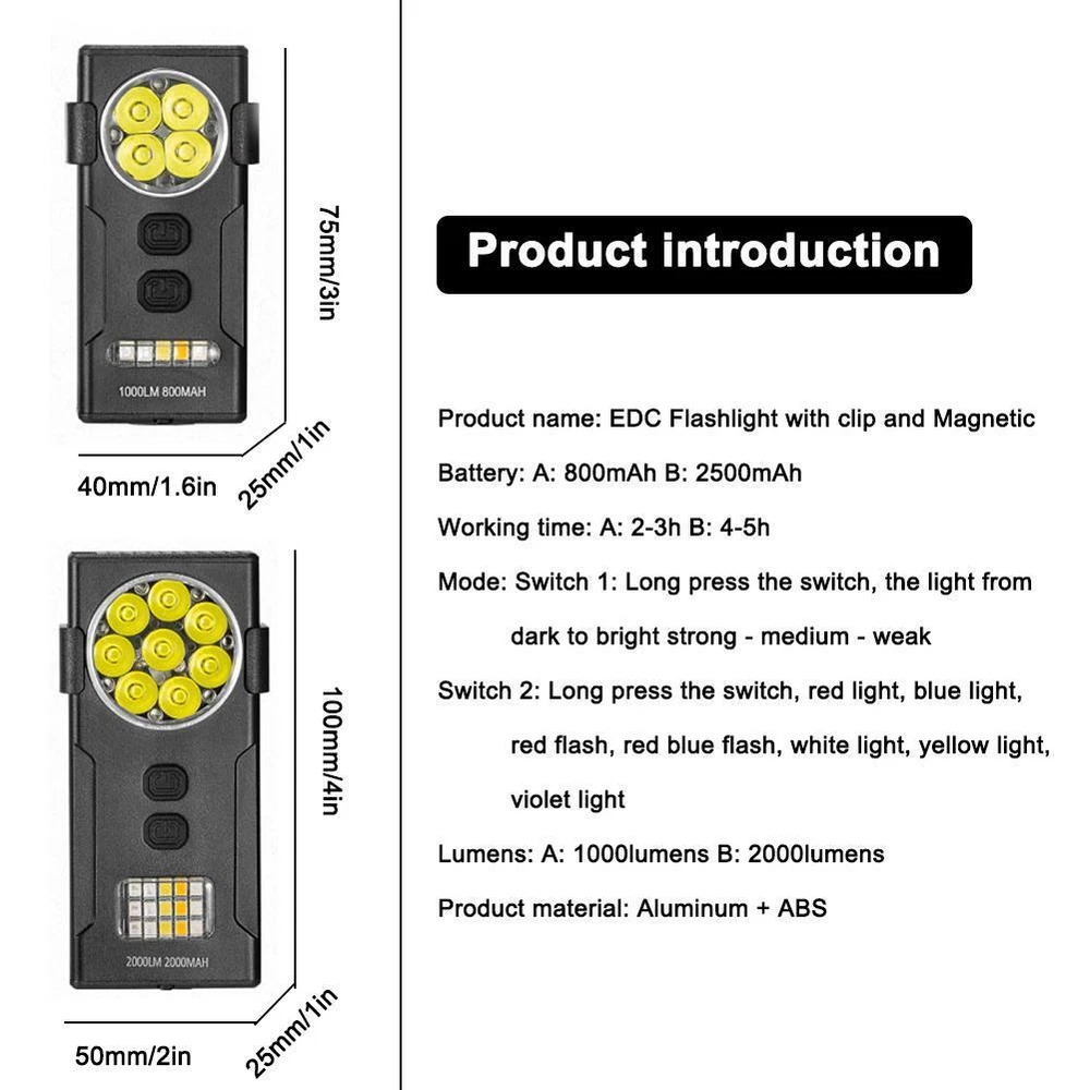 Description Description&Preview shipping&policy Description: Product name: EDC Flashlight with clip and Magnetic Product size: A: 40*25*75mm/1.6*1*3in B: 50*25*100mm/2*1*4in Battery: A: 800mAh B: 2500mAh Working time: A: 2-3h B: 4-5h Mode: Switch 1: Long press the switch, the light from dark to bright strong - medium - weak Switch 2: Long press the switch, red light, blue light, red flash, red blue flash, white light, yellow light, violet light Lumens: A: 1000lumens B: 2000lumens Product material: Aluminum + ABS Product features: 1. EDC Keychain Light: Conveniently attachable to your keys for easy access. 2. Type-C Rechargeable: Utilizes Type-C charging for quick and convenient power replenishment. 3. Outdoor Warning Light: Equipped with a bright light for outdoor warning and signaling. 4. Magnetic Suction: Features a magnetic base for hands-free use or attachment to metal surfaces. 5. Multi-functional Design: Includes an integrated bottle opener and detachable pen clip for versatility. Precautions: 1. As we all know , the different computers display colors differently, the color of the actual item may vary slightly from the following images. 2. If you feel difficult to choose the size, you can feel free to contact me we will give you some suggestion, but it is for you reference only. Package includes: 1 pc Flashlight Preview: Thank you for your purchase Problems? You can follow below process to contact us. There is a time zone difference,but we will do our best to quickly response to your questions: Shipping ● We will arrange shipping for you within 24 Hours after payment cleared except the holidays. ● We always send the item to the address you give us on Payoneer to ensure the security of the item. If you have changed your address, or want us to ship to another address, please change to the new address when you pay us with Payoneer, otherwise we will not be responsible if the package is lost. Payments We accepts Payoneer only If you have any questions about the payment,please contact us through eBay message. Import Duties In case some duty is due Upon delivery, it is your responsibility to meet that expense and this may cause delays to delivery schedule and you may have to pickup goods at the customs office. Terms & Conditions By bidding on this item,the Buyer agrees to all of the terms and conditions as outlined in this listing .please ensure to read and agree to All eBay terms and Conditions before bidding. All pictures are for illustration purpose only and Colours may vary slightly. Our store obeys all eBay Rules and Policies. Returns Policy To Return an item you must contact us and take photos of your item to clearly show any damage or unusual aspects of it. Approved returns will be subject to inspection on arrival. Items must be returned in original condition with all original packaging. All shipping and handing charges are non-refundable Return delivery costs are the responsibility of the buyer. We will cover the cost if sending replacement/repaired items. Within 7 days after receiving your products, we offers a no-hassle 7 day exchange/replace only if your items are found to be defective by manufacturer.