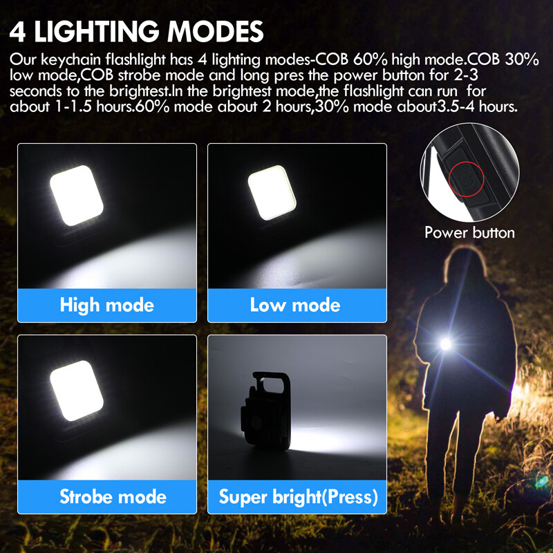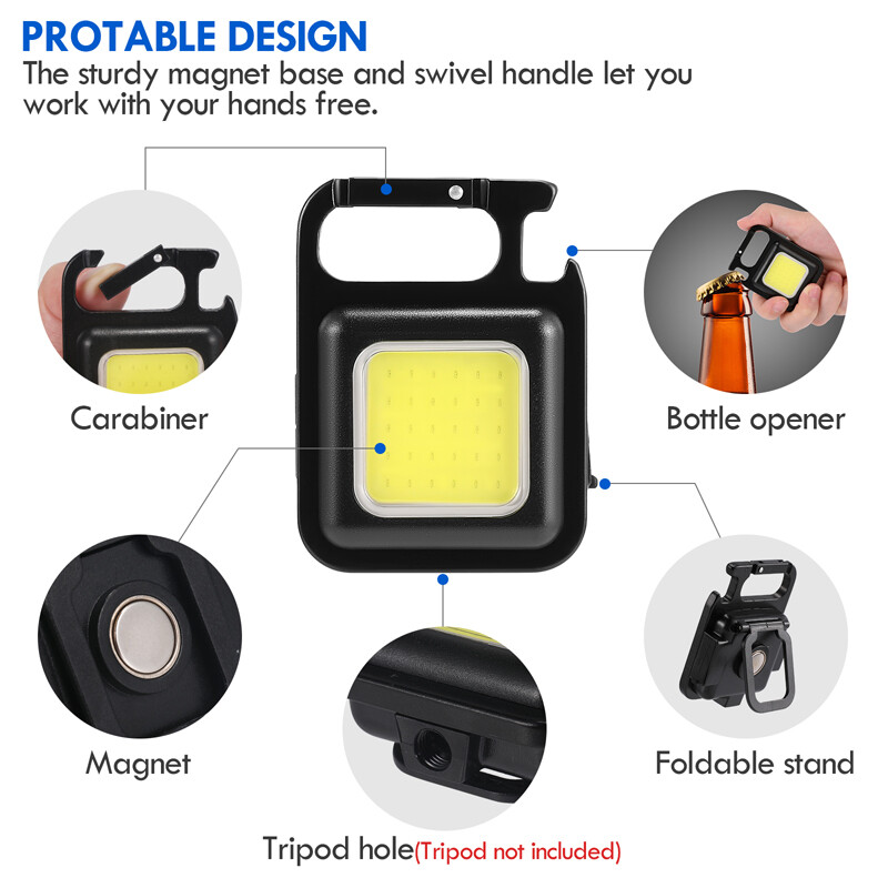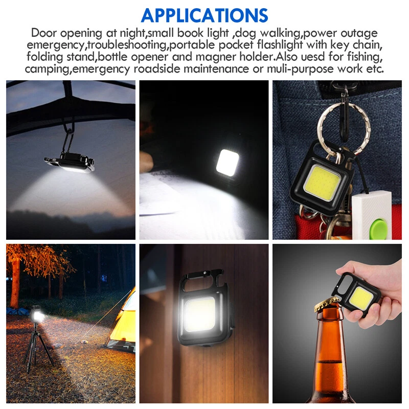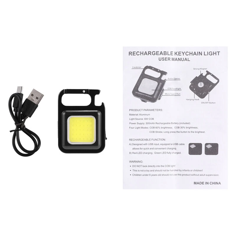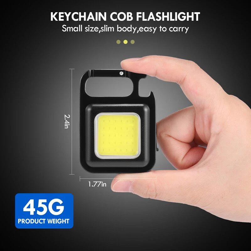 Mini COB LED Keychain Work Light Flashlight Pocket Torch Rechargeable Hiking SOS Mini COB LED Keychain Work Light Flashlight Pocket Torch Rechargeable Hiking SOS 100% Brand New & Excellent quality Free & fast shipping, with tracking number provided Feature: * 4 Lighting Modes: The keychain light has 3 lighting modes: Cob high/low/strobe mode, long press the power to turn on to super bright mode, you can adjust the lighting mode according to your usage needs. * Super Bright COB Lamp Beads: The keychain light uses a powerful LED with 30 super bright COB lamp beads, which can provide up to 950 lumens of illumination, enough to illuminate your roads and small dark spaces. * Portable Design: This keychain light has a small magnet on the back, which can be strongly attached to the metal, small in size, easy to carry, and has an adjustable stand and a tripod hole, which not only frees your hands when working, it can also be placed at different angles or hung in specific positions. * USB Charging: The keychain light is powered by a built-in 500mAh battery, the lighting time can be up to 4 hours, and the included USB charging cable can be used with portable power devices such as computers, laptops, car chargers, wall chargers and power banks , a red light is displayed when charging, and a green light is displayed when fully charged. * Widely Used: The portable keychain light has a hook and loop, which can be easily fixed on the key ring or bag, with IPx4 waterproof function and impact resistance, it can also be used as a bottle opener, it can also be used as maintenance light, work light and outdoor camping emergency light. Specification: Product name: Multifunctional keychain light Colour: Black Light color: white Material: aluminum alloy + PC plastic Voltage: 3.7-4.2V Lamp beads: COB Irradiation distance: 0-50m Waterproof: IPx4 Power: 5W Brightness: 800lm Battery life: 1-3 hours Light source: 6W 30 COB lamp beads Lighting time: 4 hours (highlight 1.5 hours) Lighting mode: 60% strong light - 30% weak light - flashing (long press to turn on super bright mode) Function: bottle opener, emergency light, work light, inspection light, magnetic suction Battery: Built-in 500mAh polymer battery Charging port: USB Type-C Product size: 61*45*27mm/2.4*1.77*1.06inch Package size: 95*55*28mm/3.74*2.17*1.10inch Package include: 1 x Multifunctional Keychain Light 1 x USB Charging Cable 1 x Manual 1 x Packing Box Payment Shipment Return Feedback Contact us Payment * We Accept Payment via PAYPAL ONLY . * Payment Must be Made within 4 Days of Auction Closing. * Non-Payment may Result in a UPI (Unpaid Item) being Put on Your Account. eBay will Automatically Close Your Account if You Accumulate 4 UPI's total. * Please List Your Special Requests ( Color, Size, Packages, etc. ) in the PAYPAL NOTES SECTION when you make payment. Shipment * Shipping will be handled in 24 business hours after payment got. Ship to PayPal Address only , please confirm it before paying. * Please leave your phone number in the address in case there is an address problem. Return * Returns and Exchange accepted within 60 Days. * Refund will be given as Money Back. * Free Return shipping. * Before you return the defective item,please email us for the RMA, and we will reply you in 24 hours in working days. If you do not get reply please check if your mail box has refused our reply or not, then send to us again, thanks! Feedback If you are satisfied with the transaction please remember to leave us a positive feedback (5-Star) will be much appreciated. Please DO remember to contact us before leaving the neutral (3 stars) , negative feedback (1-2 stars) or opening a case/dispute if any problem caused by the item . Normally your email would get replied within 24 hours on working day and your issue would be followed up carefully until we've reached a consensus! We will try our best to solve the problem and leave you a happy shopping mood here. Thank you! We are not only selling good items, but also selling with excellent after-sale service and a strong sense of responsibility. We will always try our best to find you a satisfactory solution if any problem takes place! Contact us Email muchbuy-outlet at Paypal registered email or ebay message.