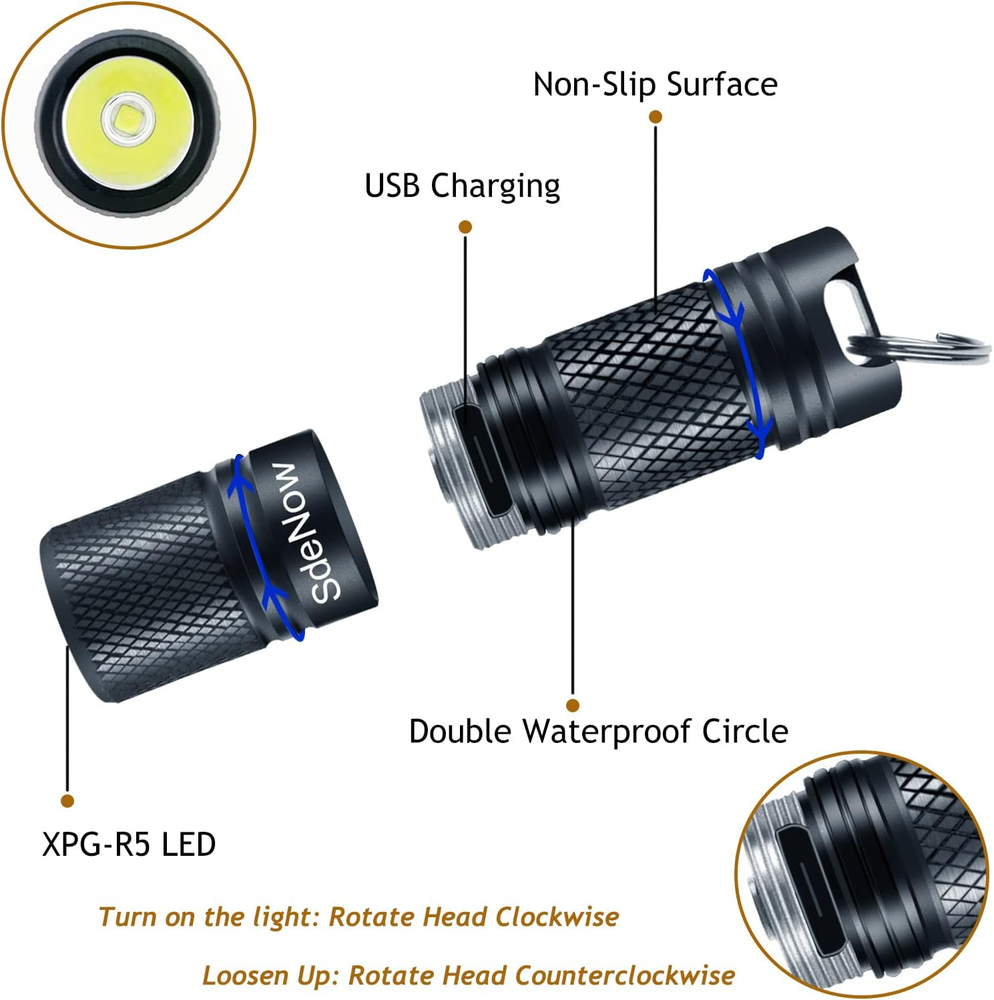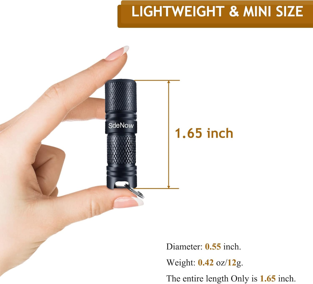 [Shockproof, waterproof, anti-pressure]: Screw port link design, you can easily hang the flashlight on the keychain, do not worry about rotating the switch head off, titanium material IPX-7 waterproof can be used in storms. [Rechargeable LED flashlight]: It can be charged quickly through the built-in Micro-USB charging port (charging time: 0.5 hours, working time: 2 hours) [Easy to operate, easy to carry]:The pocket flashlight is 2/3 (1.65 in) the length of a key, and you can control on/off and output changes by twisting the head of the flashlight. [High Lumen]:With a beam distance of 50-100 meters and up to 200 lumens, it can meet the needs of personalized carrying, anytime, anywhere lighting and practicality. [Multi-scene application]:EDC flashlight with high brightness can be used for camping, hiking, power outage, emergency, general purpose, daily carry, backup, car, home, outdoor, indoor reading, etc. Product Description This is a multi-performance and easy-to-carry keychain flash in your life. It has features of shockproof, waterproof, rechargeable and high lumen, and only 2/3 (1.65 inch) of your key length. SPECIFICATIONS : Power Source: Battery, USB Battery Type: 10180 (included) Waterproof: IPX7 (2 Meters) Body Material: Titanium alloyy Switch Type: Rotary Switch Package Contents: 1 x Micro usb flashlight (10180 battery included) 1 x USB cable 1x metal gift box