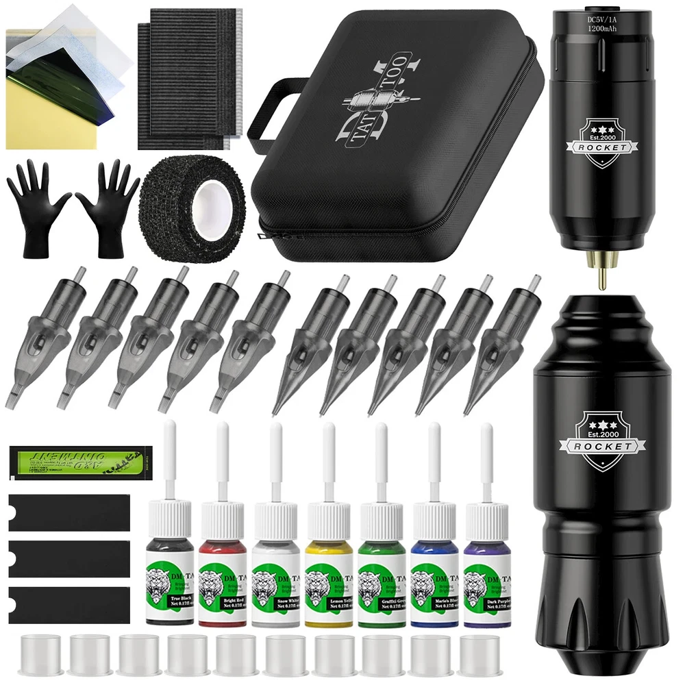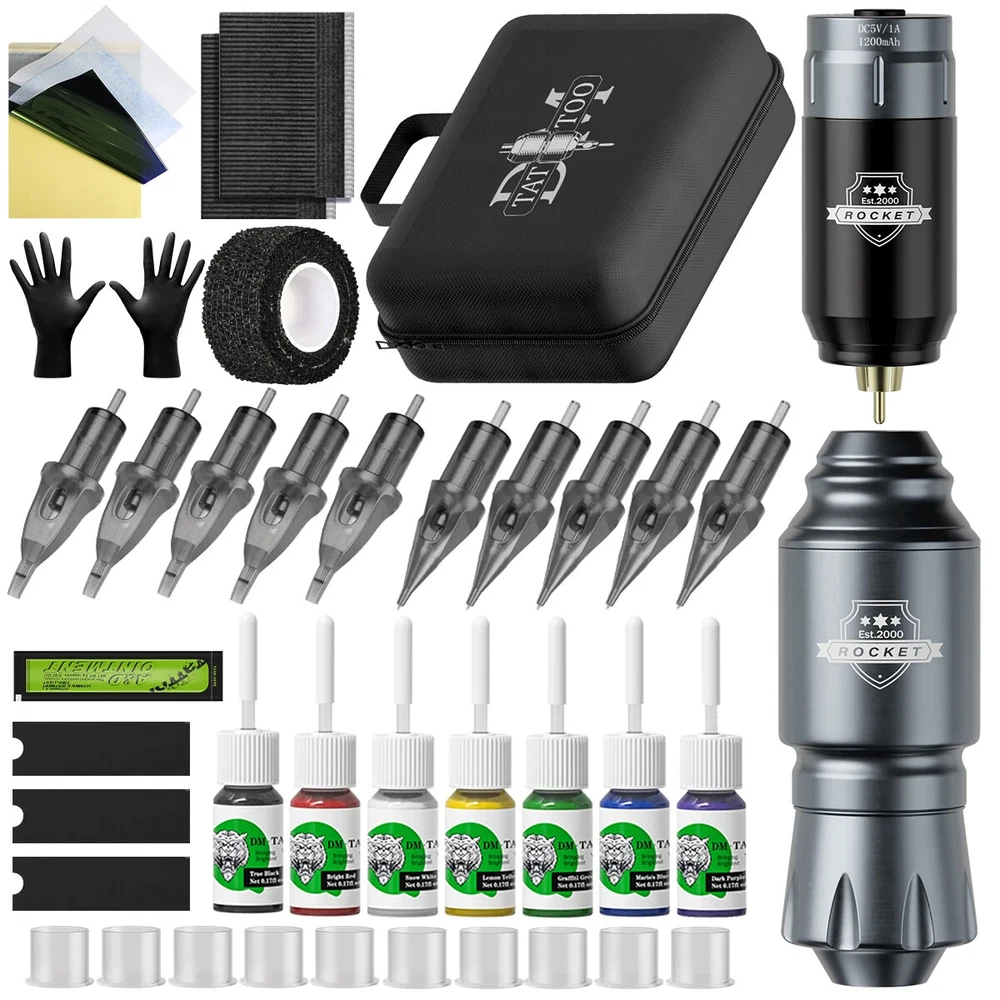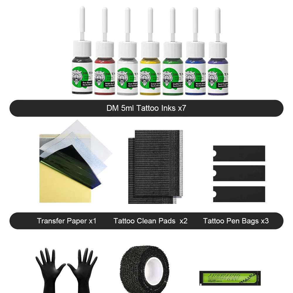 Tattoo Pen Kit Accessories List: 1、Rocket mini tattoo pen 1pcs(for lining and shading) 2、Wireless mini tattoo power supply 1pcs 3、DM Tattoo Cartridge Needles Mixed 10pcs(1201RL 1203RL 1205RL 1207RL 1205RS 1207RS 1209RS 1205M1 1207M1 1209M1; 1pcs/size) 4、Tattoo machine pen connecting line 1pcs 5、Wireless tattoo battery charging line 1pcs 6、DM 5ml premium tattoo ink 7bottles 7、Tattoo repair cream 1pcs 8、Black disposable gloves 1pair 9、Medium tattoo ink caps with base 10pcs 10、Tattoo transfer paper 1pcs 11、Black self-adhesive bandage 1pcs 12、Tattoo machine pen sleeves 3pcs 13、Tattoo table clean pad 2pcs 14、Tattoo machine pen kit manual 1pcs