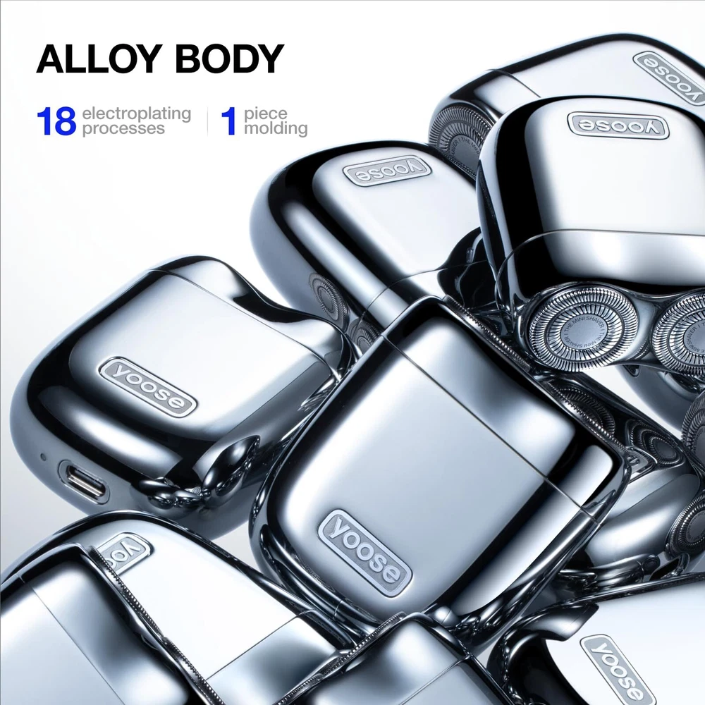 ALLOY MINI SHAVER - trendy portable alloy mini shaver 2.0 is here. Comprehensively upgraded to enhance your shaving experience. One-piece molded ALLOY body, 18 plating process to restore the mirror metal texture. Rounded shape for comfortable grip. TRAVEL SIZE, MINI PORTABLE - Shave on the go, shave whenever. Mini portable travel shavers are the hallmark of . Home, travel, office, or keep it in the car for emergencies. For easy carrying and storage, the electric shaver for men comes with a storage leather case. RECHARGEABLE LI-ION BATTERY - The USB-C rechargeable shaver is equipped with a fast-charging Li-ion battery. Integrated dual battery cells with power endurance algorithm optimization. No more power anxiety. 400 mAh battery capacity, 1-hour charge for 30 days shaving. *Use for one minute a day for 30 days. WATERPROOF AND WASHABLE - Tested and certified IPX7 waterproof, the entire unit is washable (IPX7 means the shaver can be submerged in fresh water up to one meter deep for up to 30 minutes). Easily clean your men's electric shaver by removing the shaver head and rinsing with water to remove beard debris. The shaver works in wet and dry conditions, allowing you to shower and still use it. SUPERIOR SHAVING SYSTEM - Double-ring curved mesh. 0.1-micron facial fit. SMOOTH silky responsive design. 100,000 shaves per minute. 8000 rpm motor. Travel lock feature. Every feature upgrade is designed to keep you satisfied with electric razor. Get a clean shave in comfort.